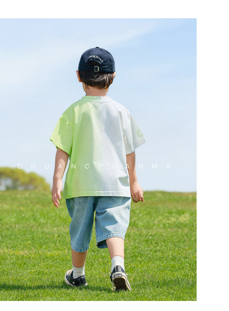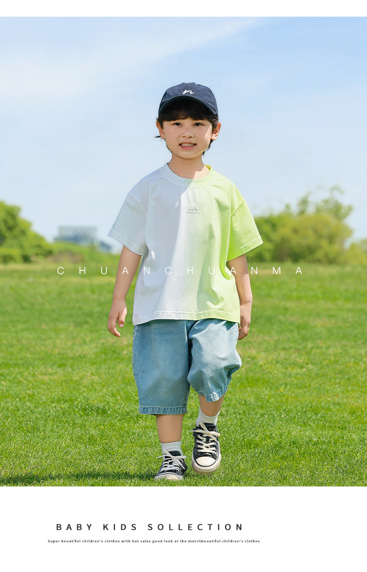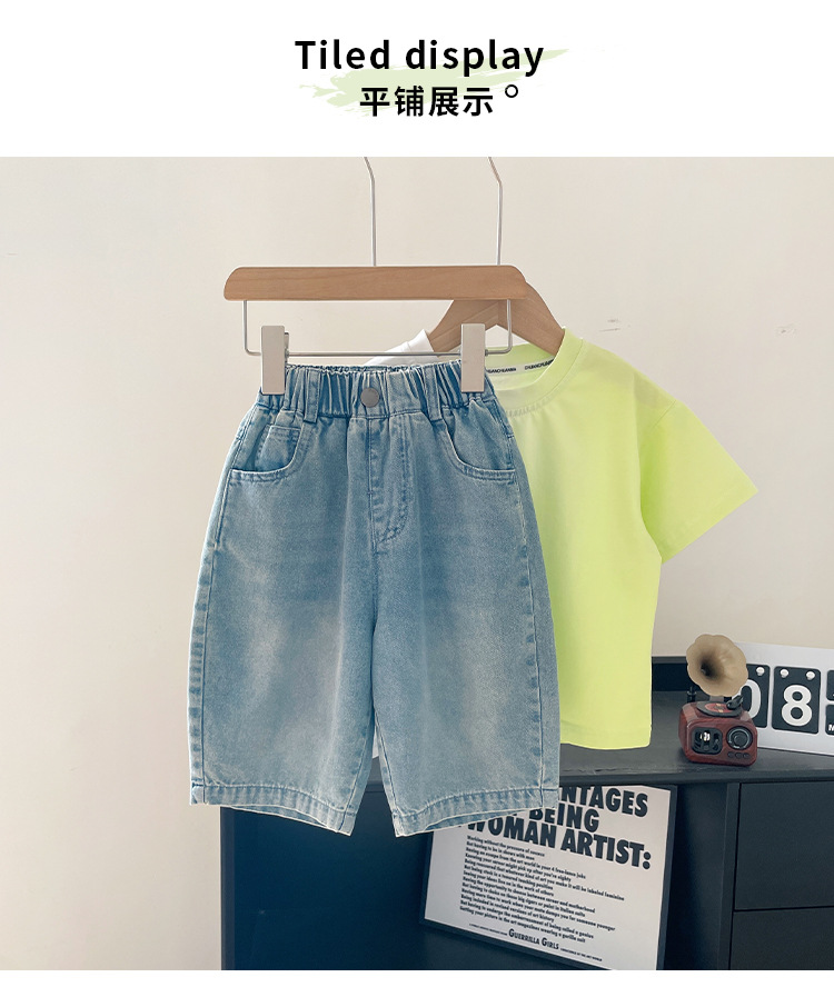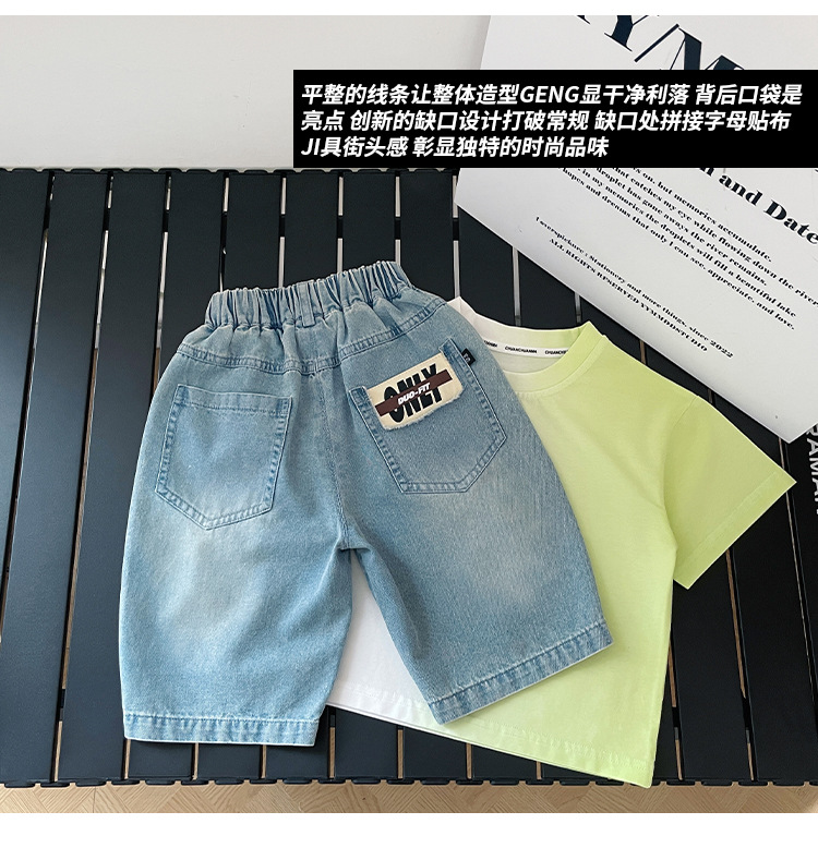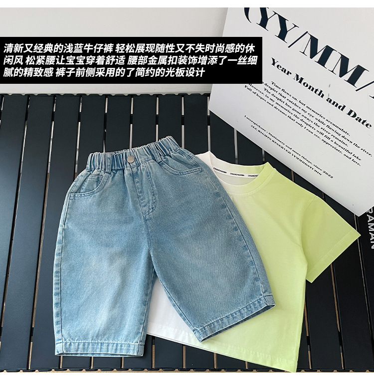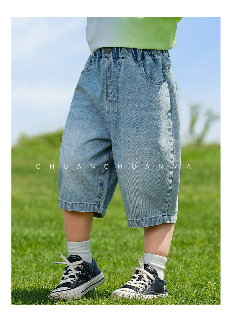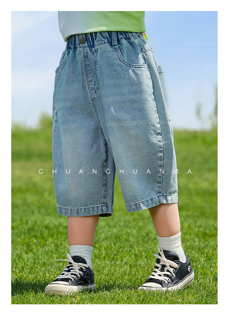 바람의 계곡 2025 새로운 여름 아동 바지 아동 한국어 버전 라벨 포켓 데님 반바지 소년 잘 생긴 크롭 바지