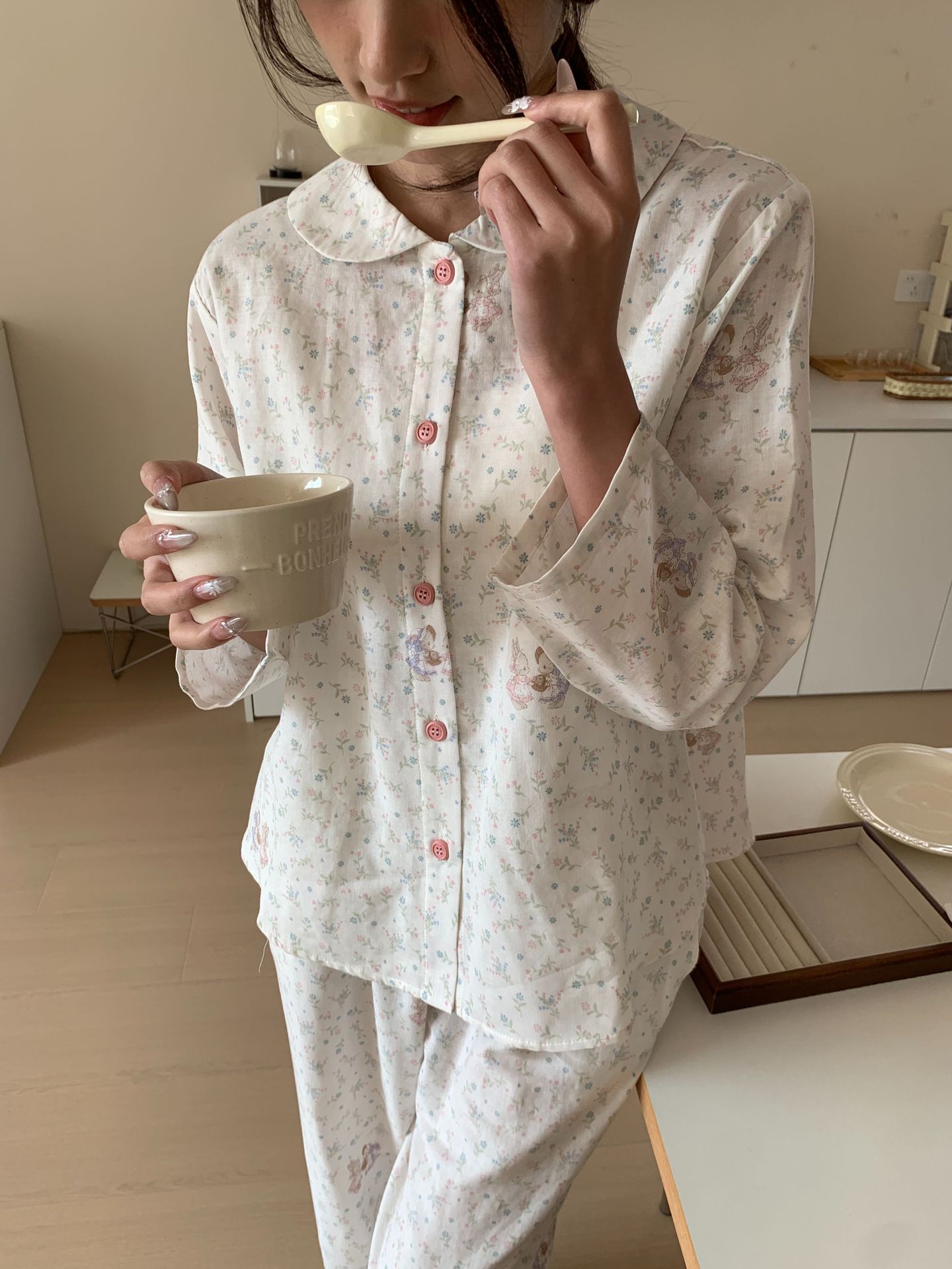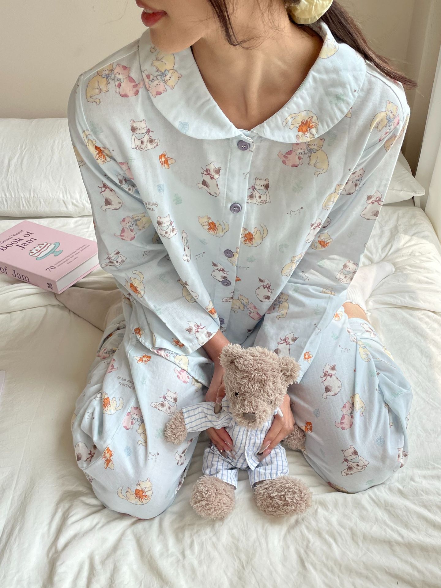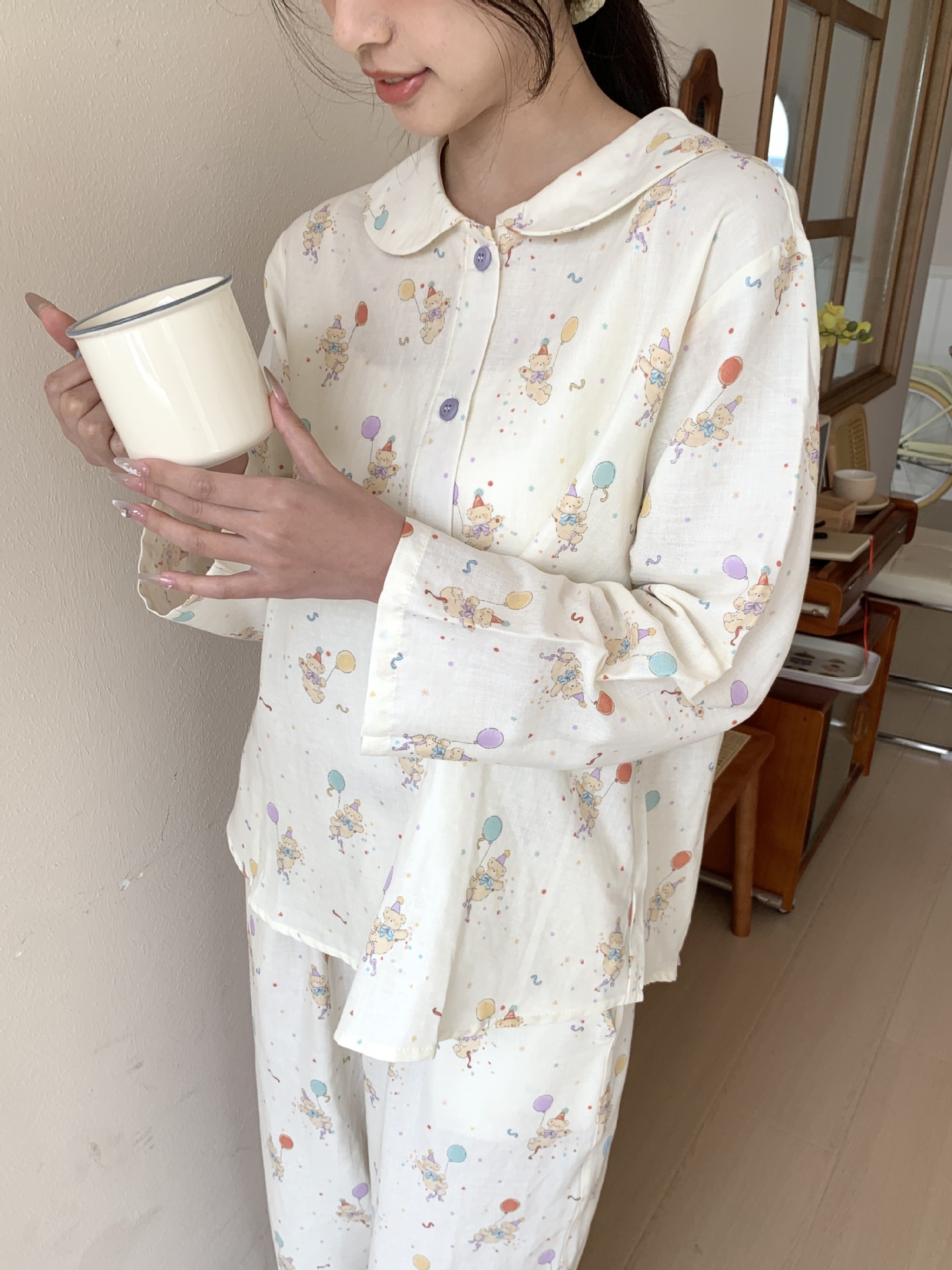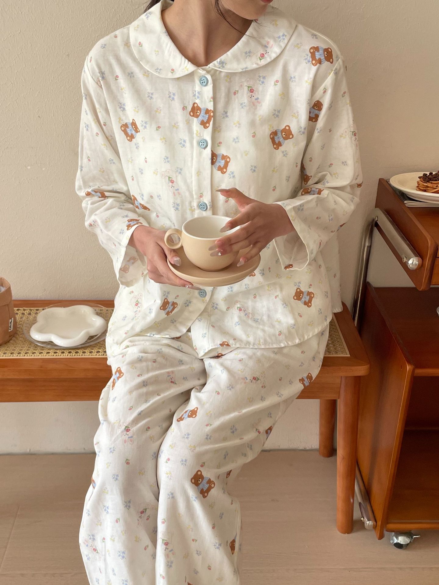 25 인치 스타일 통기성 홈 파자마 작은 옷깃 여성용 간단한 퓨어 코튼 더블 레이어 원사 파자마 홈 의류스토어 가기
