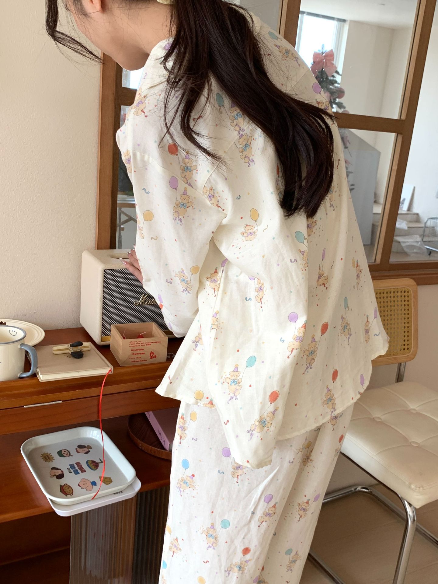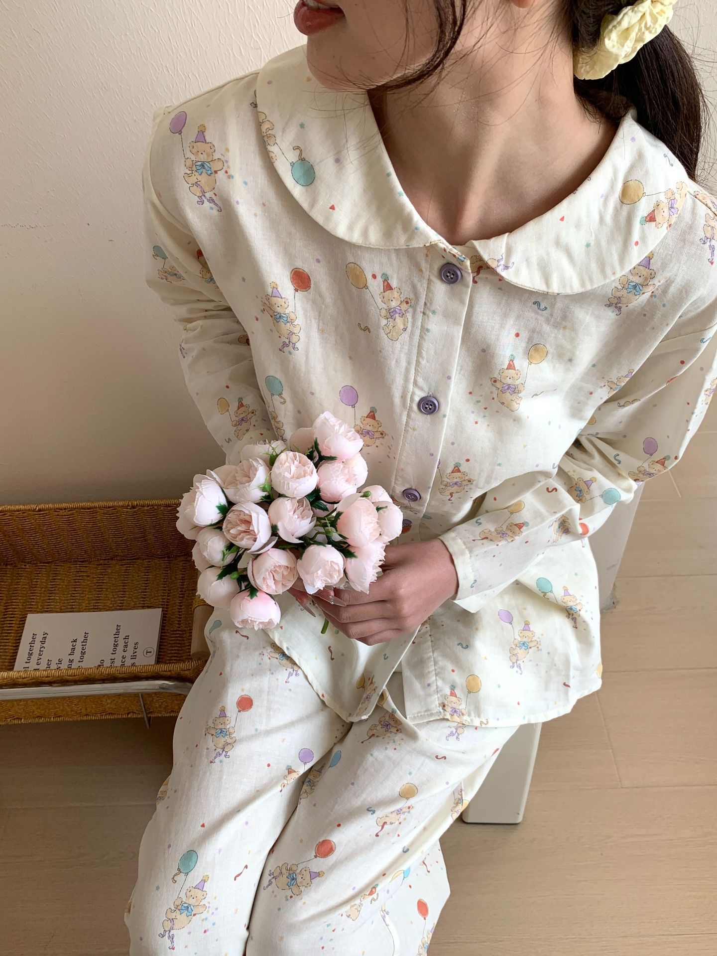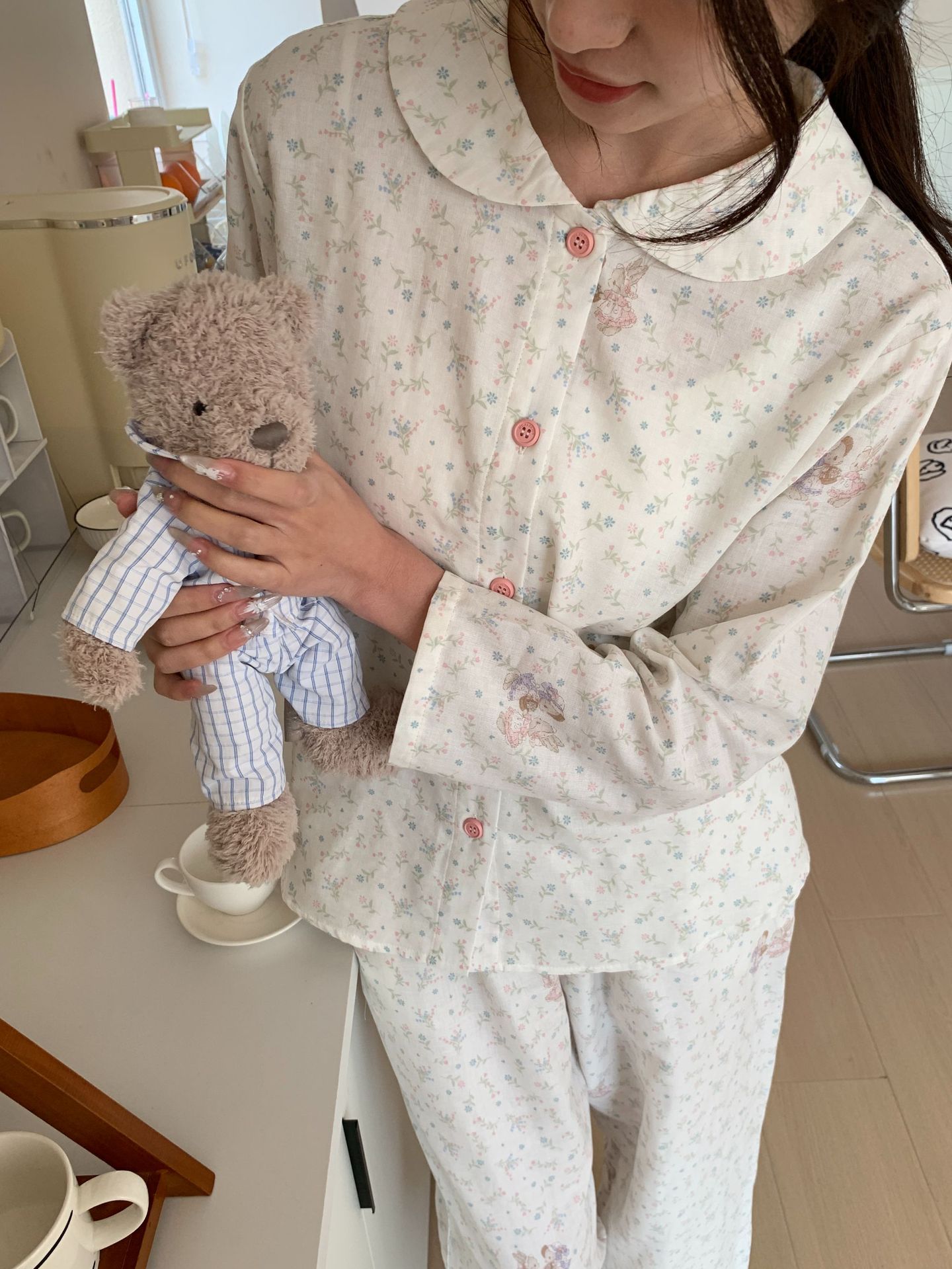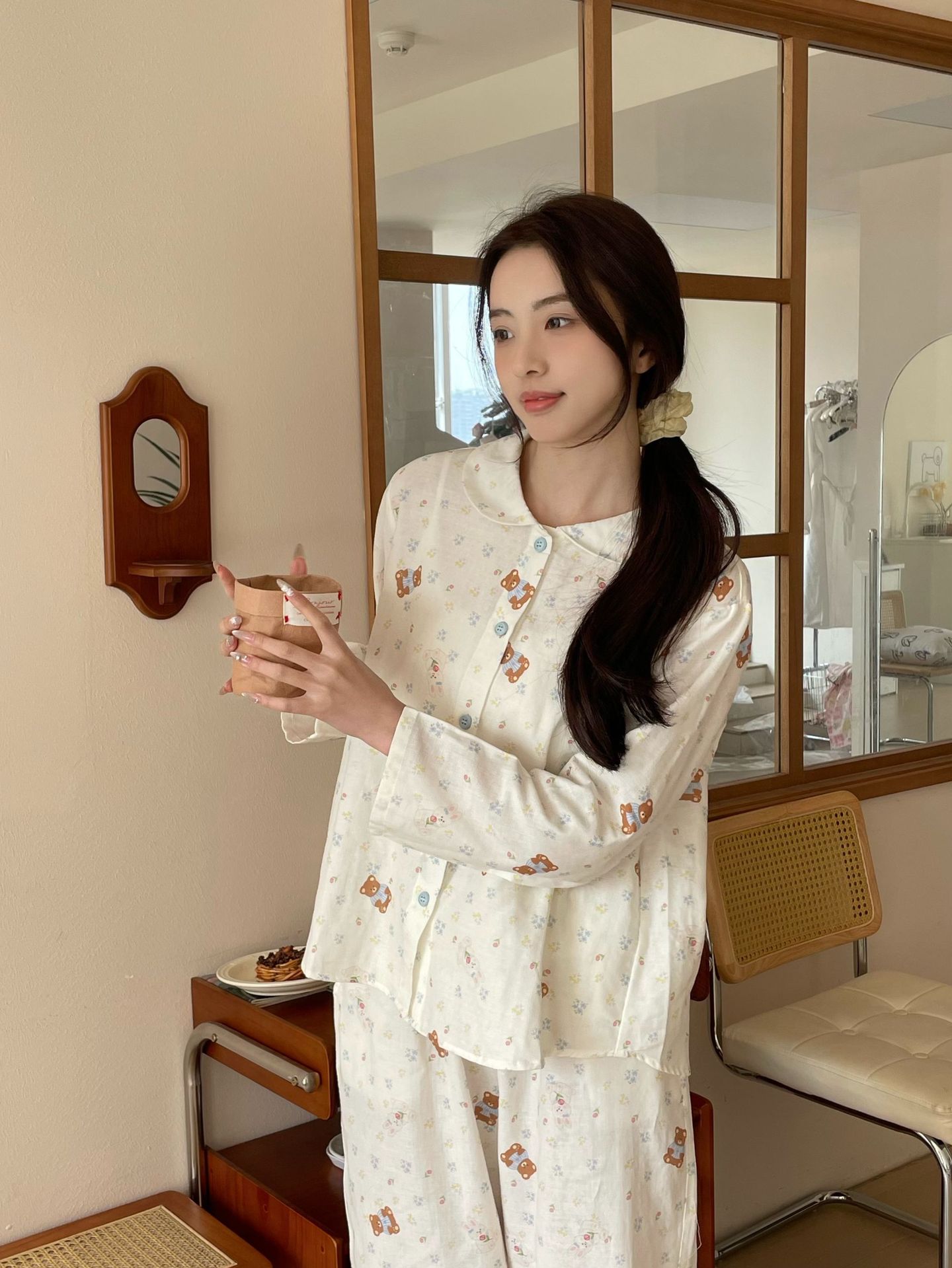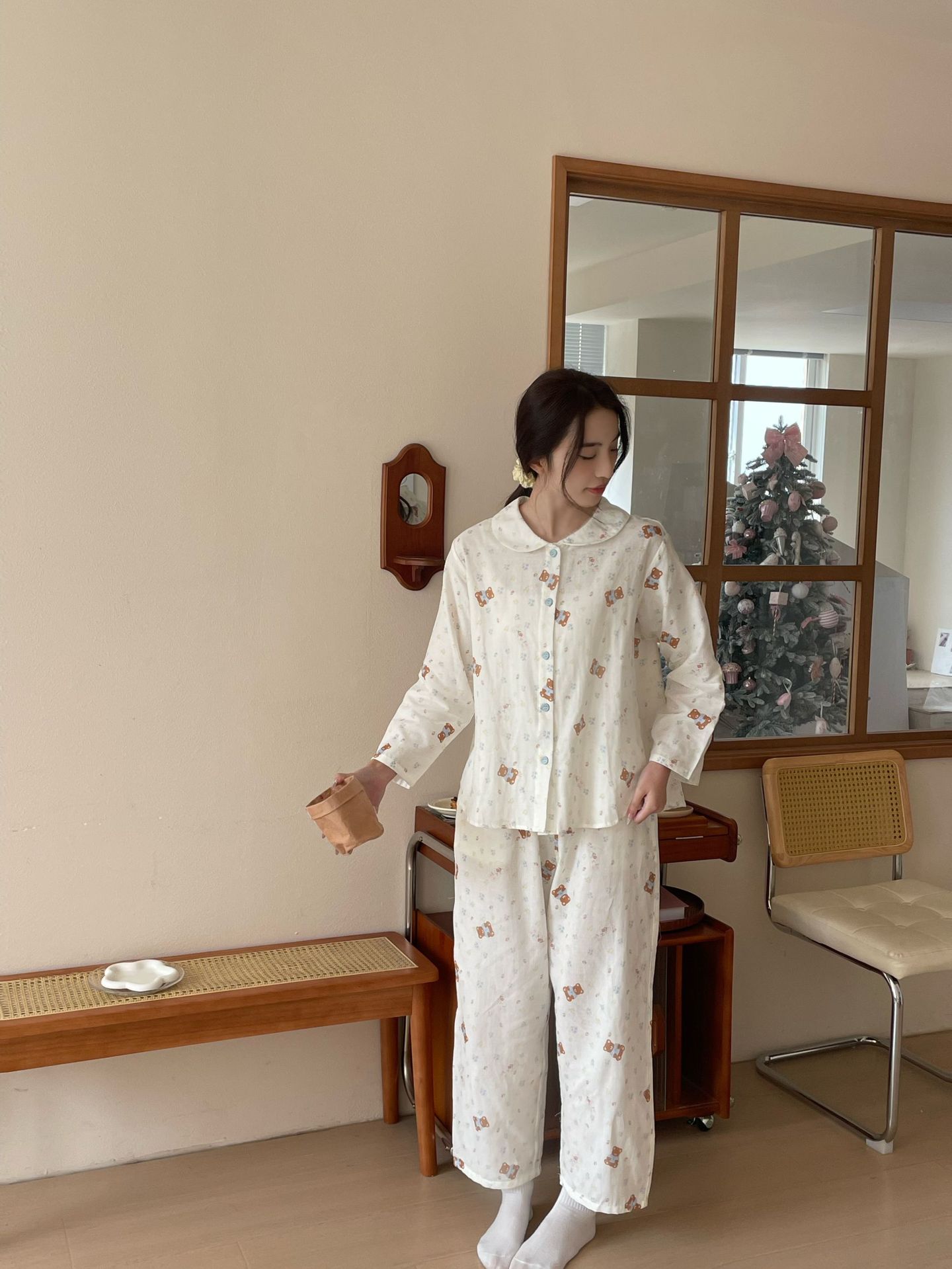 25 인치 스타일 통기성 홈 파자마 작은 옷깃 여성용 간단한 퓨어 코튼 더블 레이어 원사 파자마 홈 의류스토어 가기