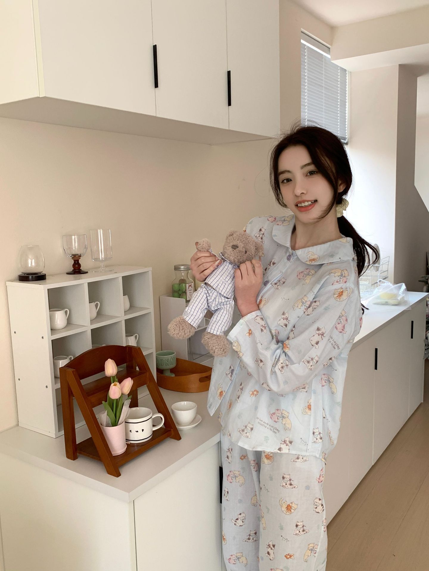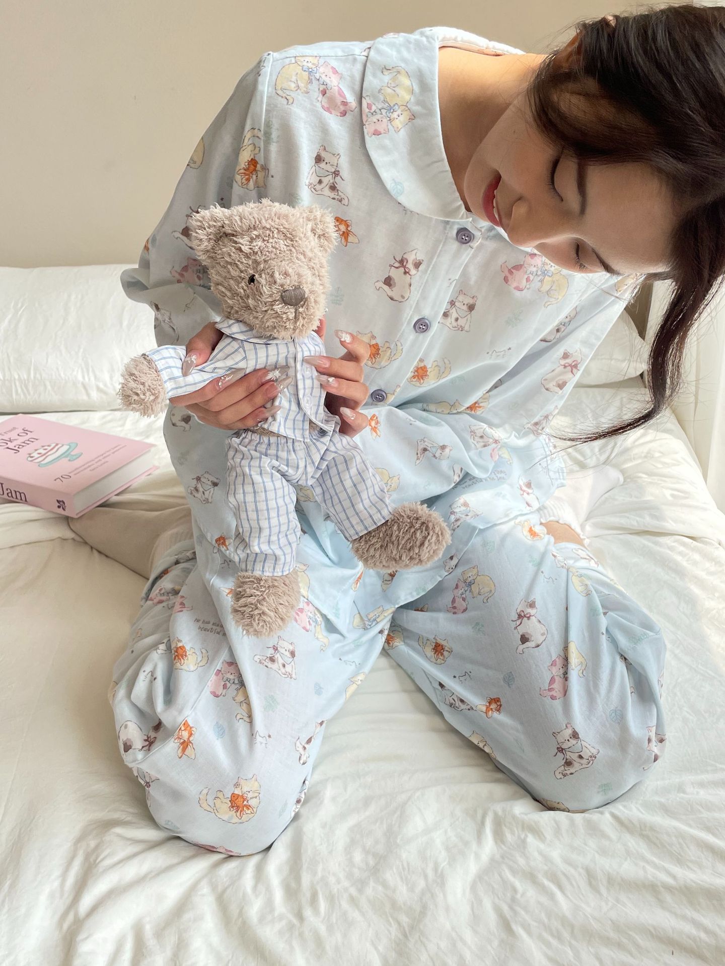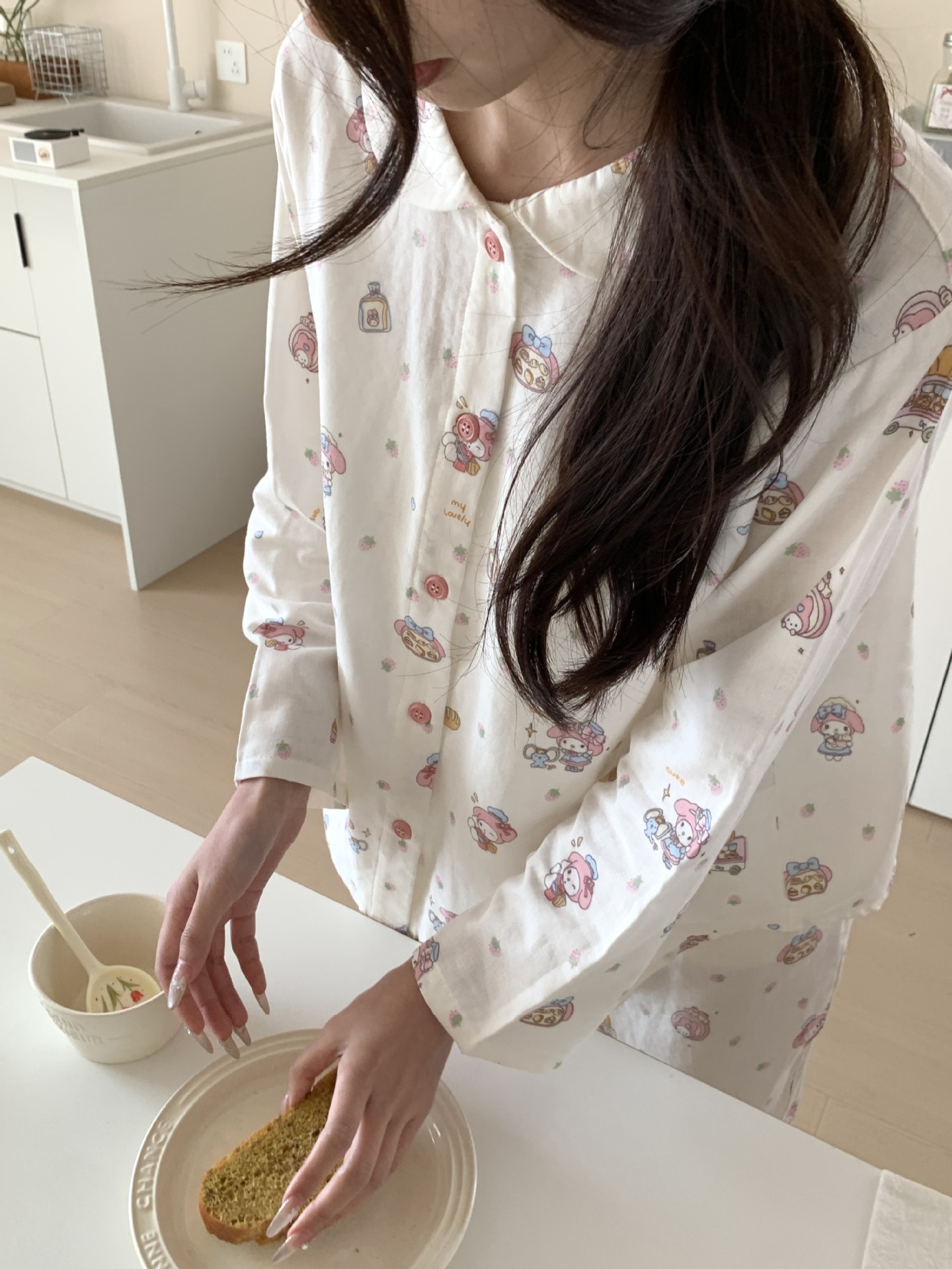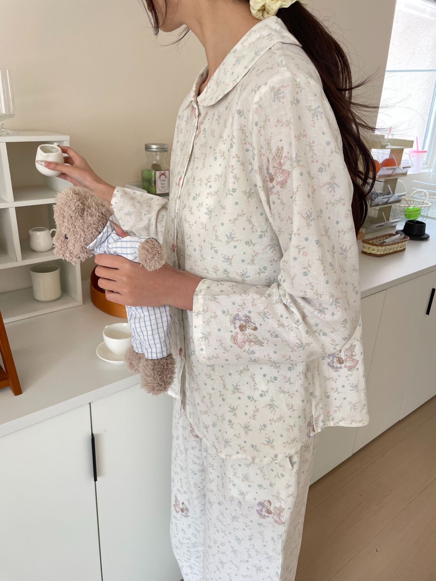 25 인치 스타일 통기성 홈 파자마 작은 옷깃 여성용 간단한 퓨어 코튼 더블 레이어 원사 파자마 홈 의류스토어 가기