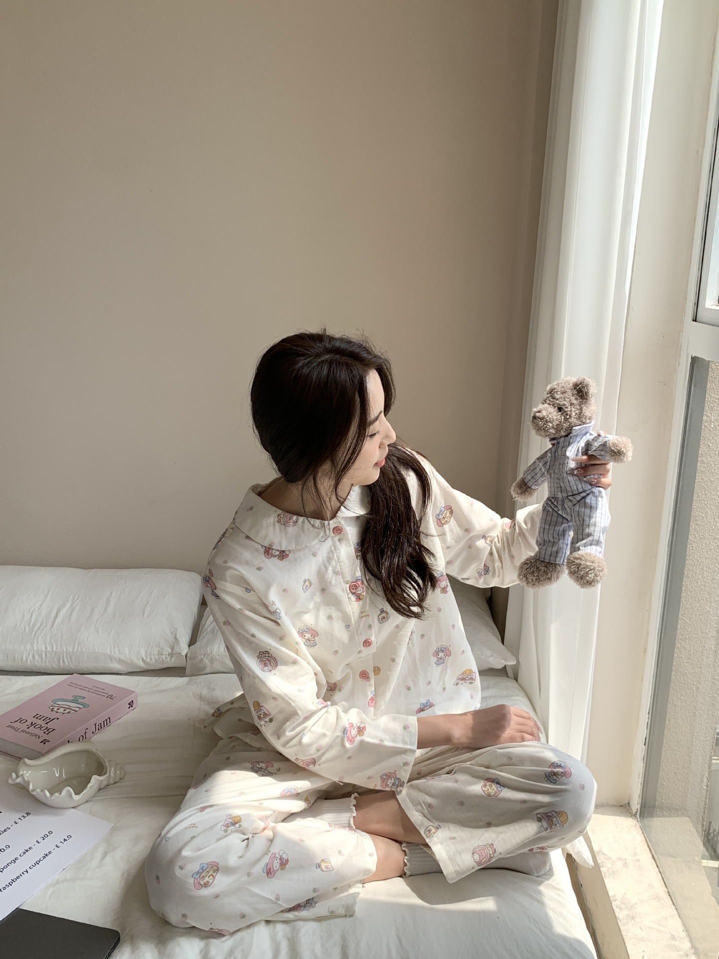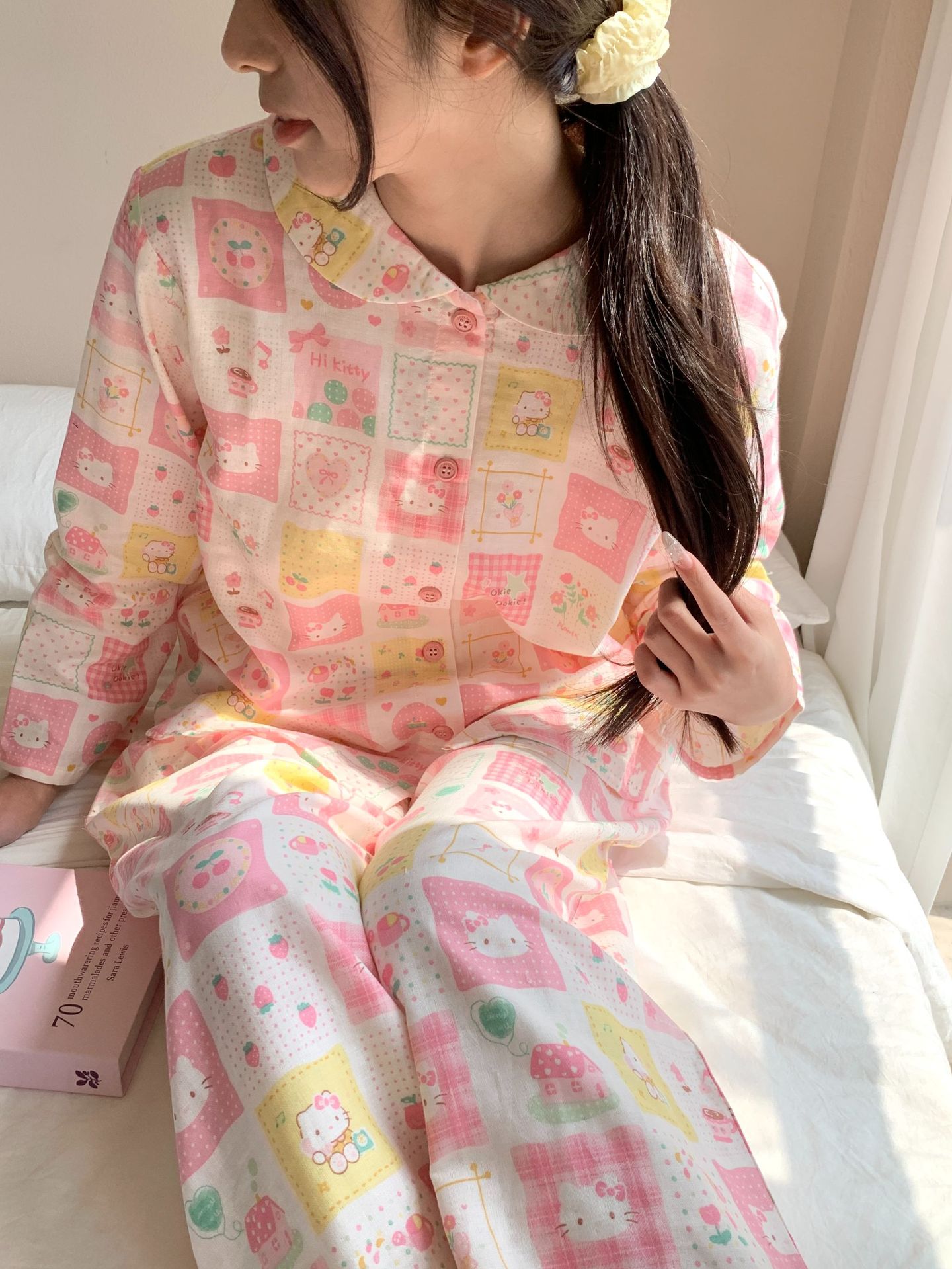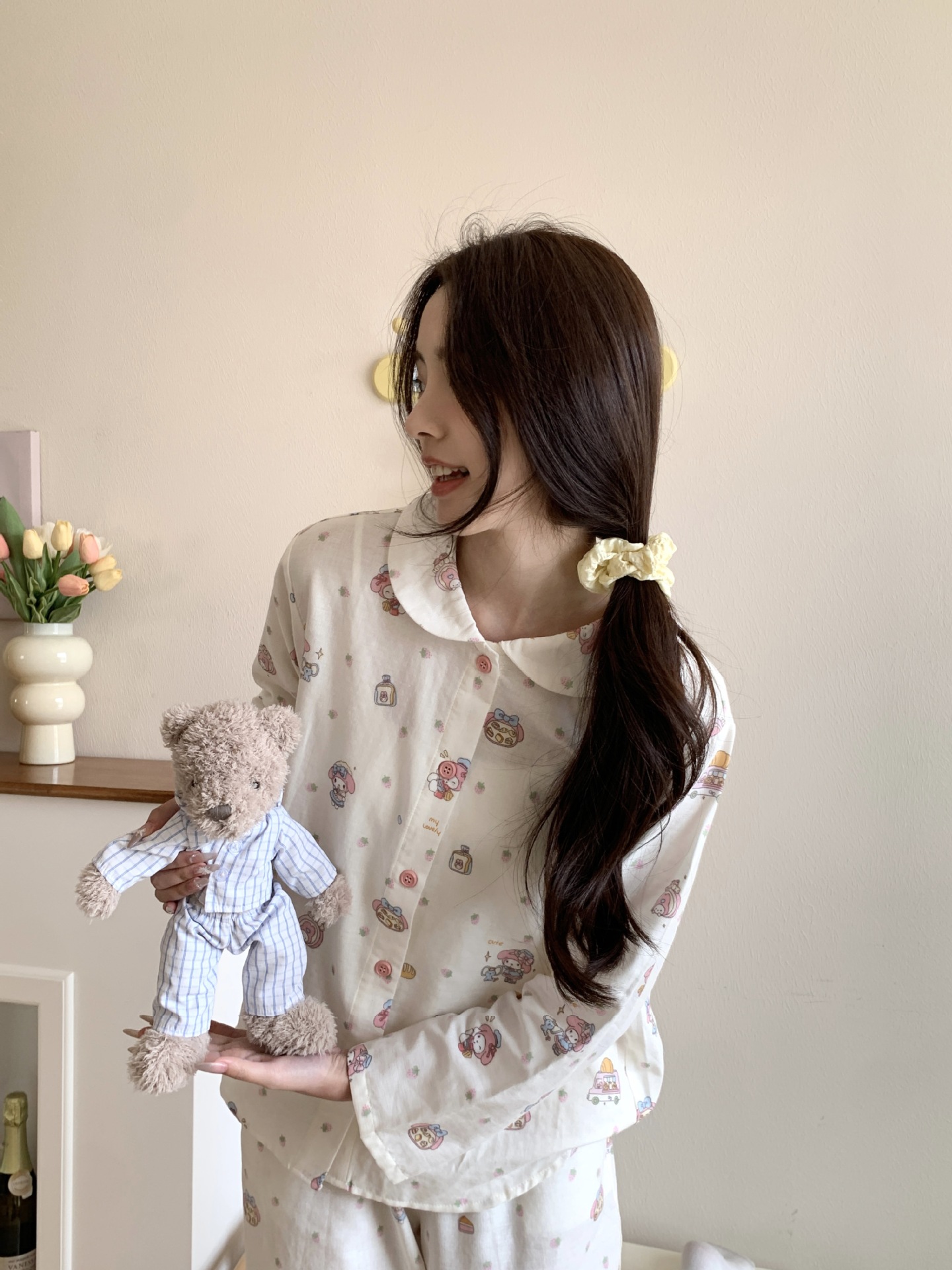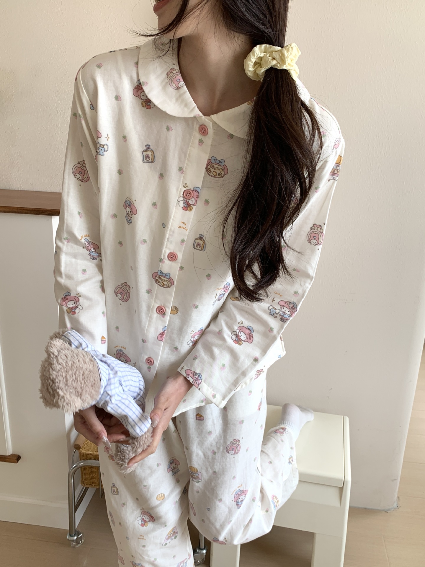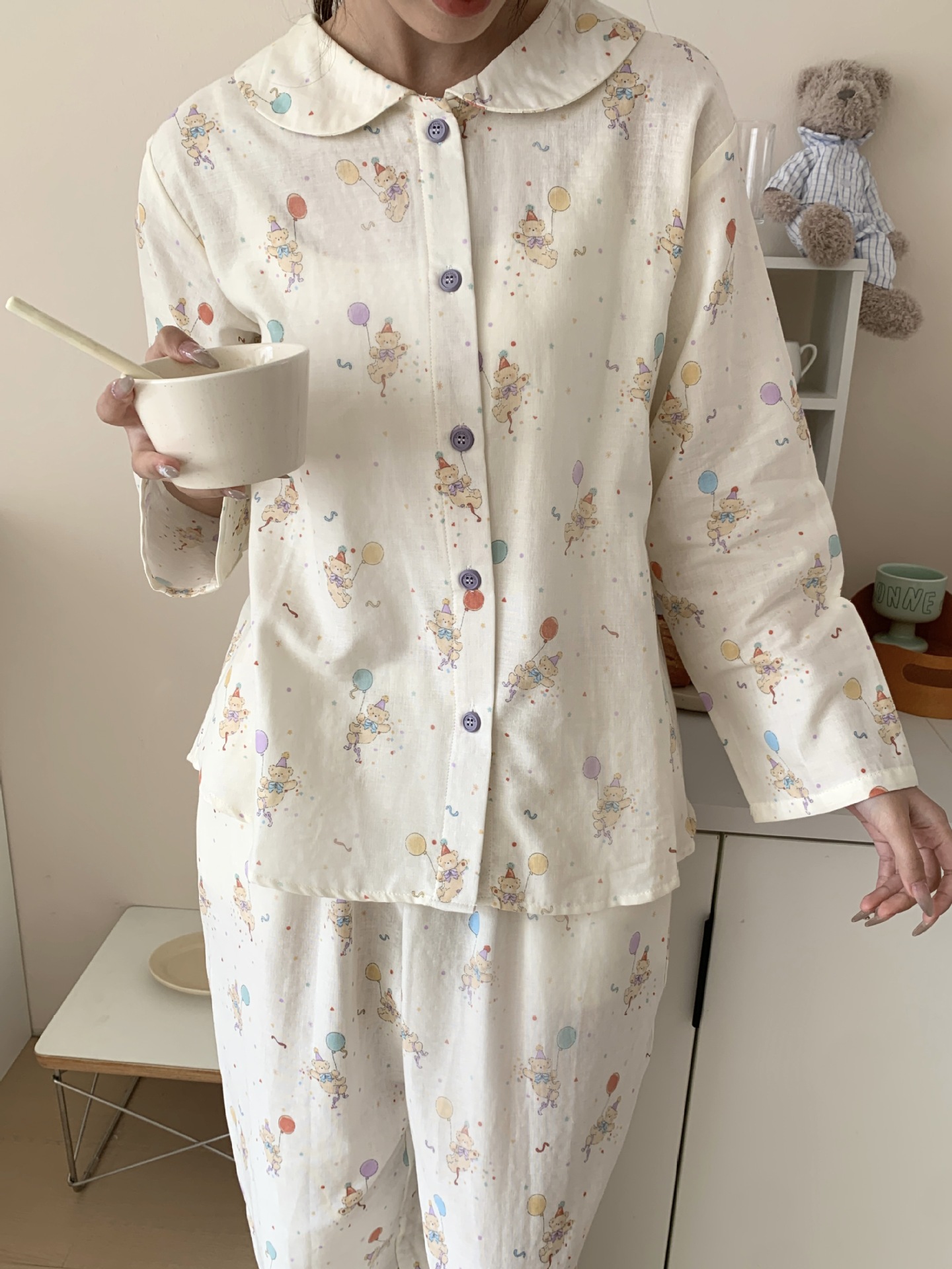 25 인치 스타일 통기성 홈 파자마 작은 옷깃 여성용 간단한 퓨어 코튼 더블 레이어 원사 파자마 홈 의류