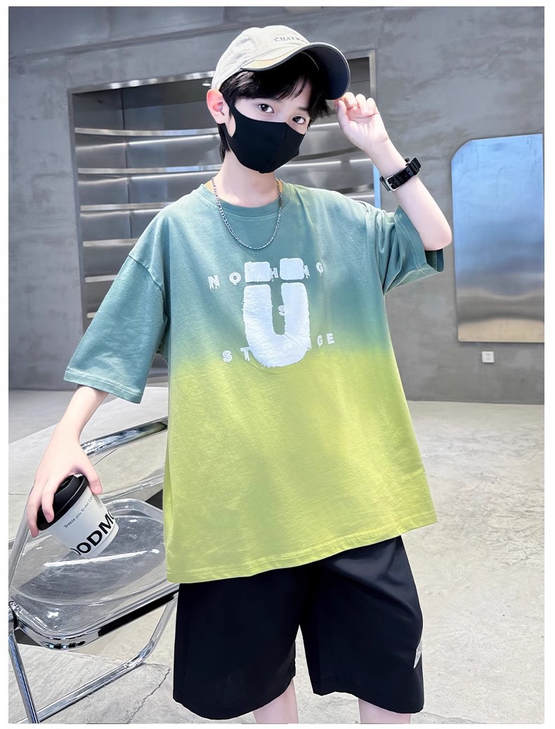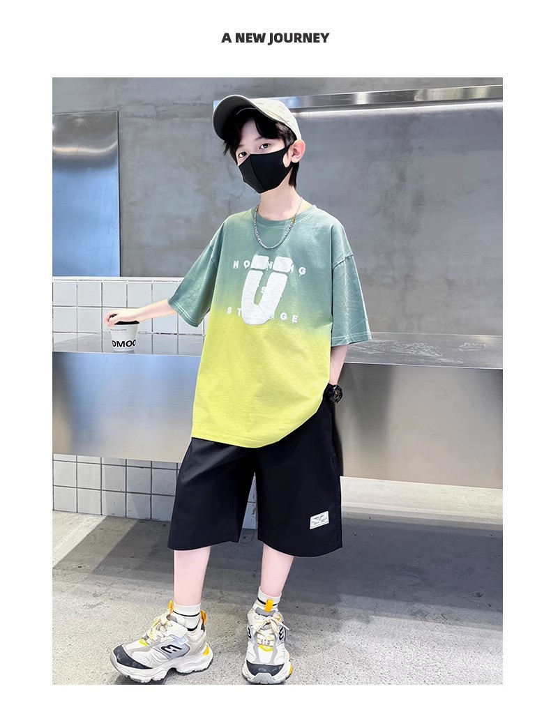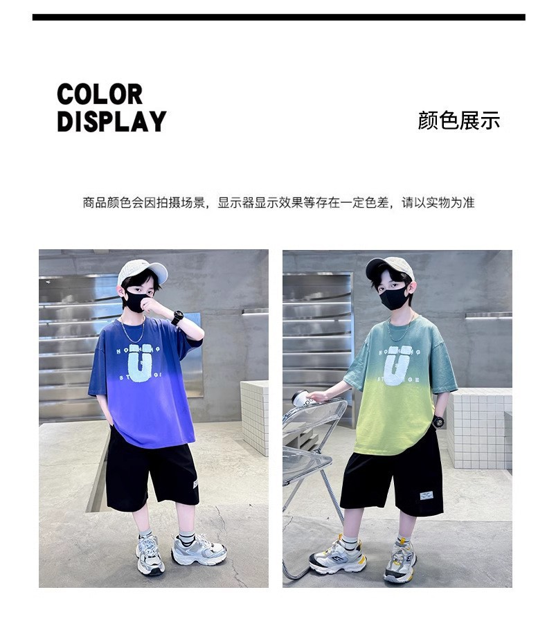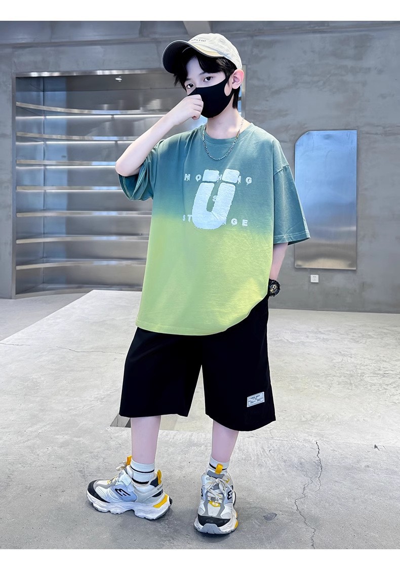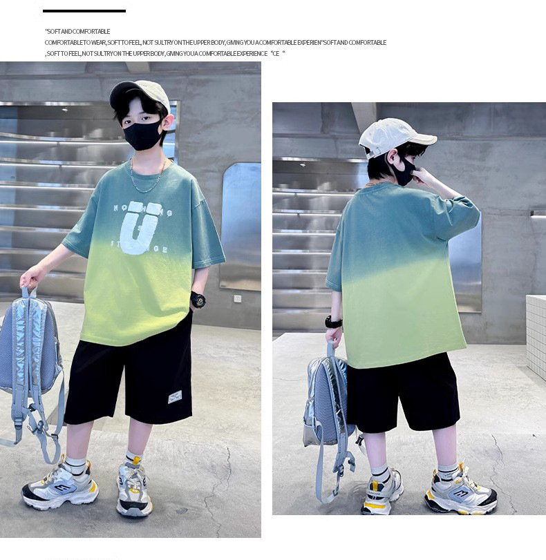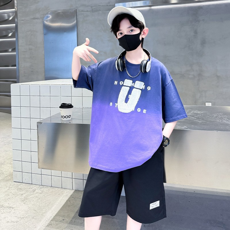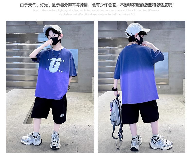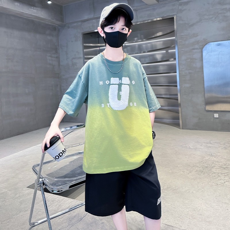 夏季儿童潮范渐变色宽松休闲运动套装中大童字母印花短袖短裤套装