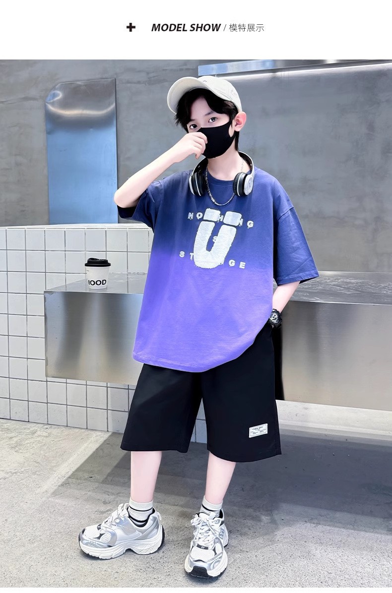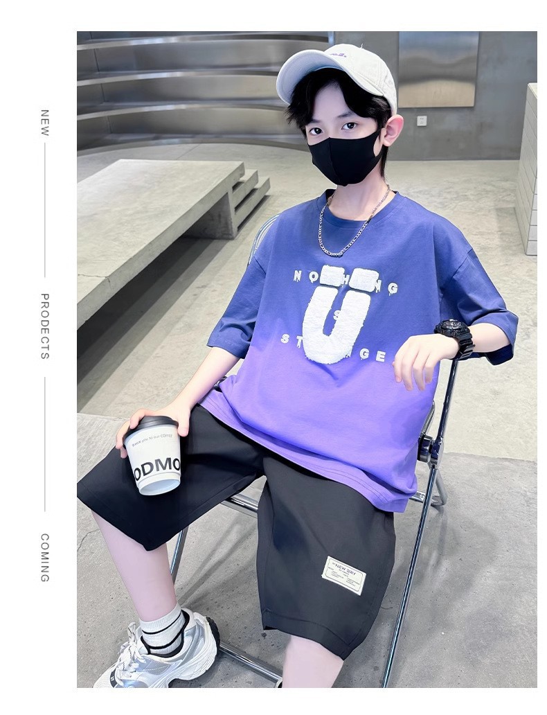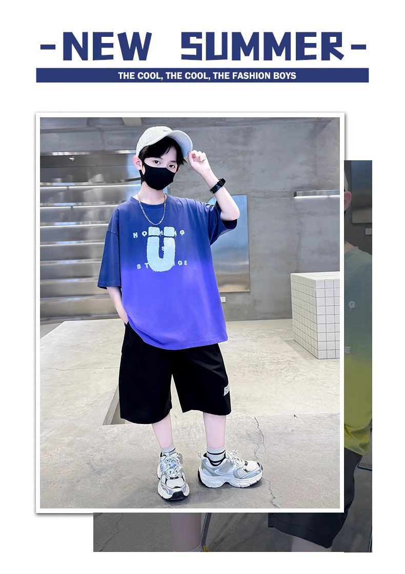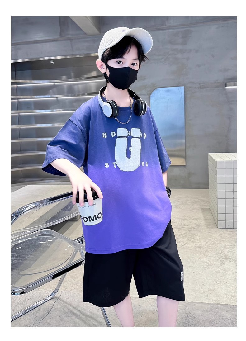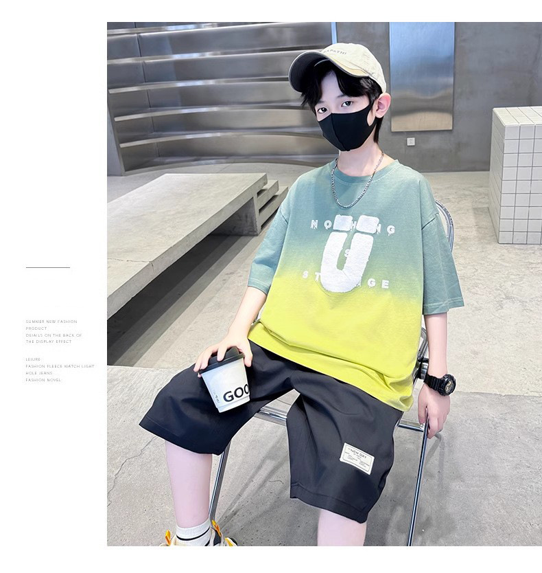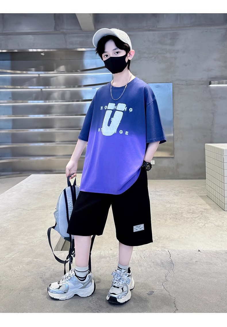 夏季儿童潮范渐变色宽松休闲运动套装中大童字母印花短袖短裤套装