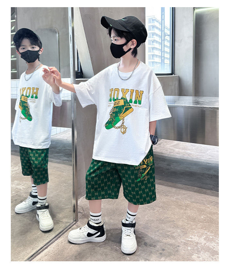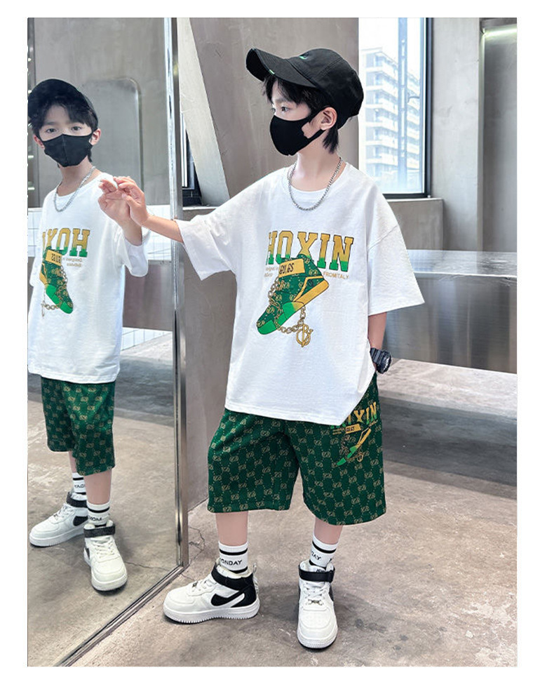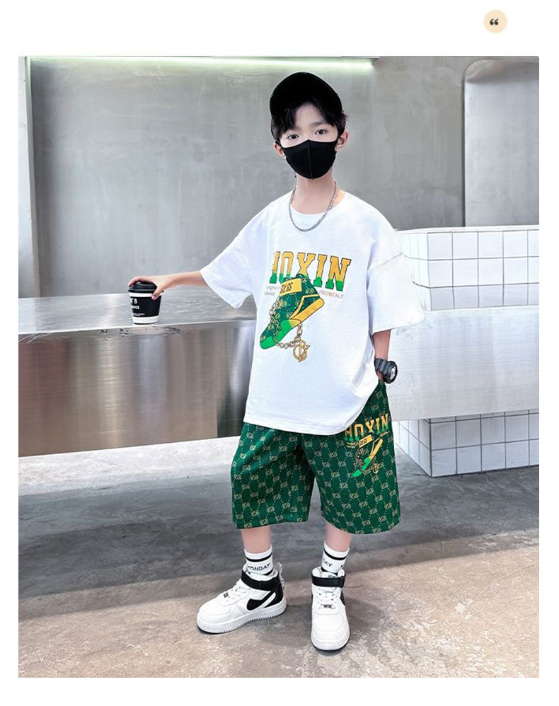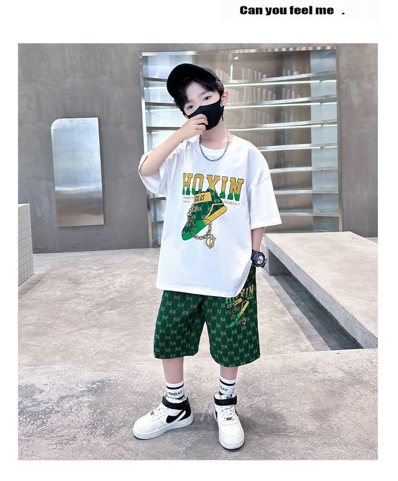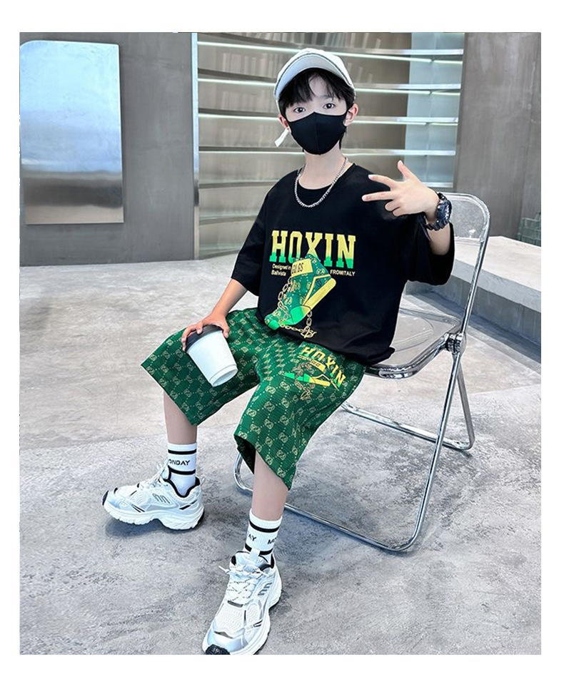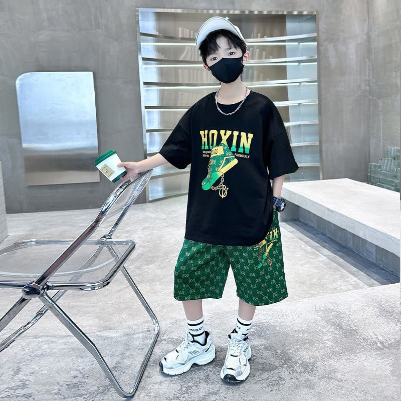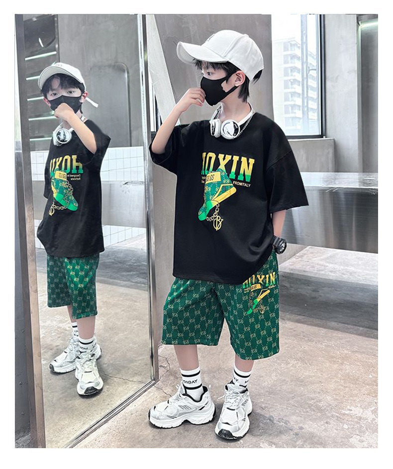 여름 새로운 어린이 반팔 바지 세트 작은 소년 차가운 편지 인쇄 둥근 목 느슨한 캐주얼 세트