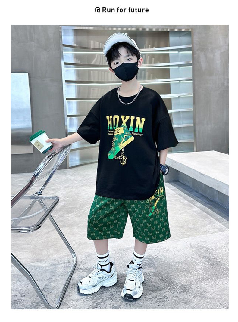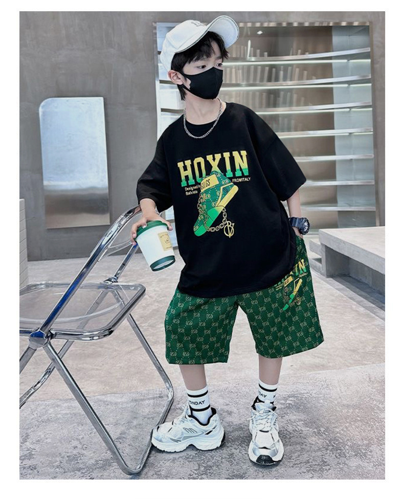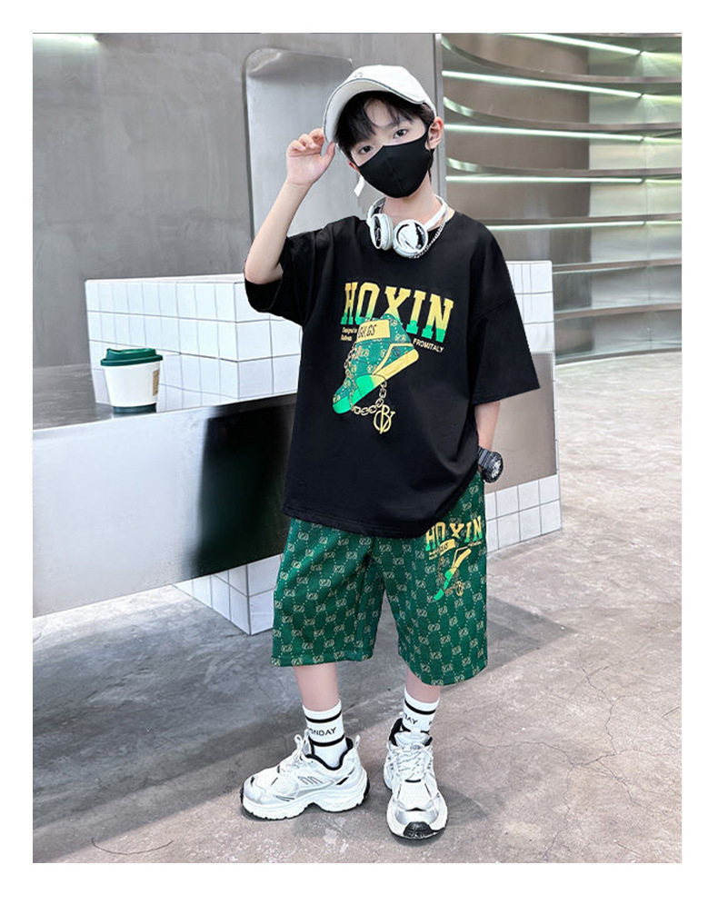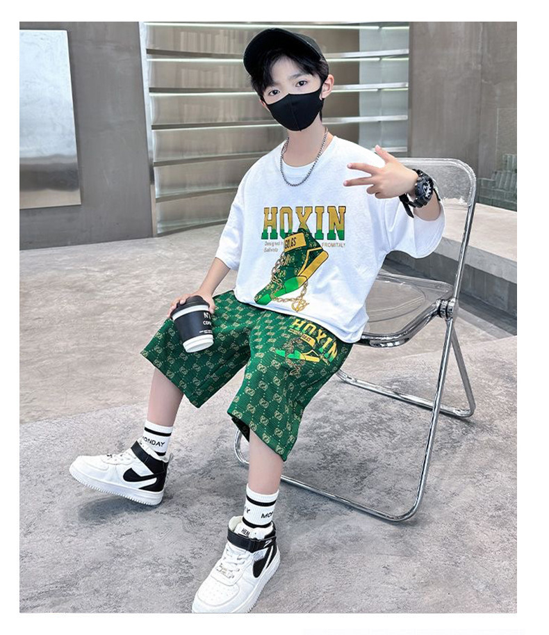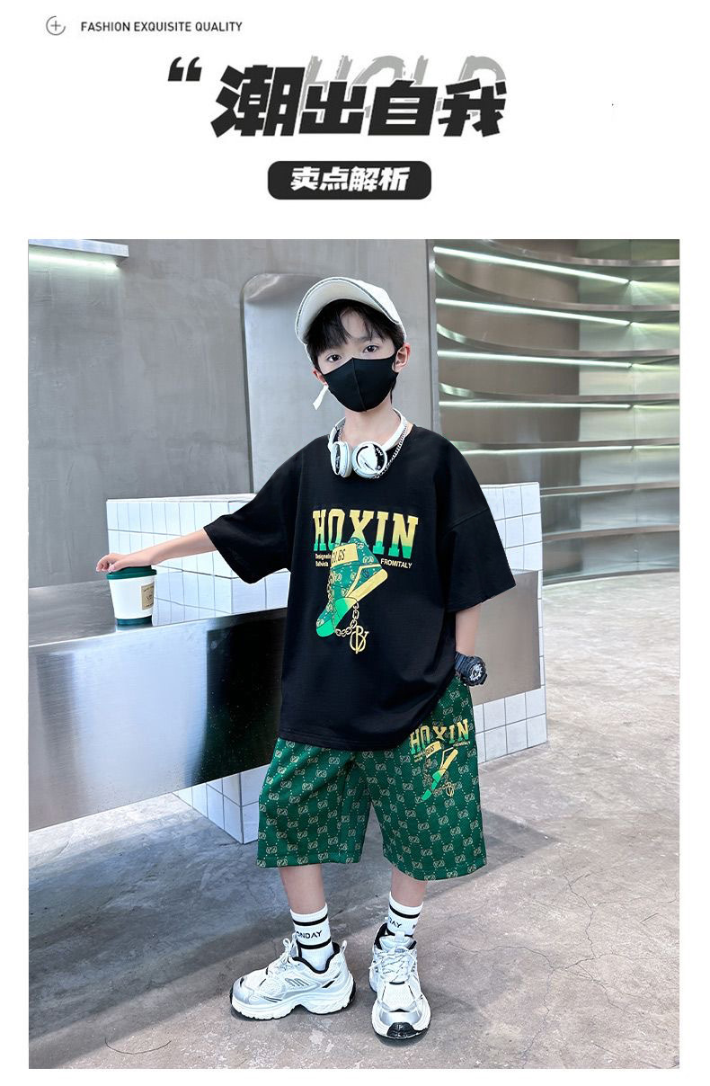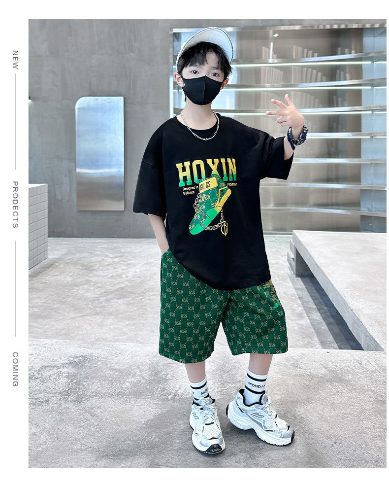 여름 새로운 어린이 반팔 바지 세트 작은 소년 차가운 편지 인쇄 둥근 목 느슨한 캐주얼 세트