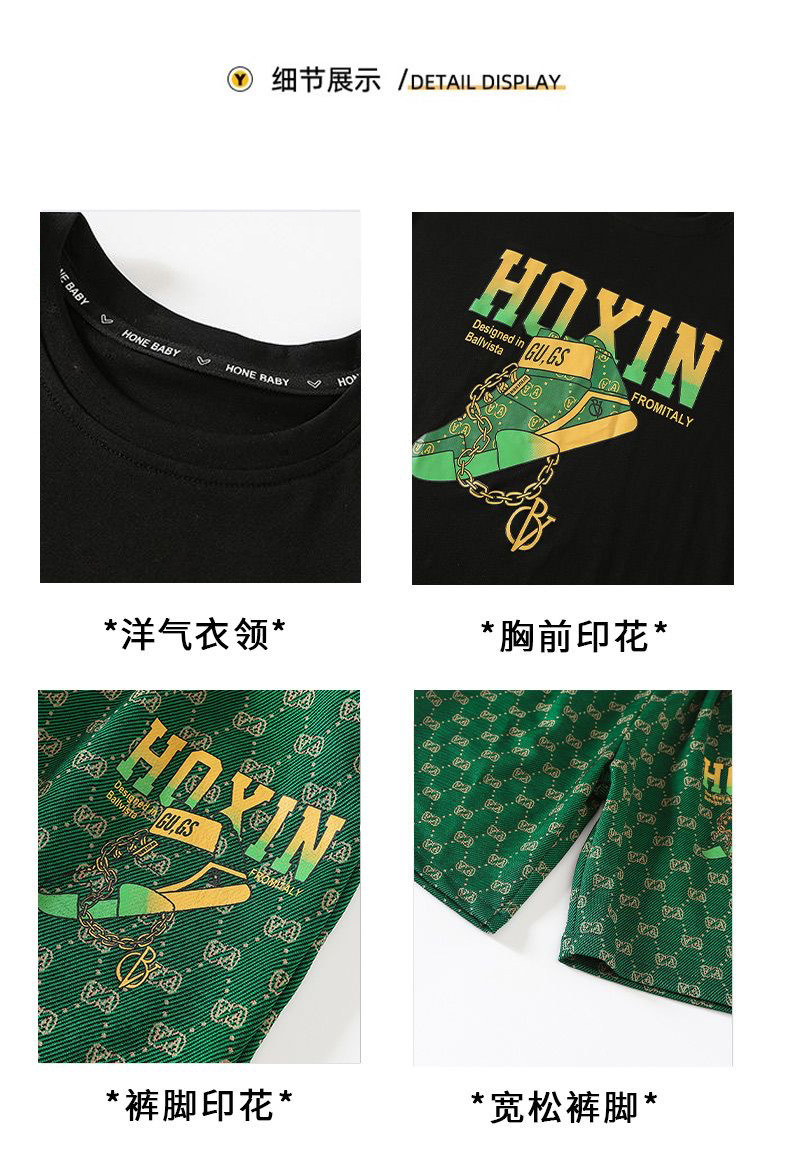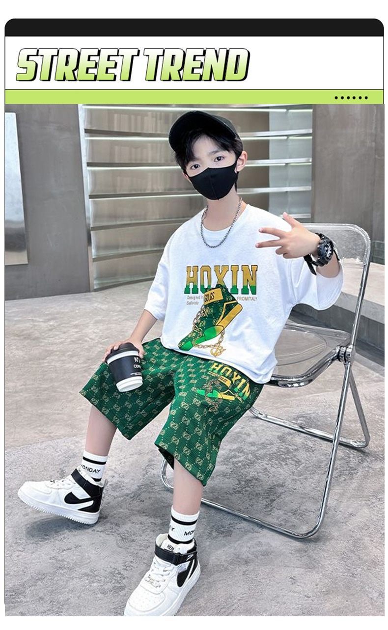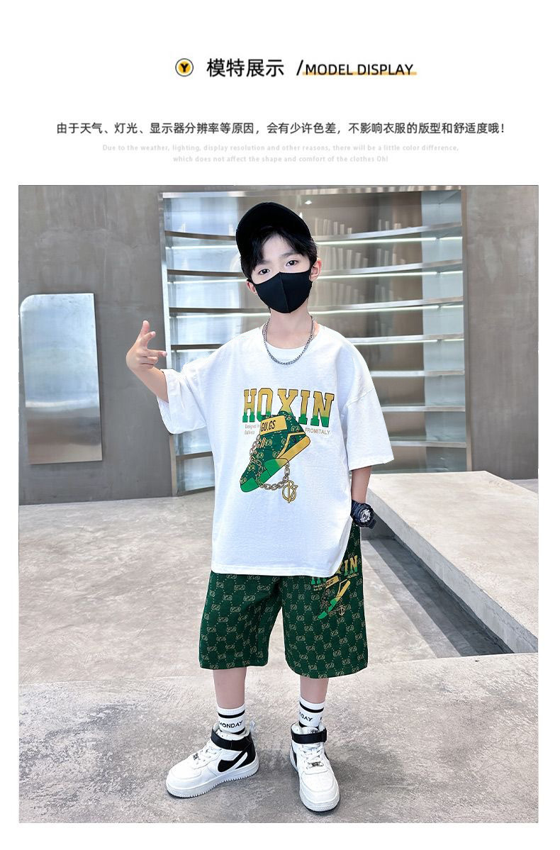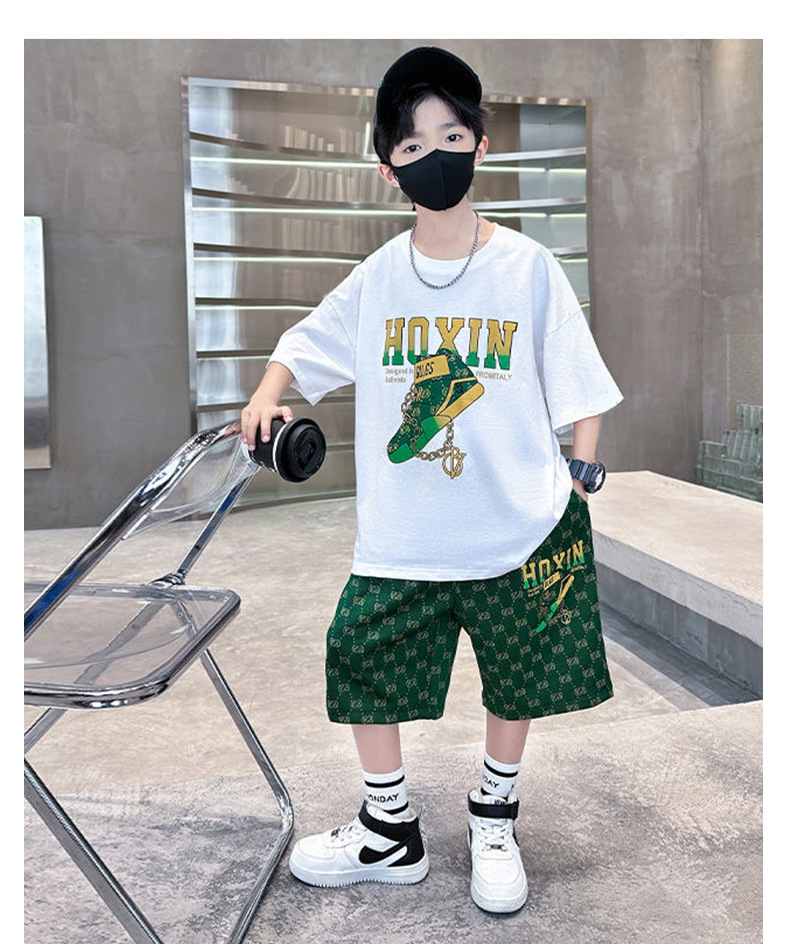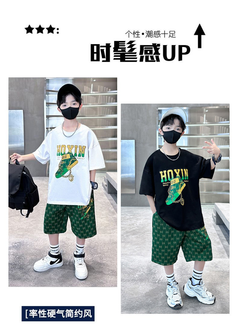 여름 새로운 어린이 반팔 바지 세트 작은 소년 차가운 편지 인쇄 둥근 목 느슨한 캐주얼 세트