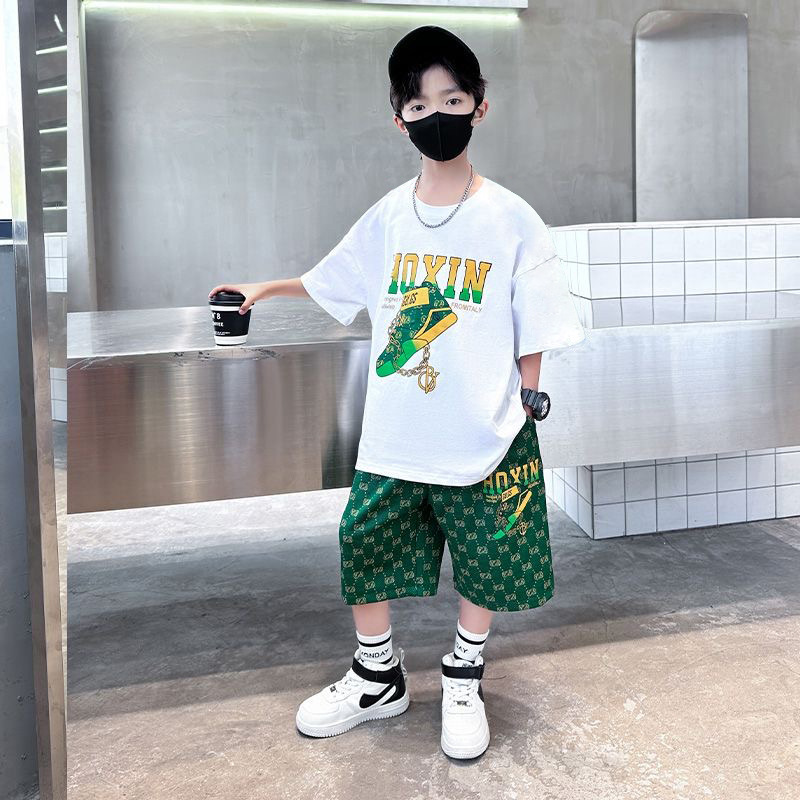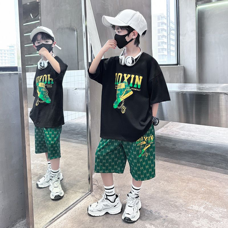 여름 새로운 어린이 반팔 바지 세트 작은 소년 차가운 편지 인쇄 둥근 목 느슨한 캐주얼 세트스토어 가기