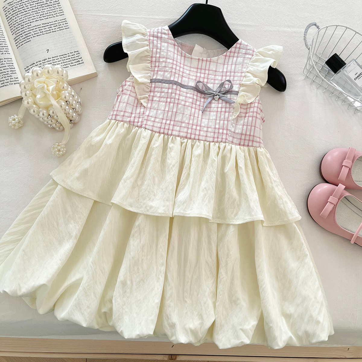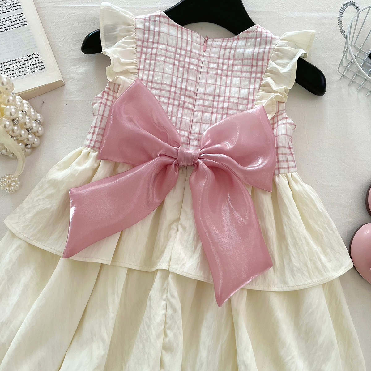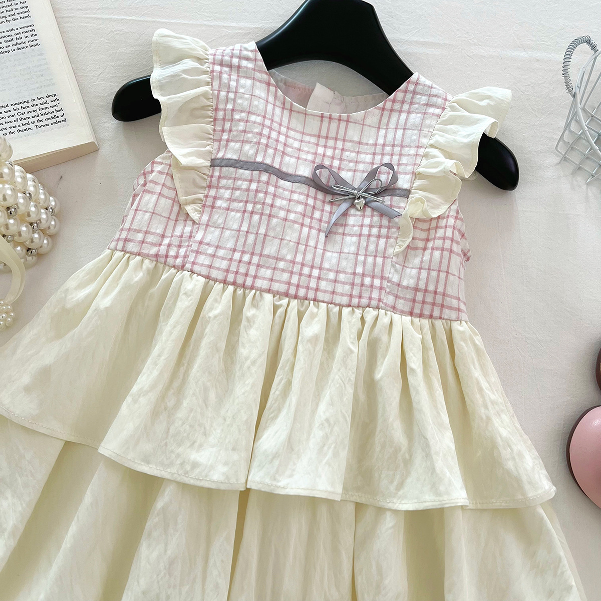 2025 소녀의 여름 활 격자 패치 원피스 어린이 달콤한 비행 소매 조끼 공주 원피스 3027
