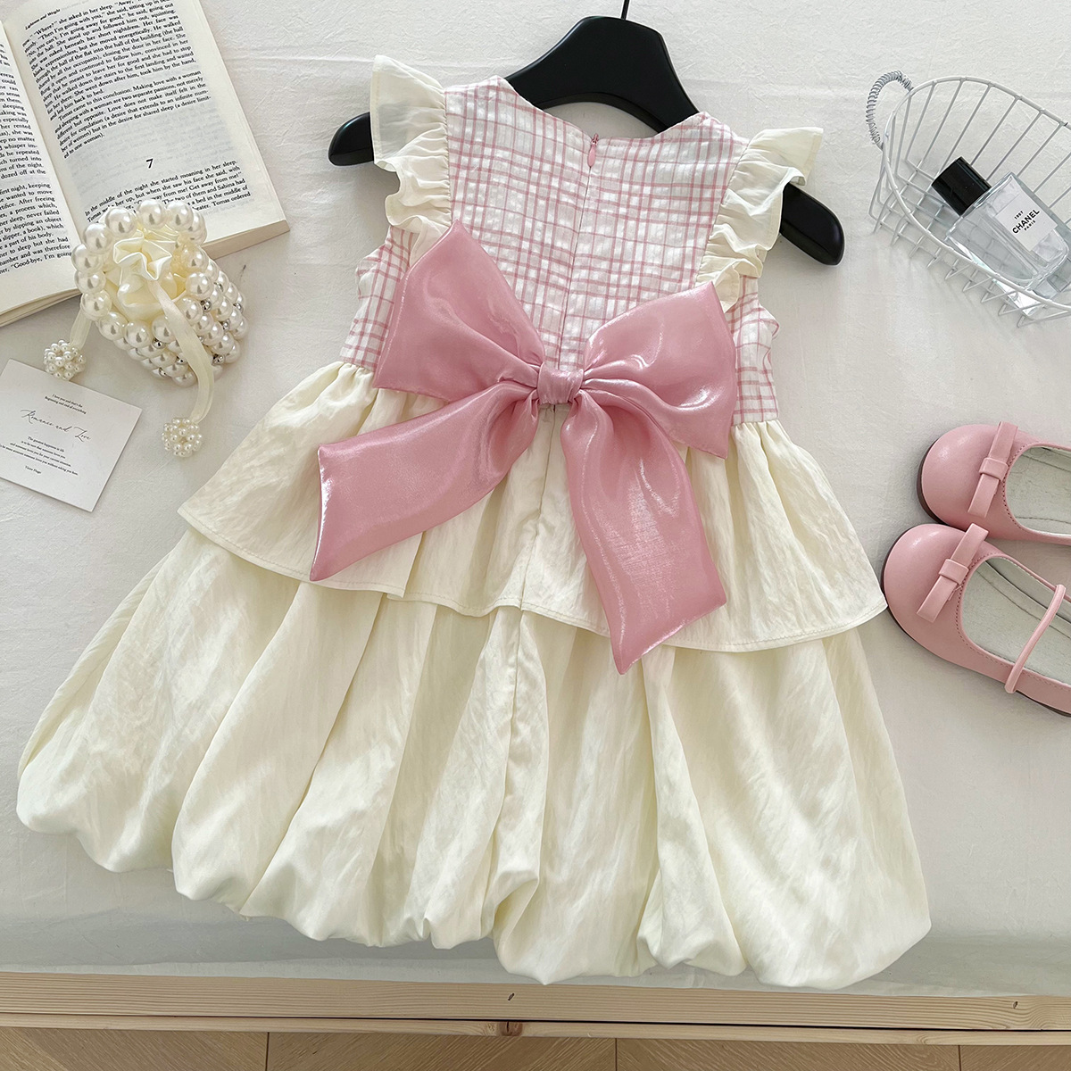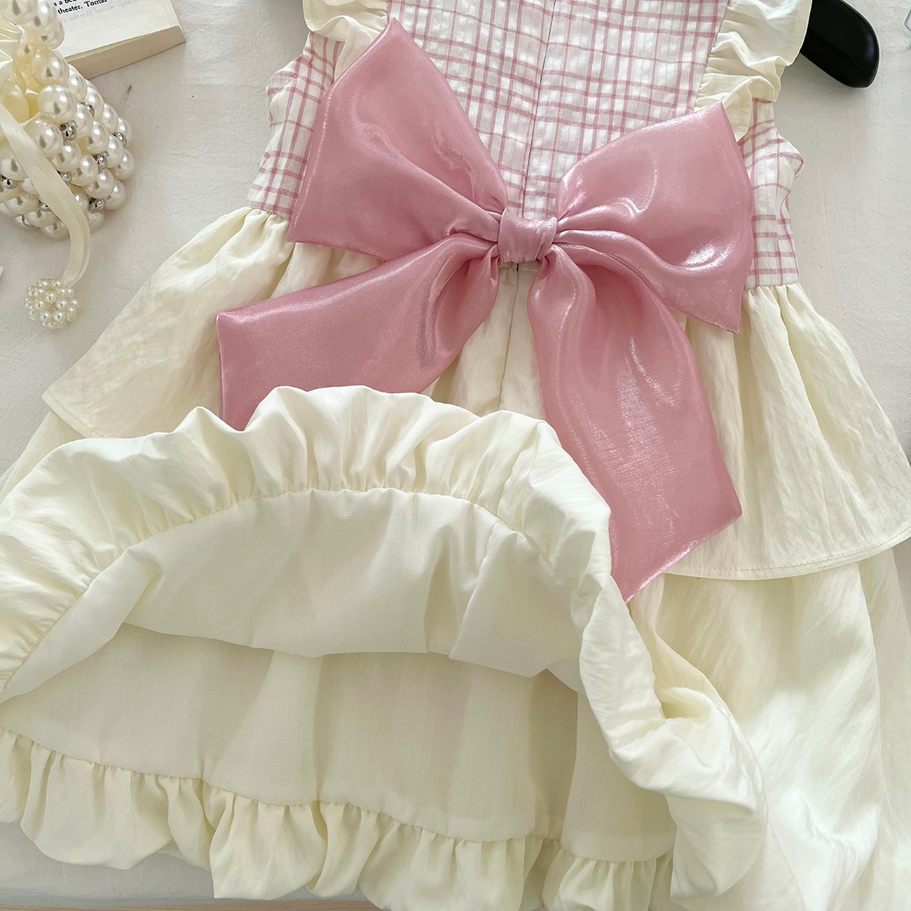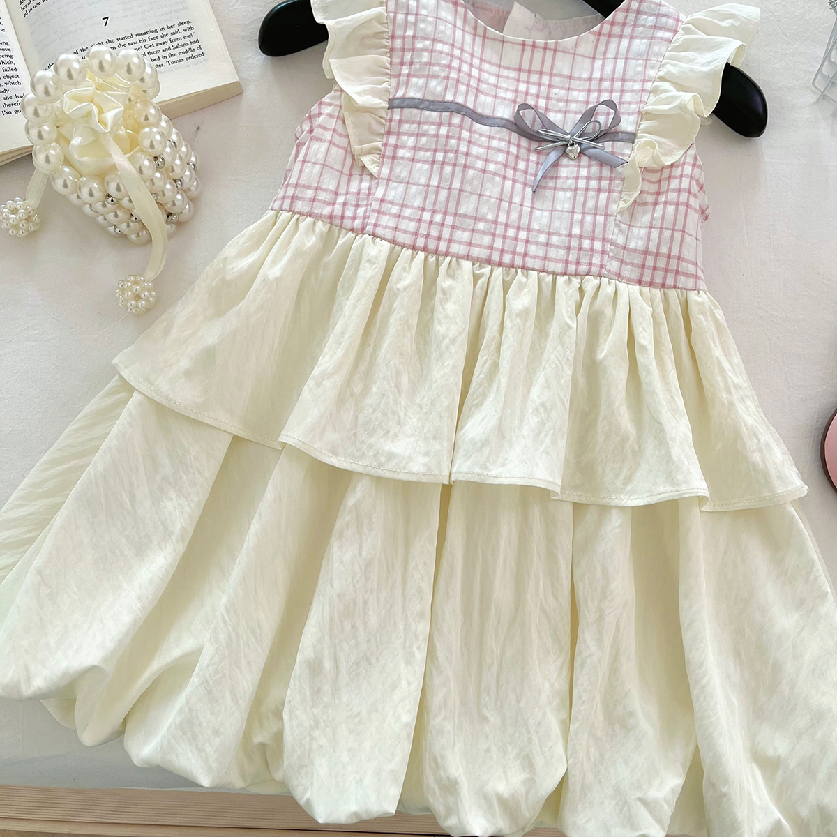 2025 소녀의 여름 활 격자 패치 원피스 어린이 달콤한 비행 소매 조끼 공주 원피스 3027
