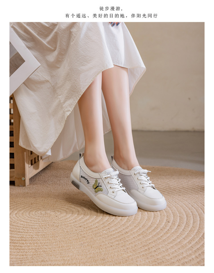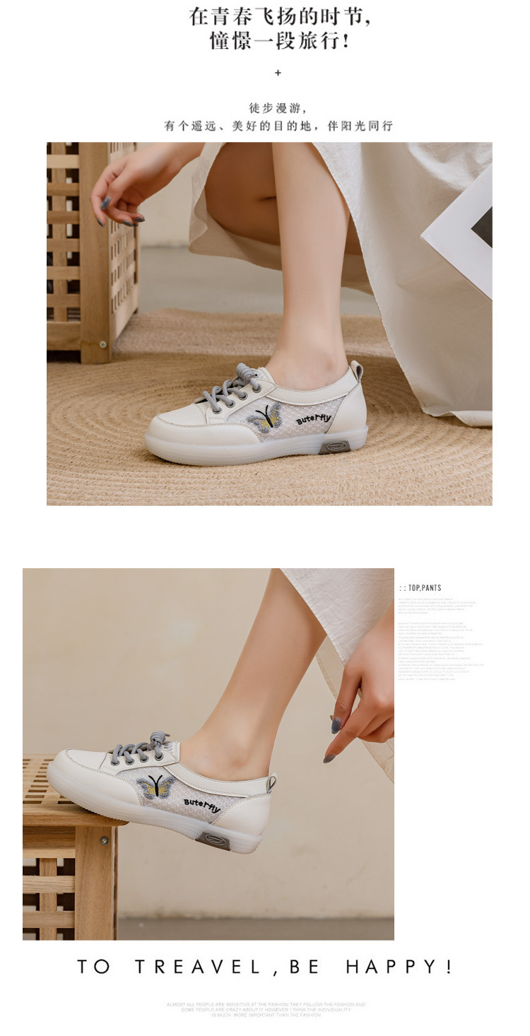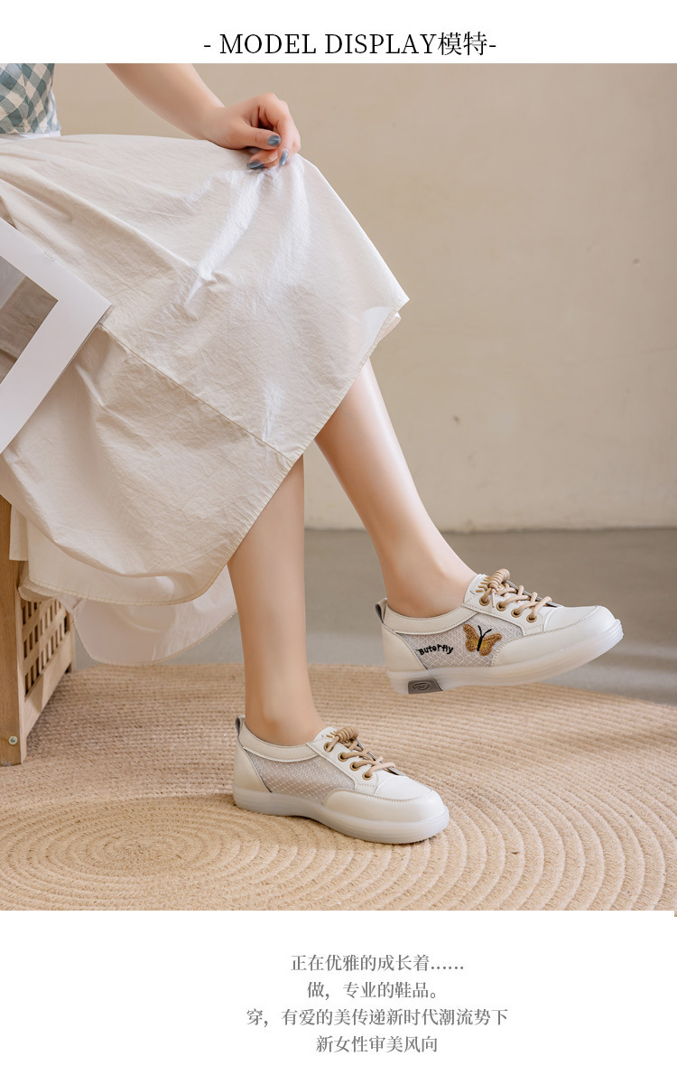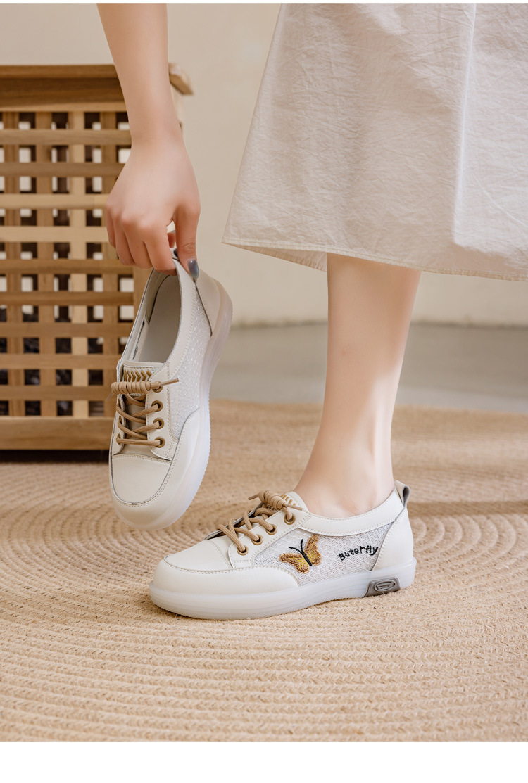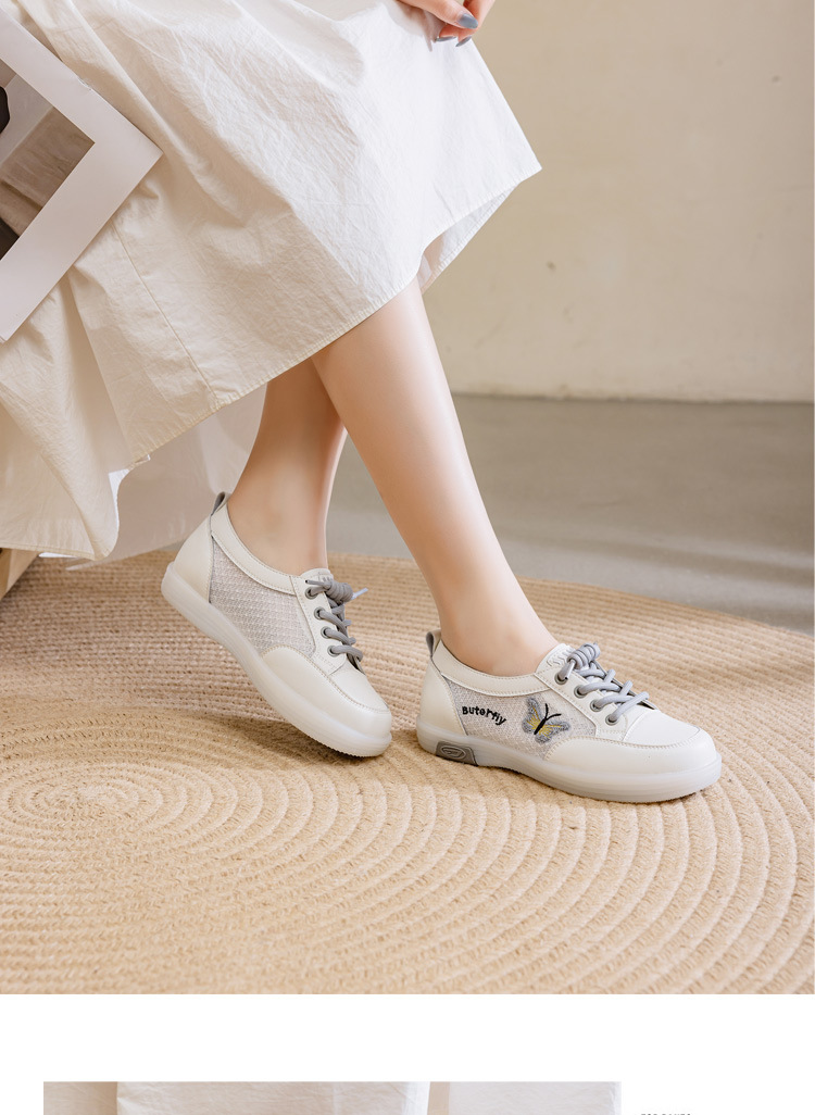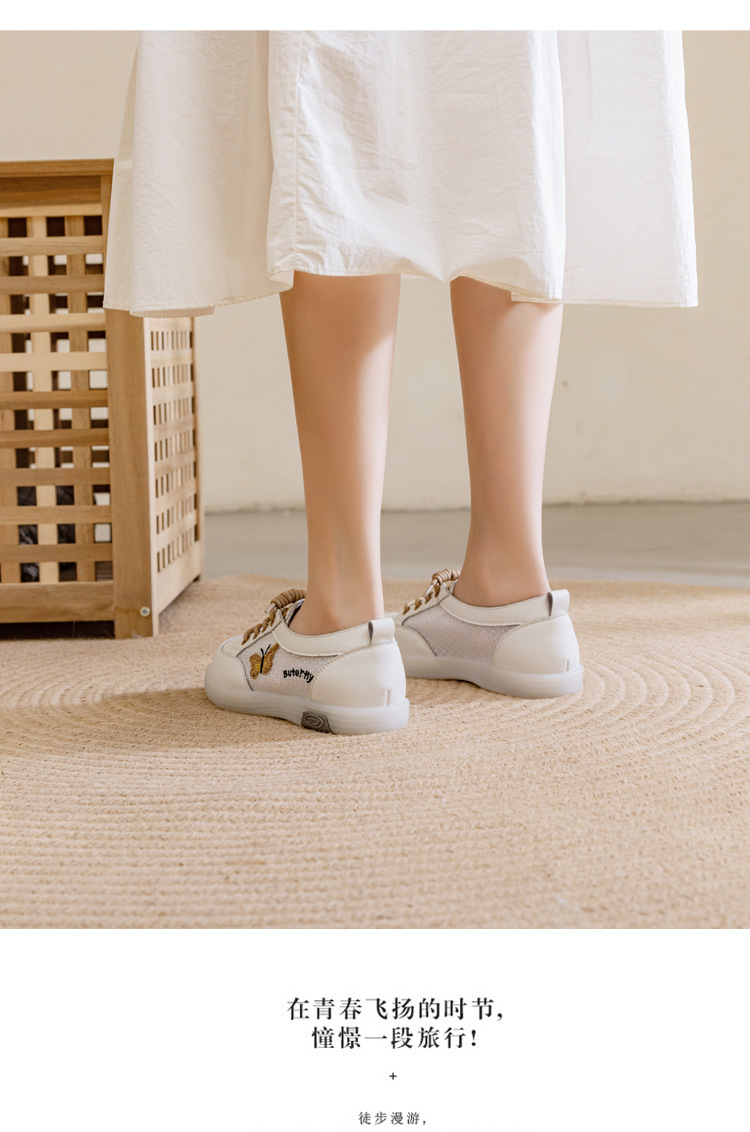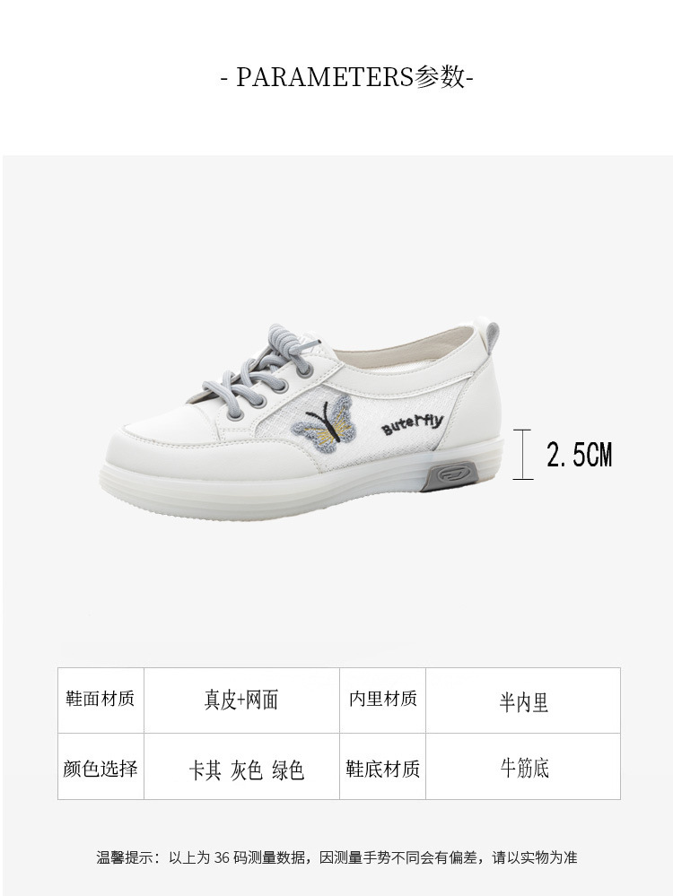 정품 가죽 플랫 화이트 신발 여성의 2025 년 봄과 여름 새로운 도착 나비 캐주얼 올 매치 소프트 솔 메쉬 신발 플러스 사이즈 여성 신발