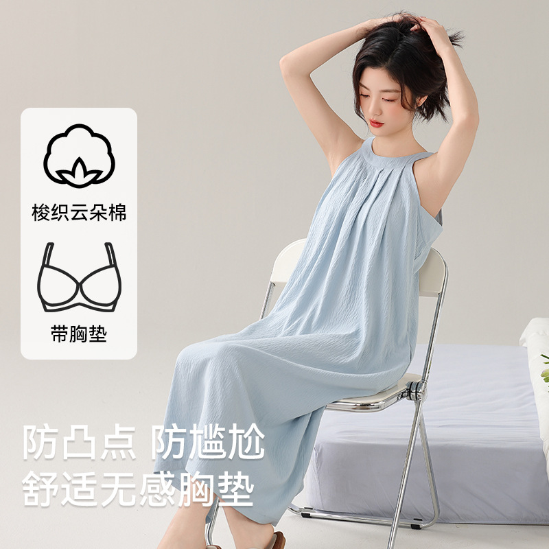 여성용 클라우드 코튼 나이트가운, 가슴 패드가 있는 여름 홀터넥 롱 스커트, 루즈하고 섹시한 민소매 풀오버, 단색 홈웨어, 외부 착용 가능