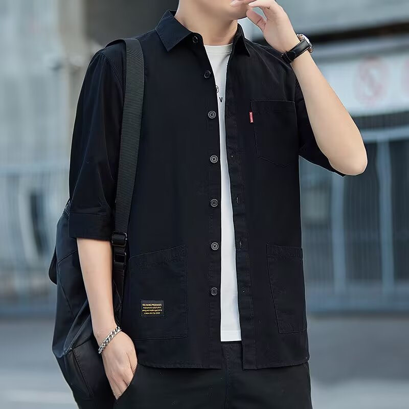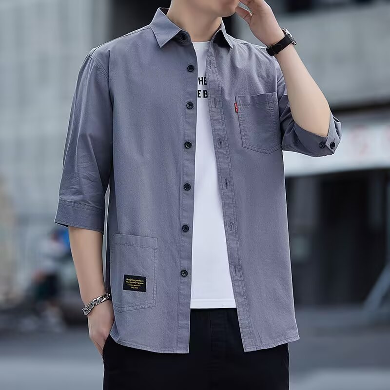 여름 남성 트렌디 작업복 얇은 루즈 반팔 셔츠 남성 심플 캐주얼 편안한 솔리드 컬러 7부 소매 셔츠