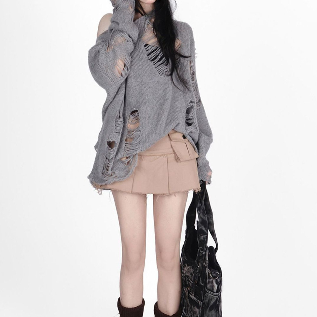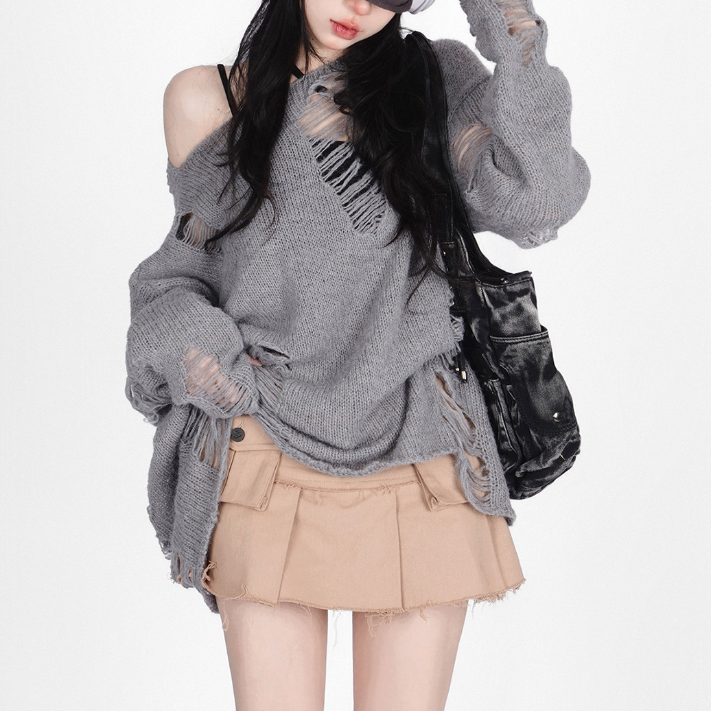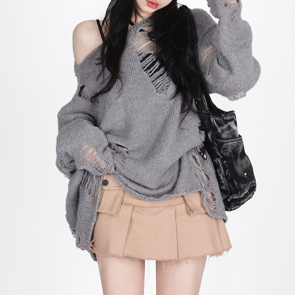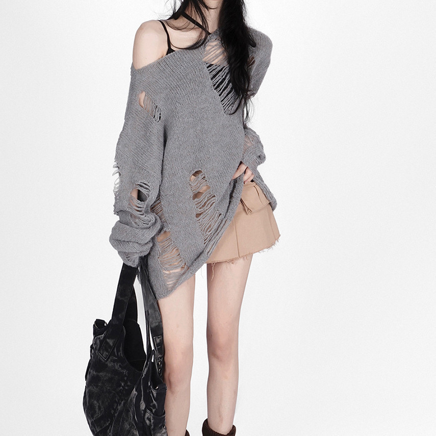 니치 슬로프 숄더 탑 캐주얼 레이지 2025 여름 가을 새로운 한국 스타일 루즈한 스웨터 여성용 찢어진 중공 스웨터