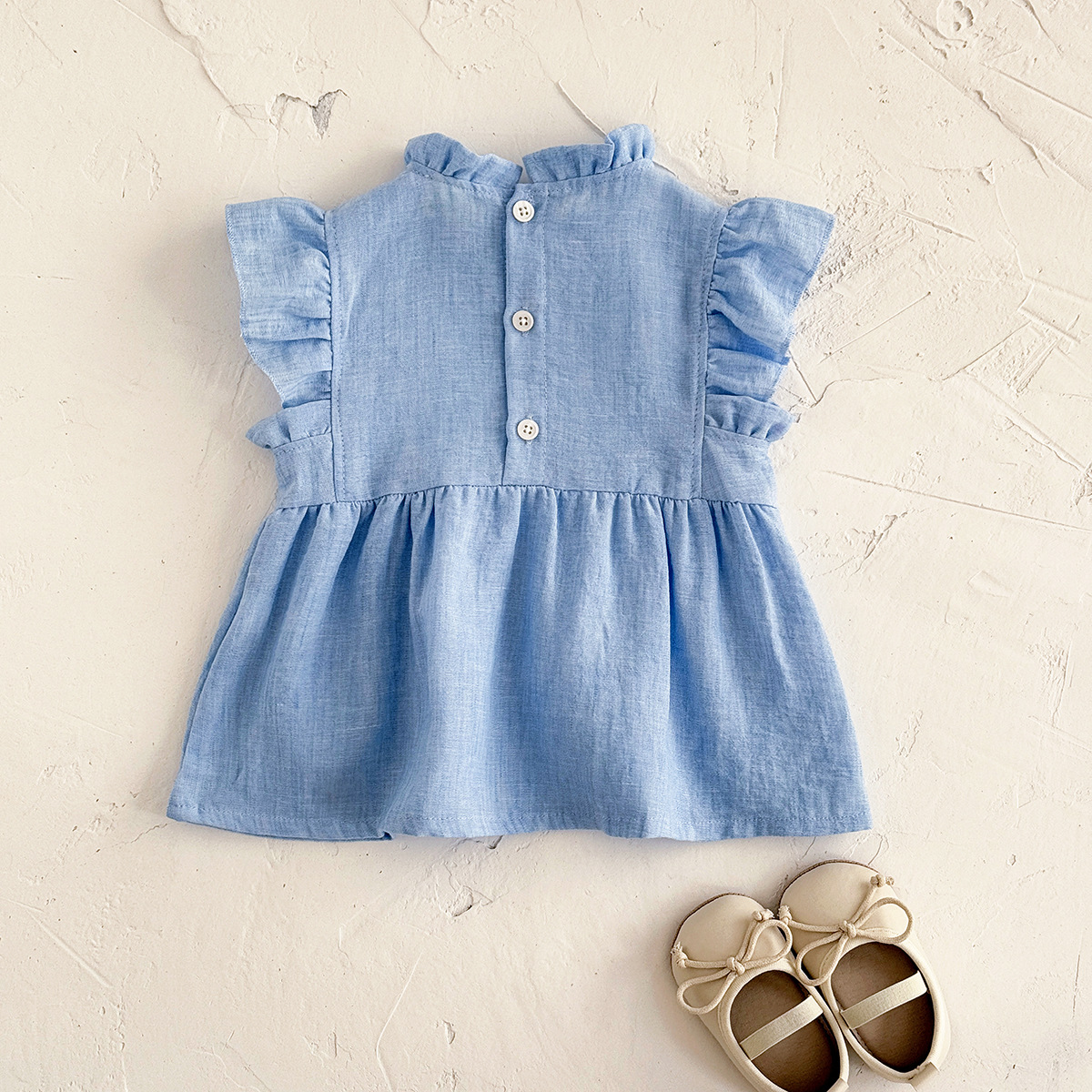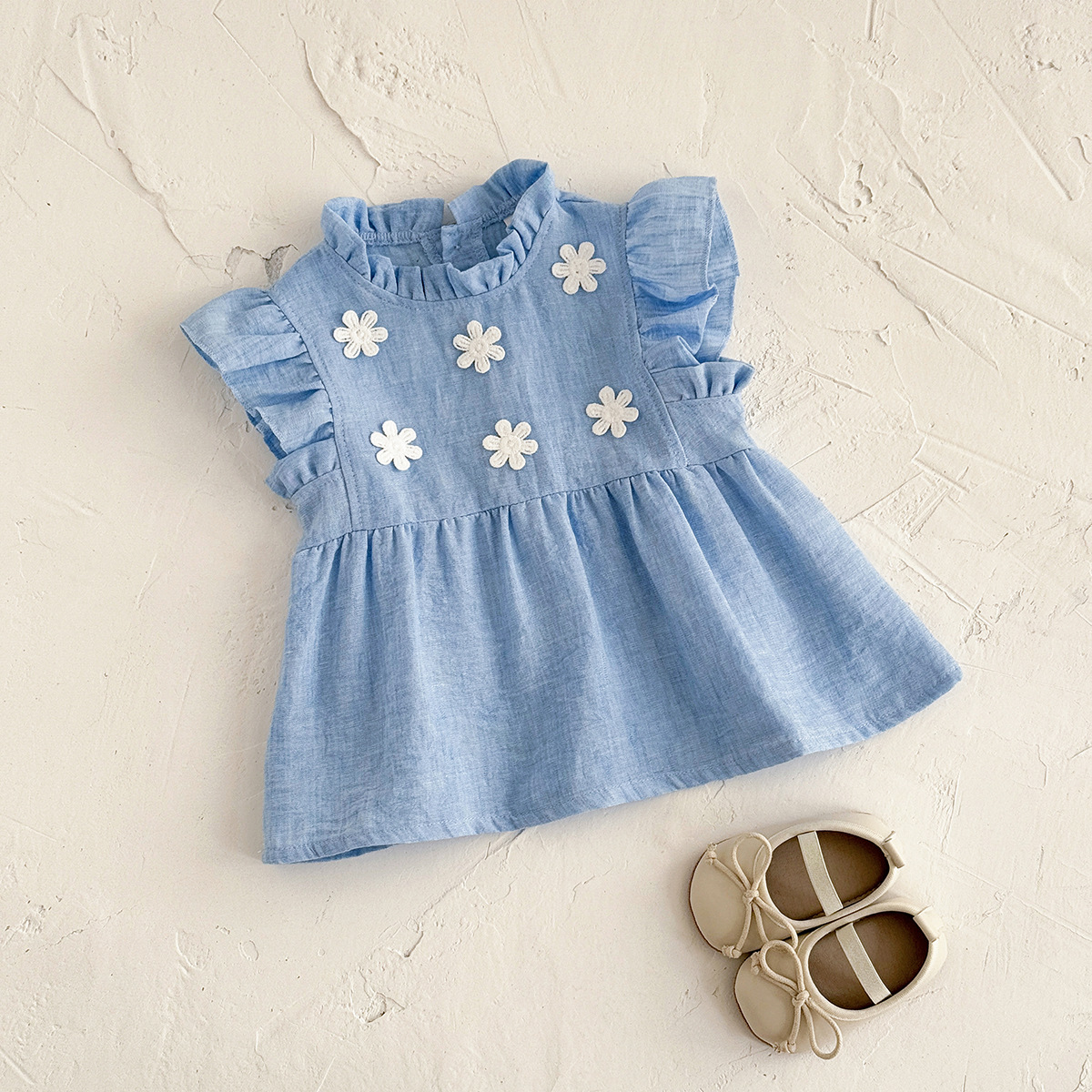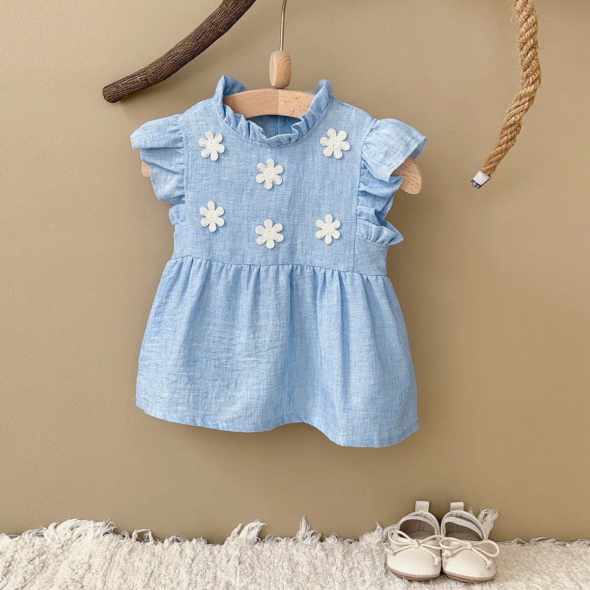 2025 여름 귀여운 꽃 비행 소매 원피스 공주 스타일 수제 꽃 소녀 편안한 부드러운 라이트 블루스토어 가기
