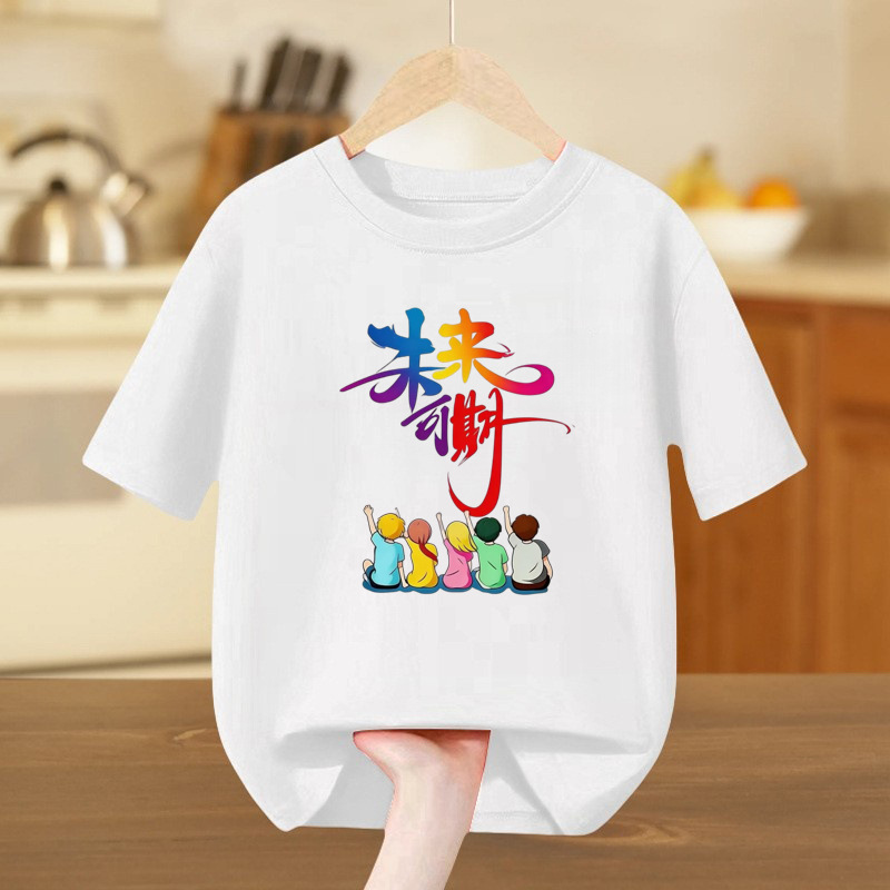 유치원 학부모-아동 활동 수업 옷 2025 여름 반팔 순면 흰색 티셔츠 레인보우 스마일리 6 일 공연 옷