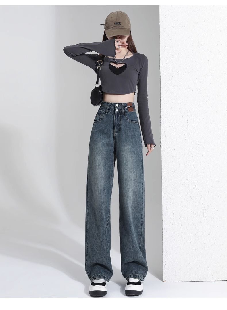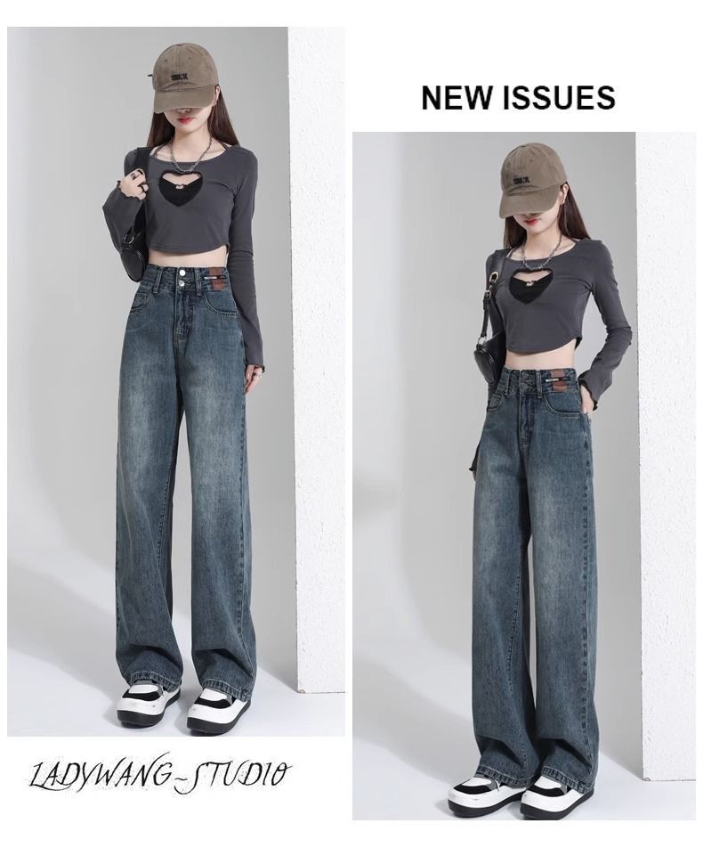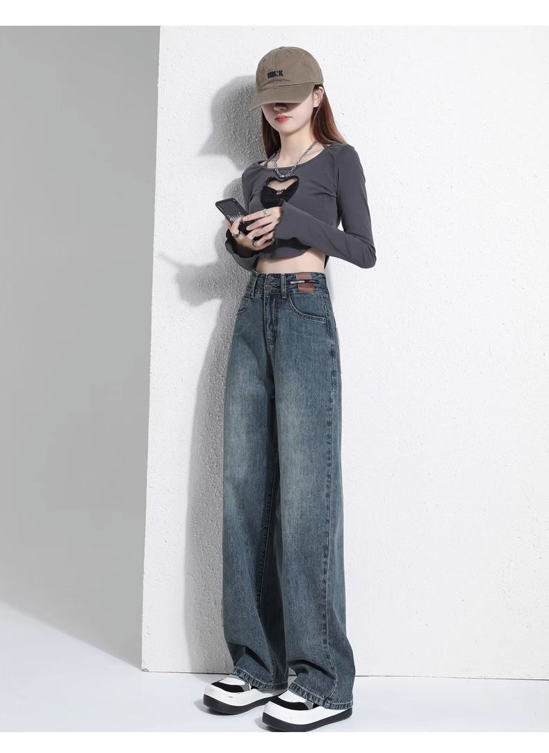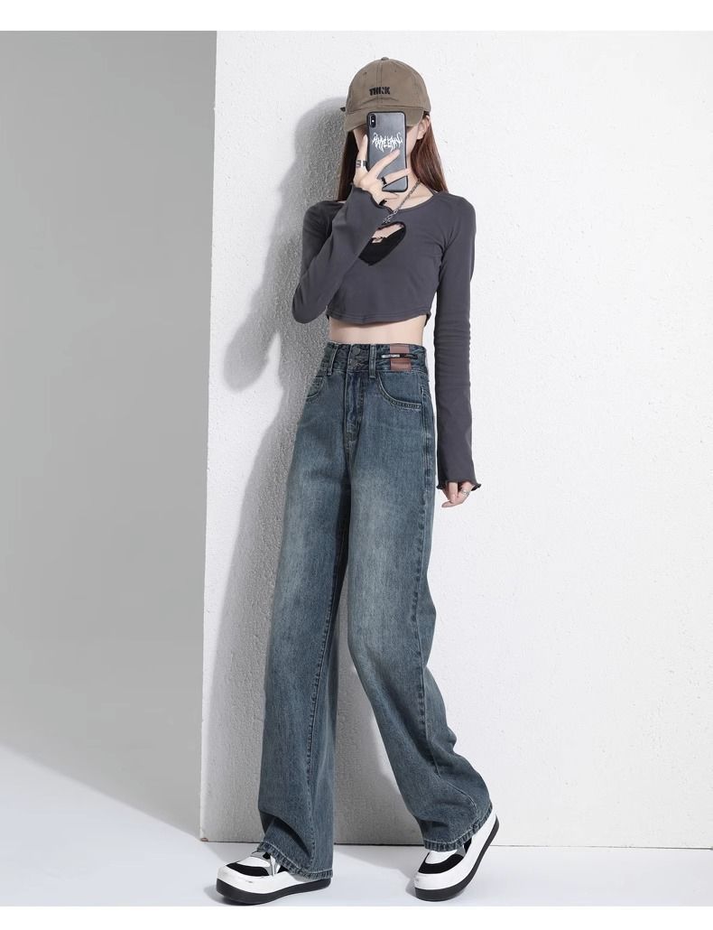 레트로 와이드 레그 청바지 여성용 2026년 신상 봄 가을 슬림핏 슬리밍 효과 큰 사이즈 스트레이트 롱 팬츠스토어 가기
