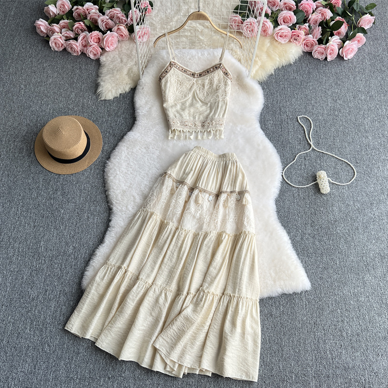 여행 휴가 착용 3 조각 여성 수놓은 술 카미솔 외부 착용 메쉬 긴팔 재킷 스커트스토어 가기