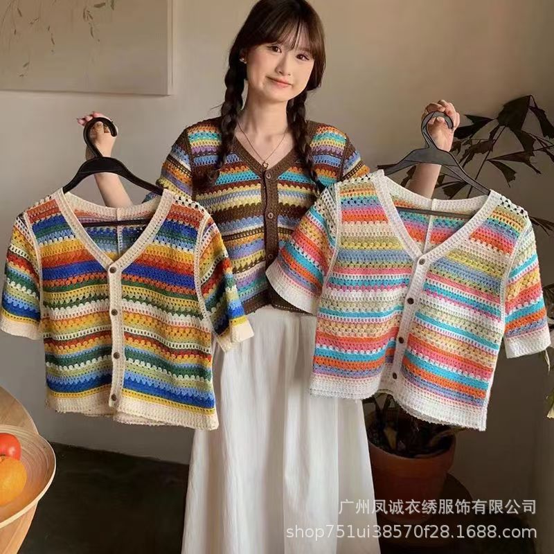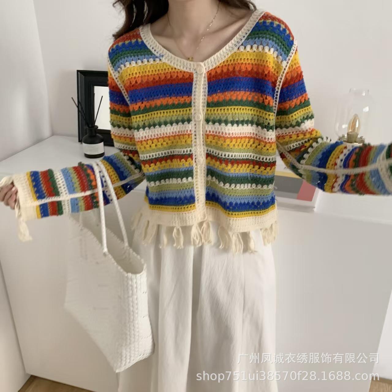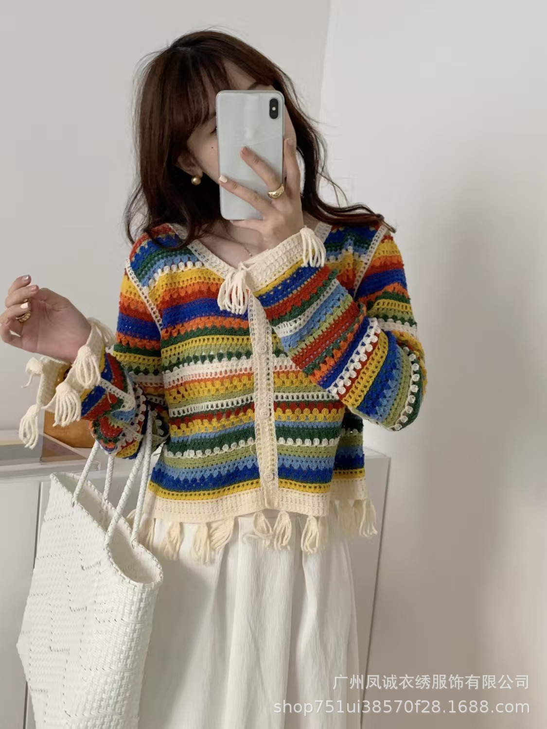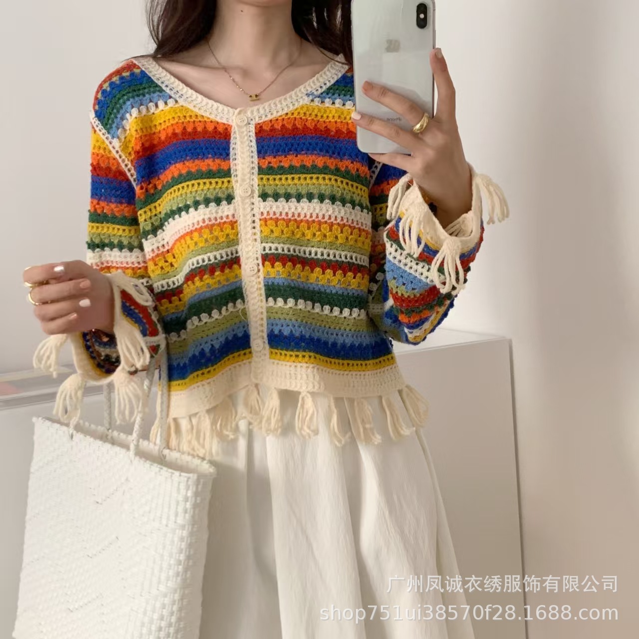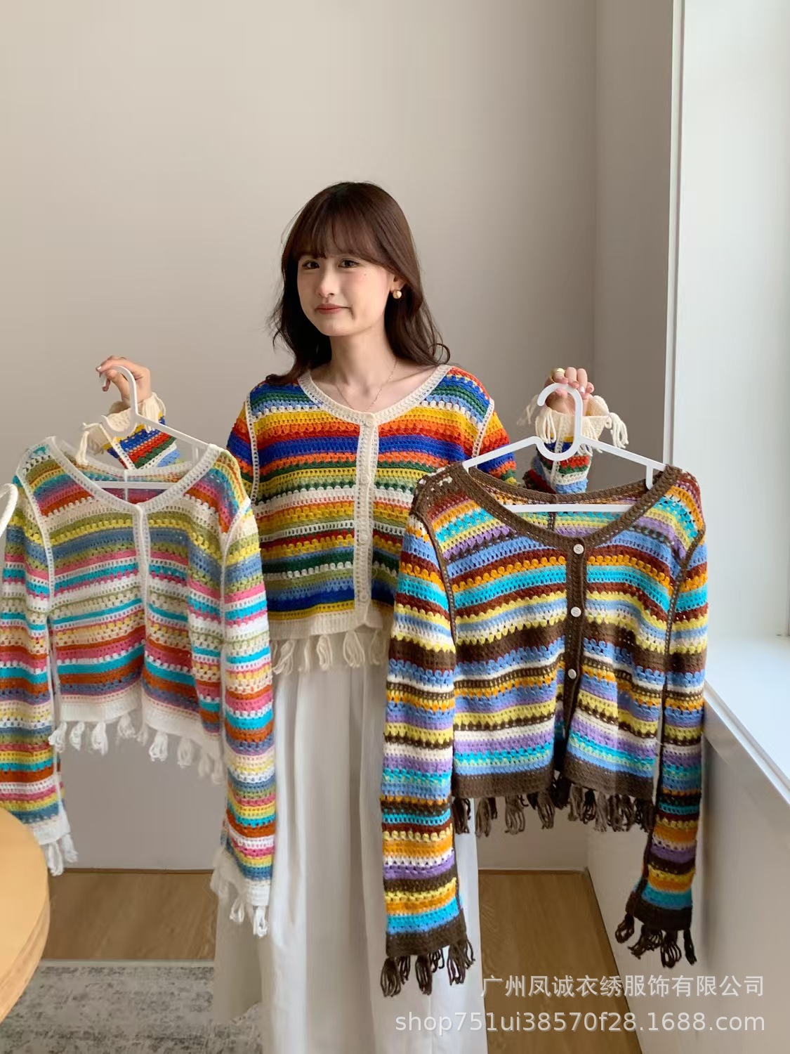 초가을 새로운 레트로 무지개 색 줄무늬 v 넥 니트 카디건 여성 한국 스타일 달콤한 연령 감소 짧은 탑