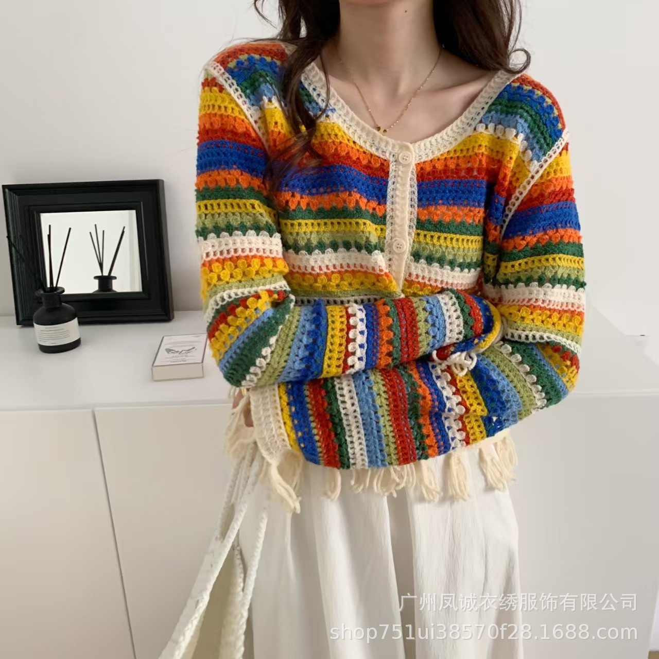 초가을 새로운 레트로 무지개 색 줄무늬 v 넥 니트 카디건 여성 한국 스타일 달콤한 연령 감소 짧은 탑스토어 가기