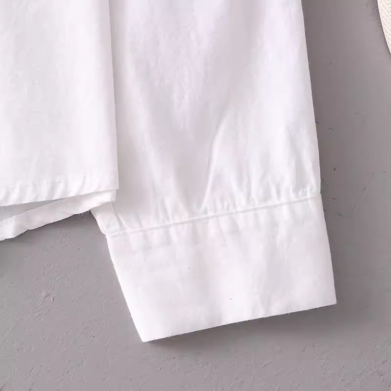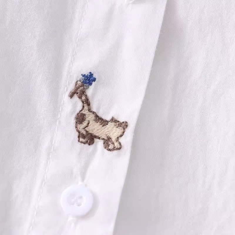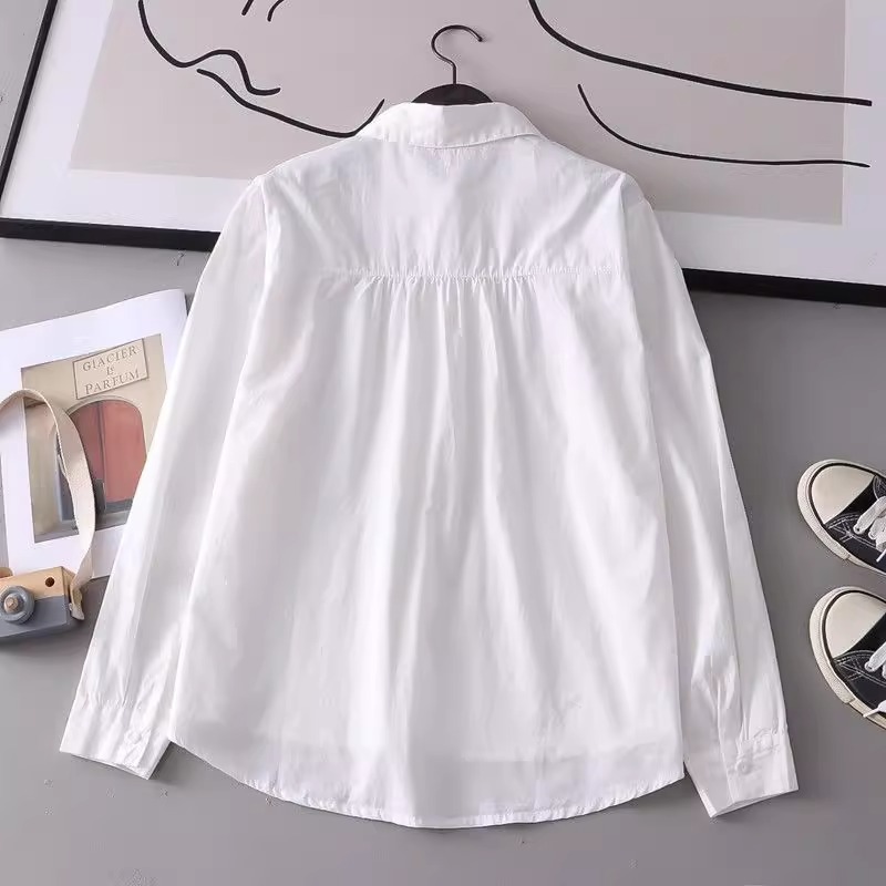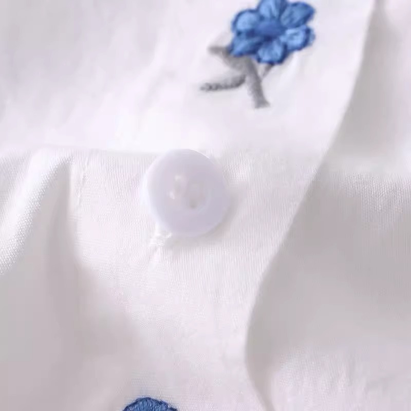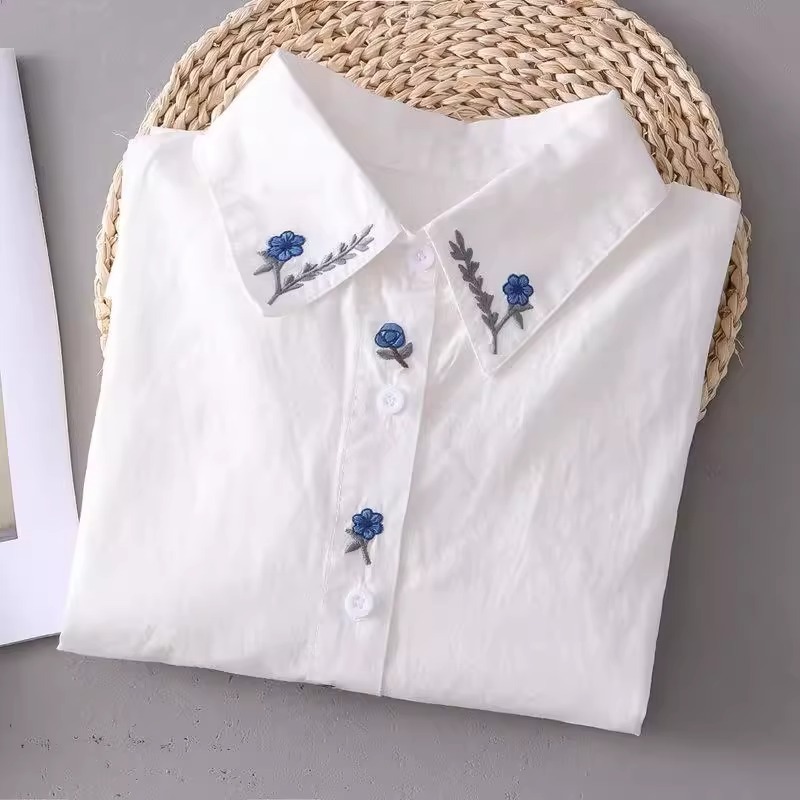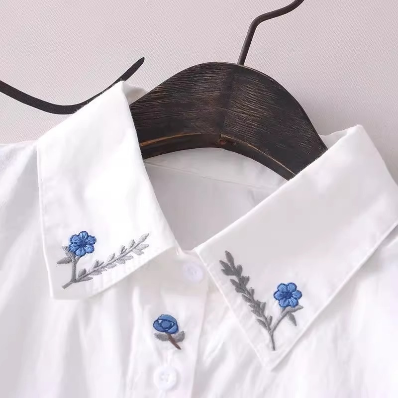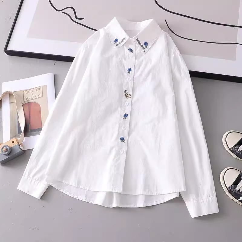 봄과 가을 새로운 자수 파란색 꽃 순수 코튼 긴팔 셔츠 여성 한국 스타일 예술적 다목적 캐주얼 셔츠 탑