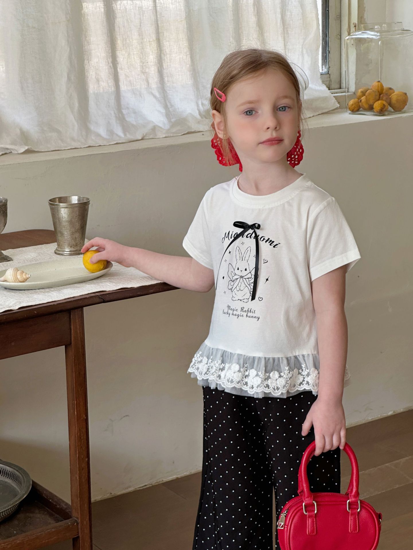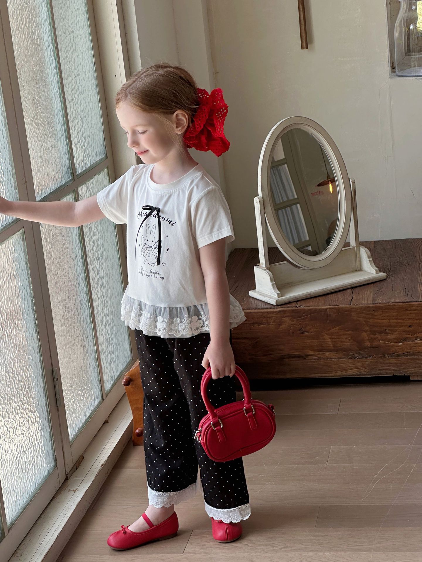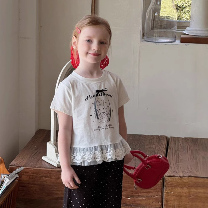 소녀의 인쇄 티셔츠 2025 여름 어린이 만화 토끼 짧은 소매 아기의 귀여운 레이스 바느질 탑