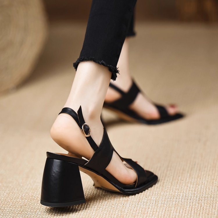 여름 오픈 발가락 로마 여성 신발 새로운 복고풍 패션 편안한 샌들 두꺼운 뒤꿈치 높이 다크 브라운 버클 하이힐 증가스토어 가기