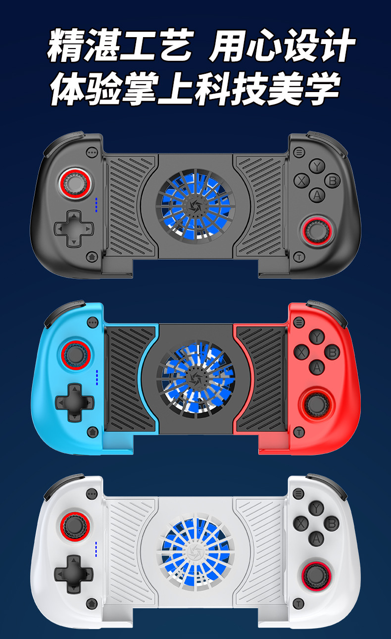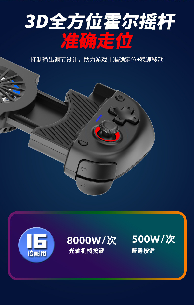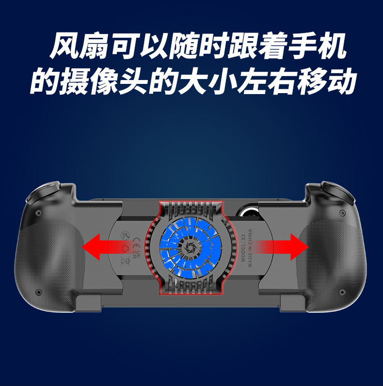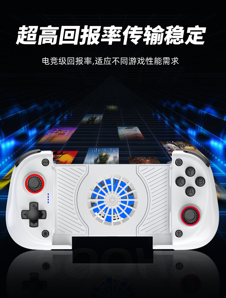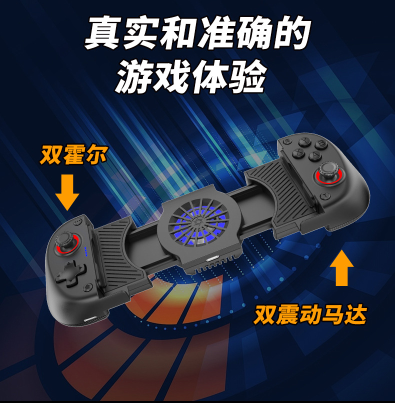 1.二合一散热风扇拉伸游戏手柄,本产品采用人体工学设计,手感舒适,操作灵敏,采用高端电子元器件组成。产品支持所有市场上型号的手机,同时具备自动识别功能。玩家在玩游戏过程中运行二合一散热风扇,彻底解决了玩游戏时手机发烫,手机电池寿命问题困扰,大大提高了游戏玩家在游戏中的体验和喜悦,增长了手机电池使用寿命。