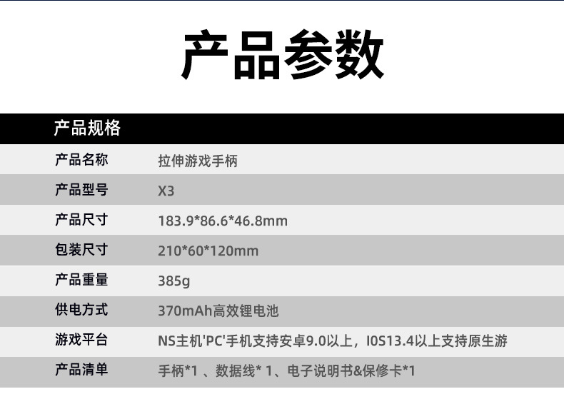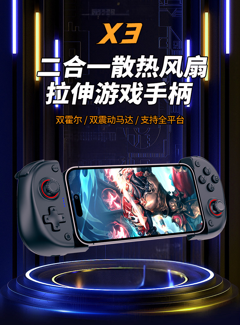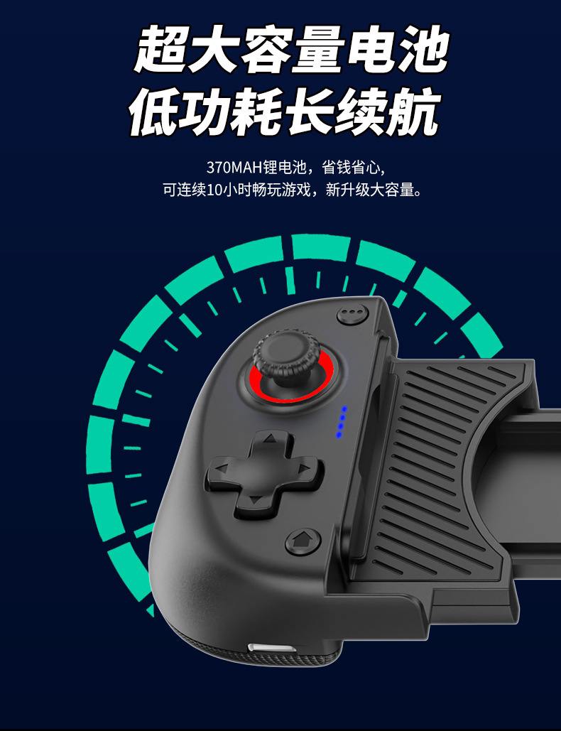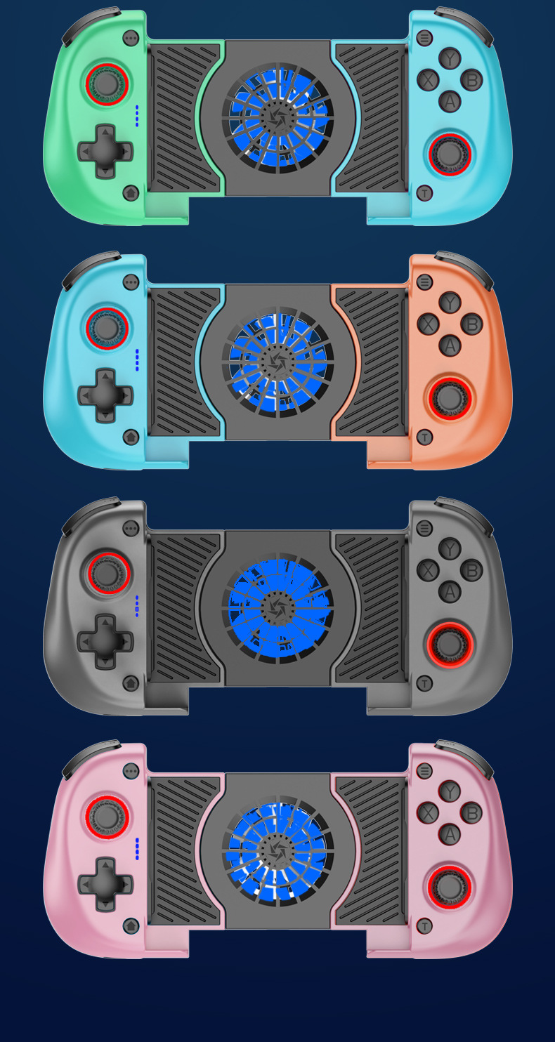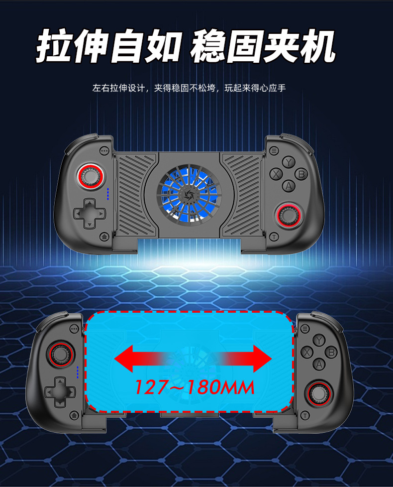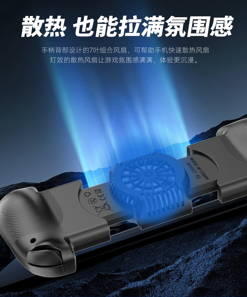 1.二合一散热风扇拉伸游戏手柄,本产品采用人体工学设计,手感舒适,操作灵敏,采用高端电子元器件组成。产品支持所有市场上型号的手机,同时具备自动识别功能。玩家在玩游戏过程中运行二合一散热风扇,彻底解决了玩游戏时手机发烫,手机电池寿命问题困扰,大大提高了游戏玩家在游戏中的体验和喜悦,增长了手机电池使用寿命。