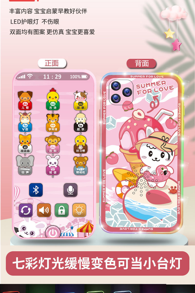 • [블루투스 단면 버전] 핑크 휴대폰 + 휴대폰 케이스 - 유아 교육용 다채로운 눈 보호 램프 시계 포함 [무료 배터리]
