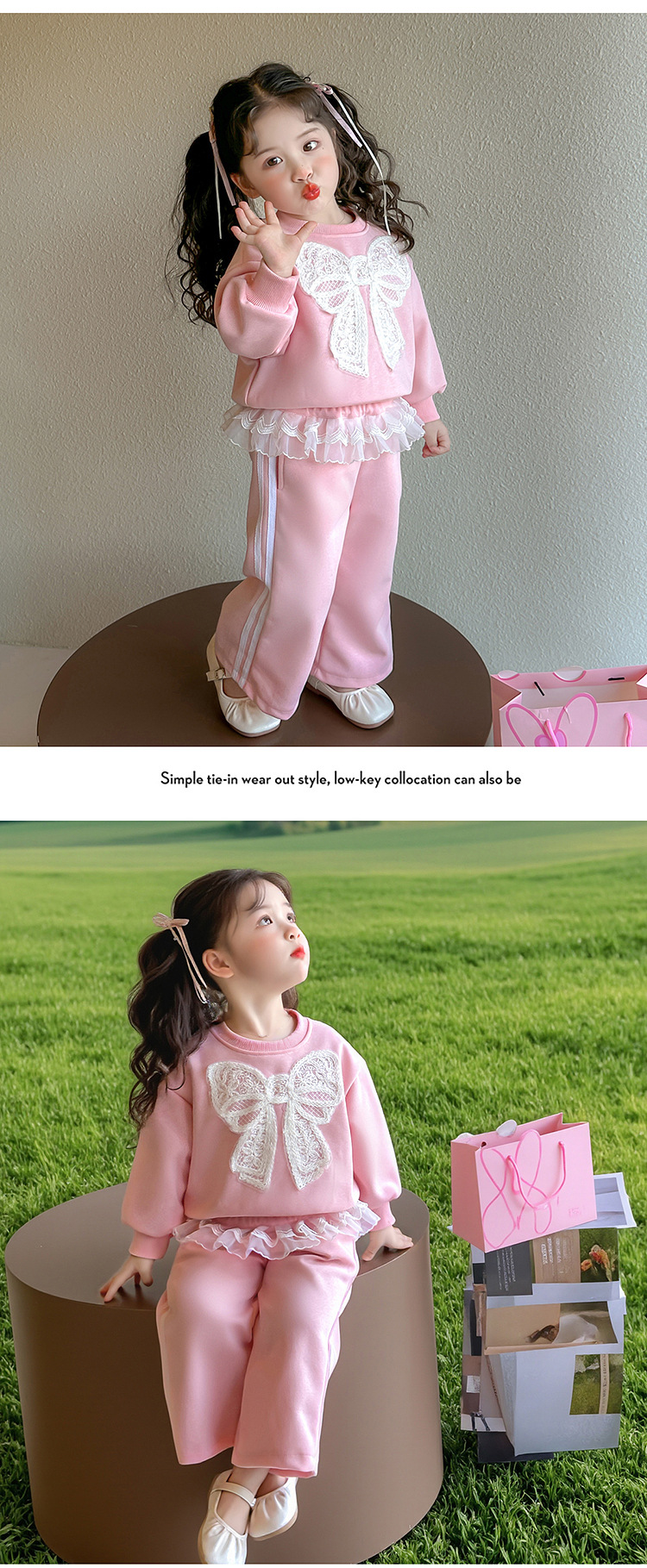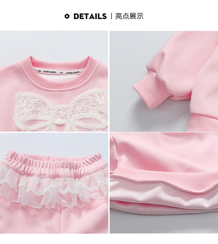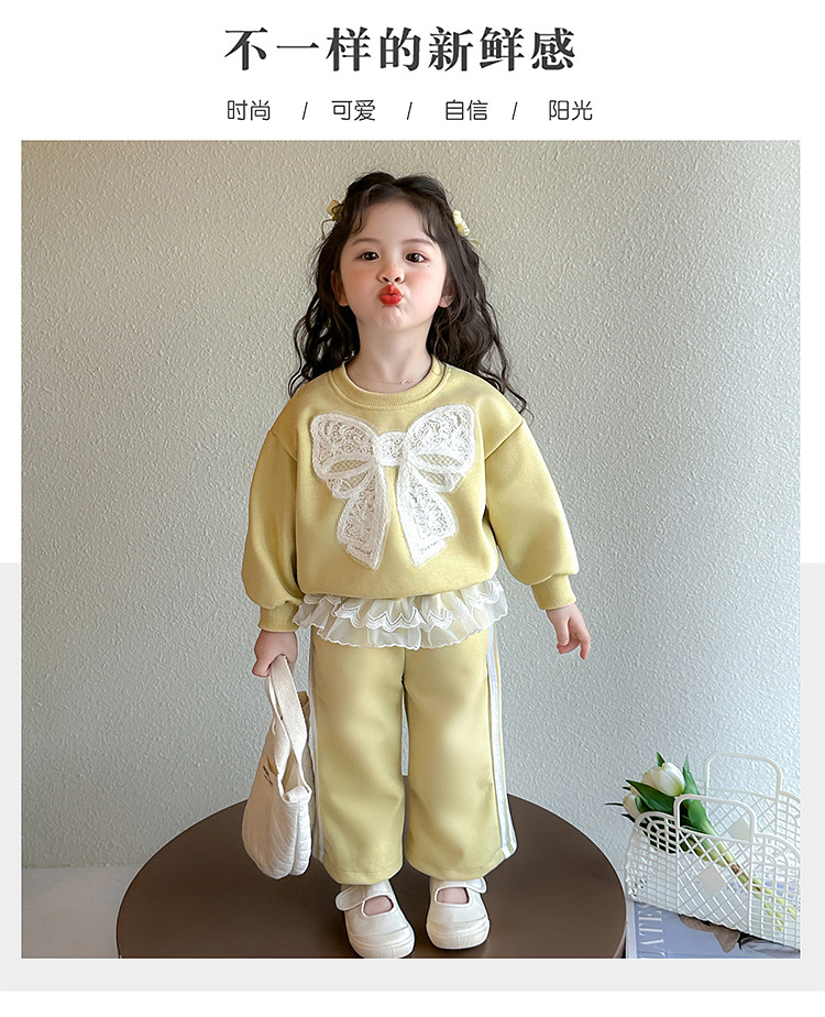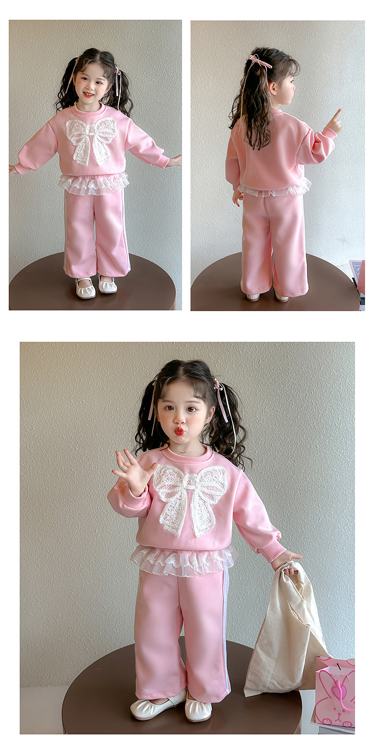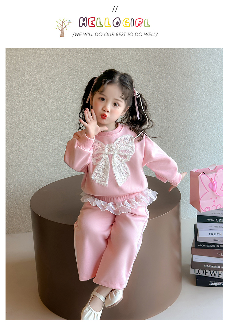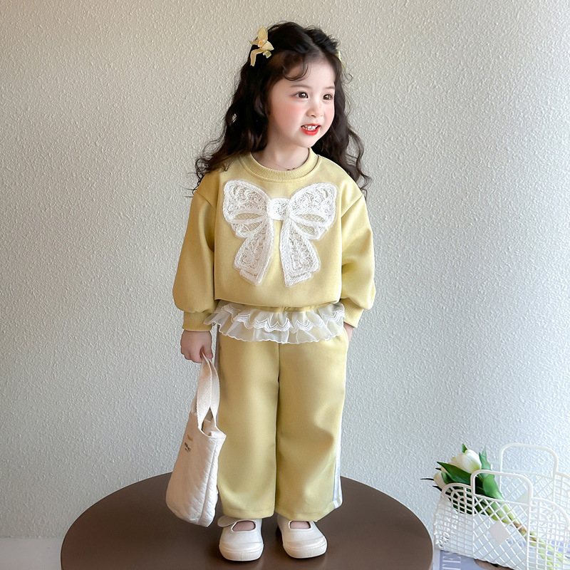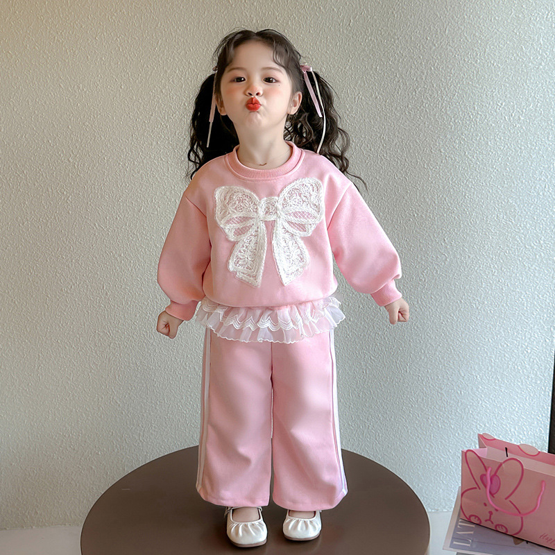 여아 정장 2025 봄 가을 새로운 스타일 여아 레이스 보우 스웨트 셔츠 중소형 어린이 투피스 세트스토어 가기
