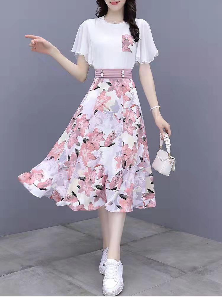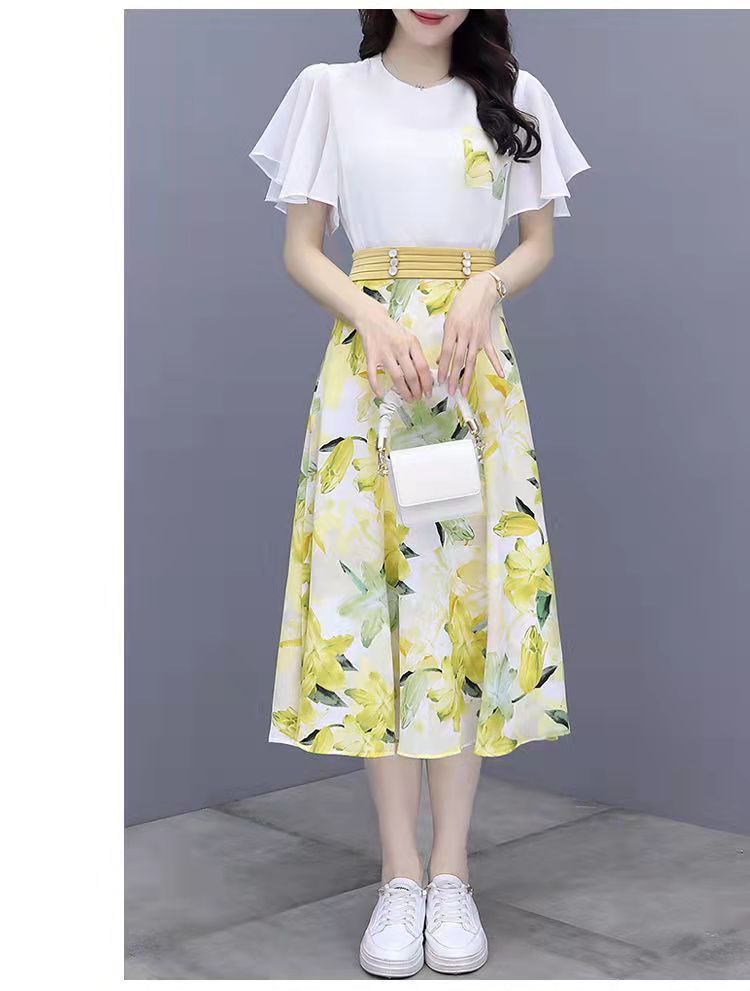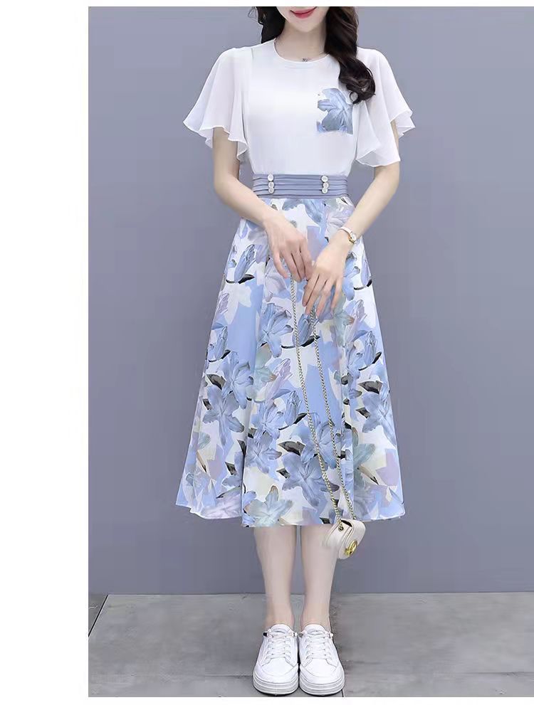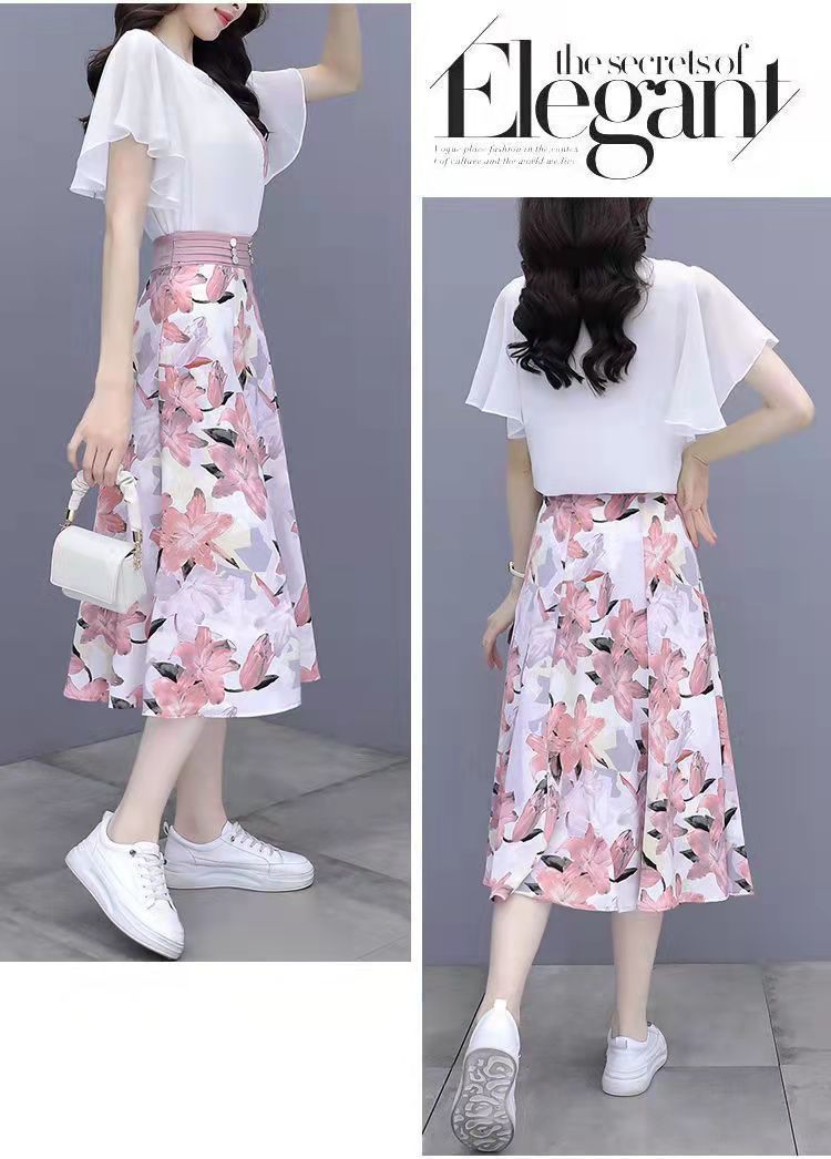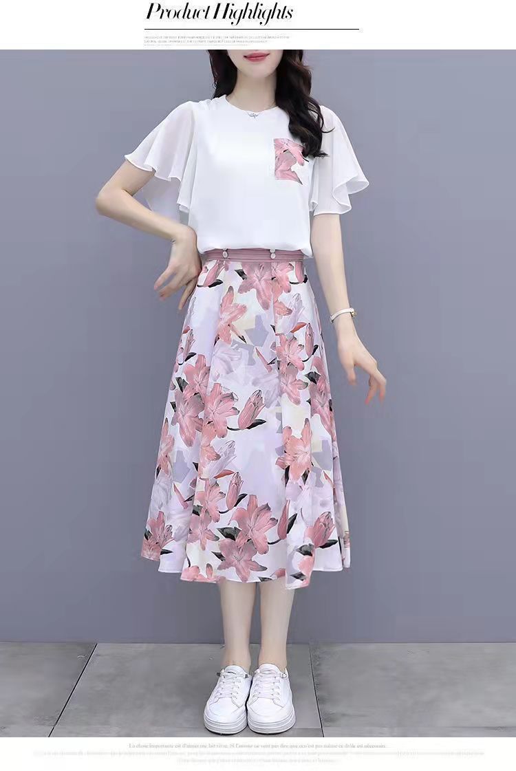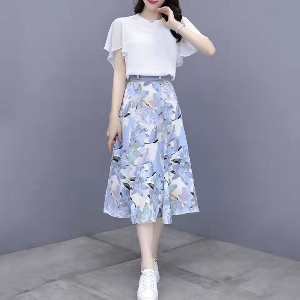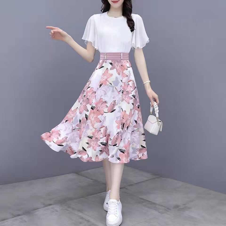 2025년 여름 여성을 위한 크로스보더 쉬폰 드레스 패셔너블하고 슬림하며 인기 있는 꽃무늬 스커트 투피스 세트