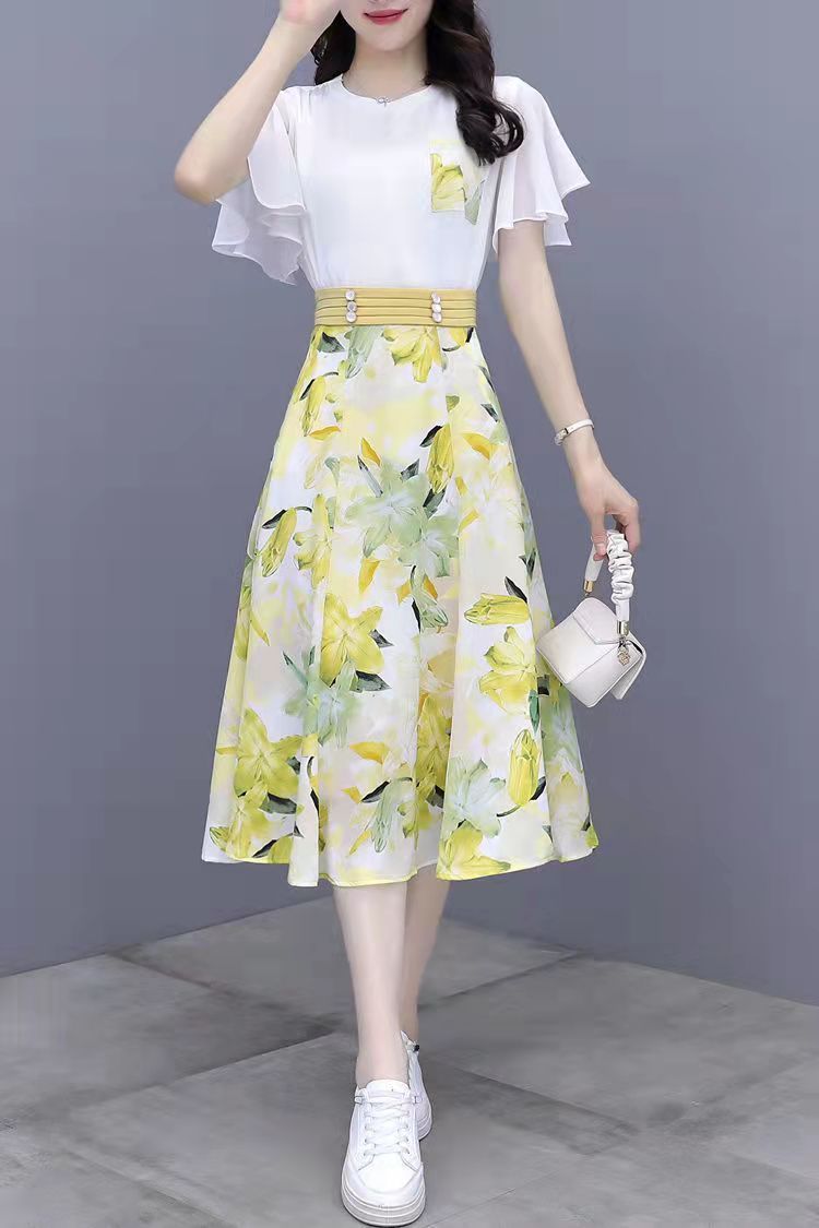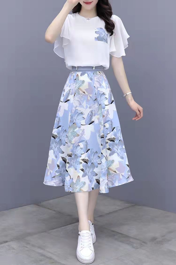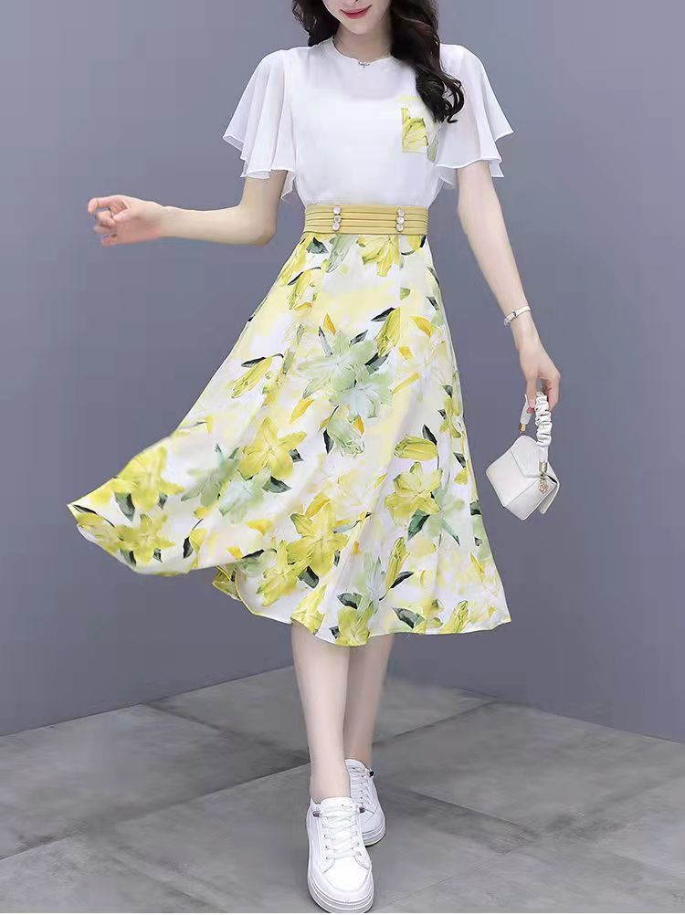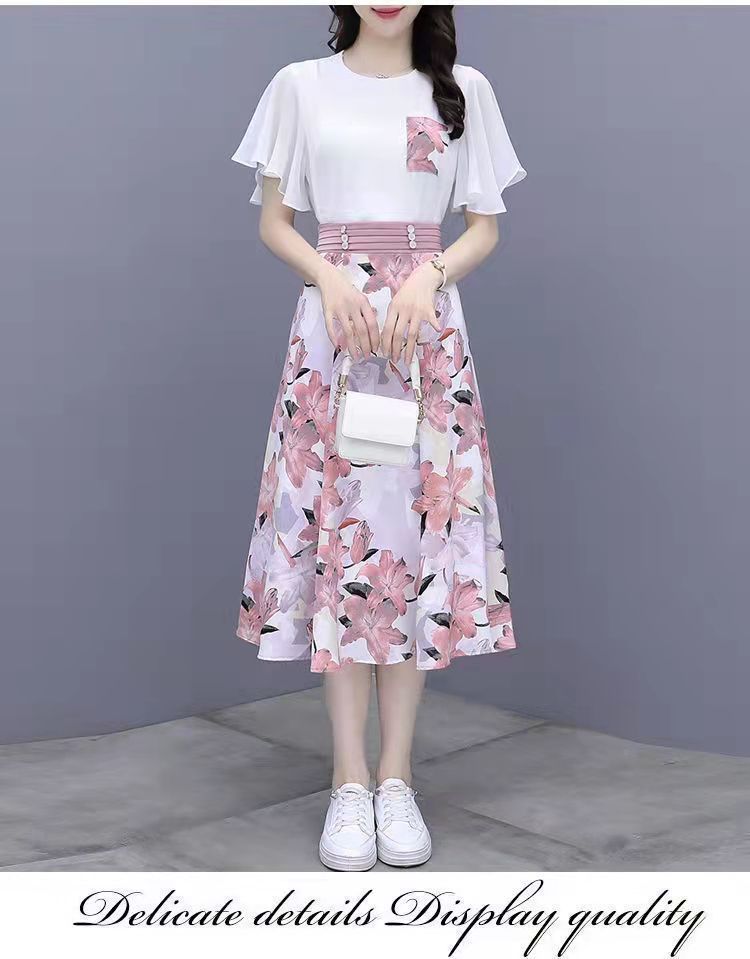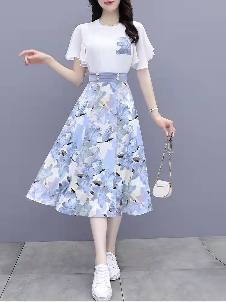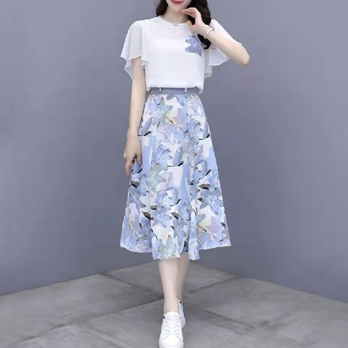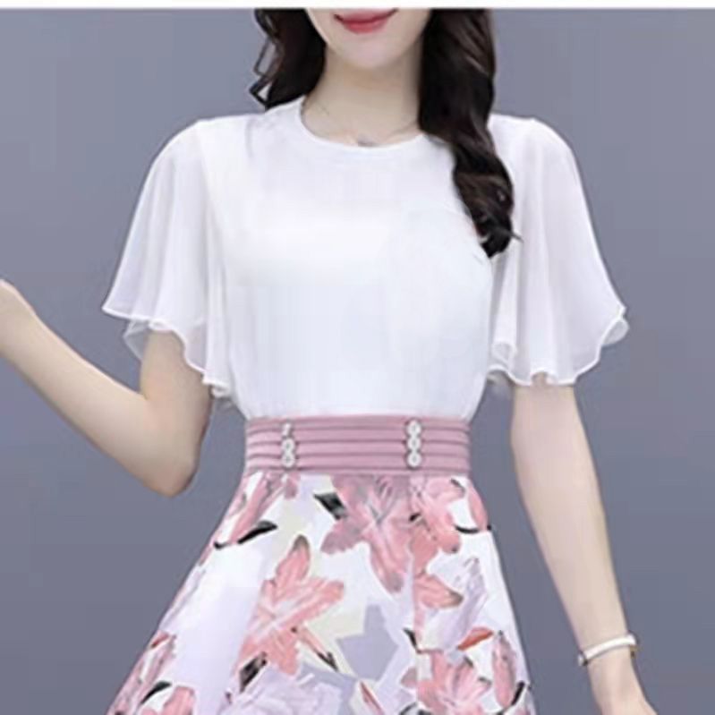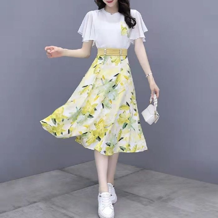 2025년 여름 여성을 위한 크로스보더 쉬폰 드레스 패셔너블하고 슬림하며 인기 있는 꽃무늬 스커트 투피스 세트
