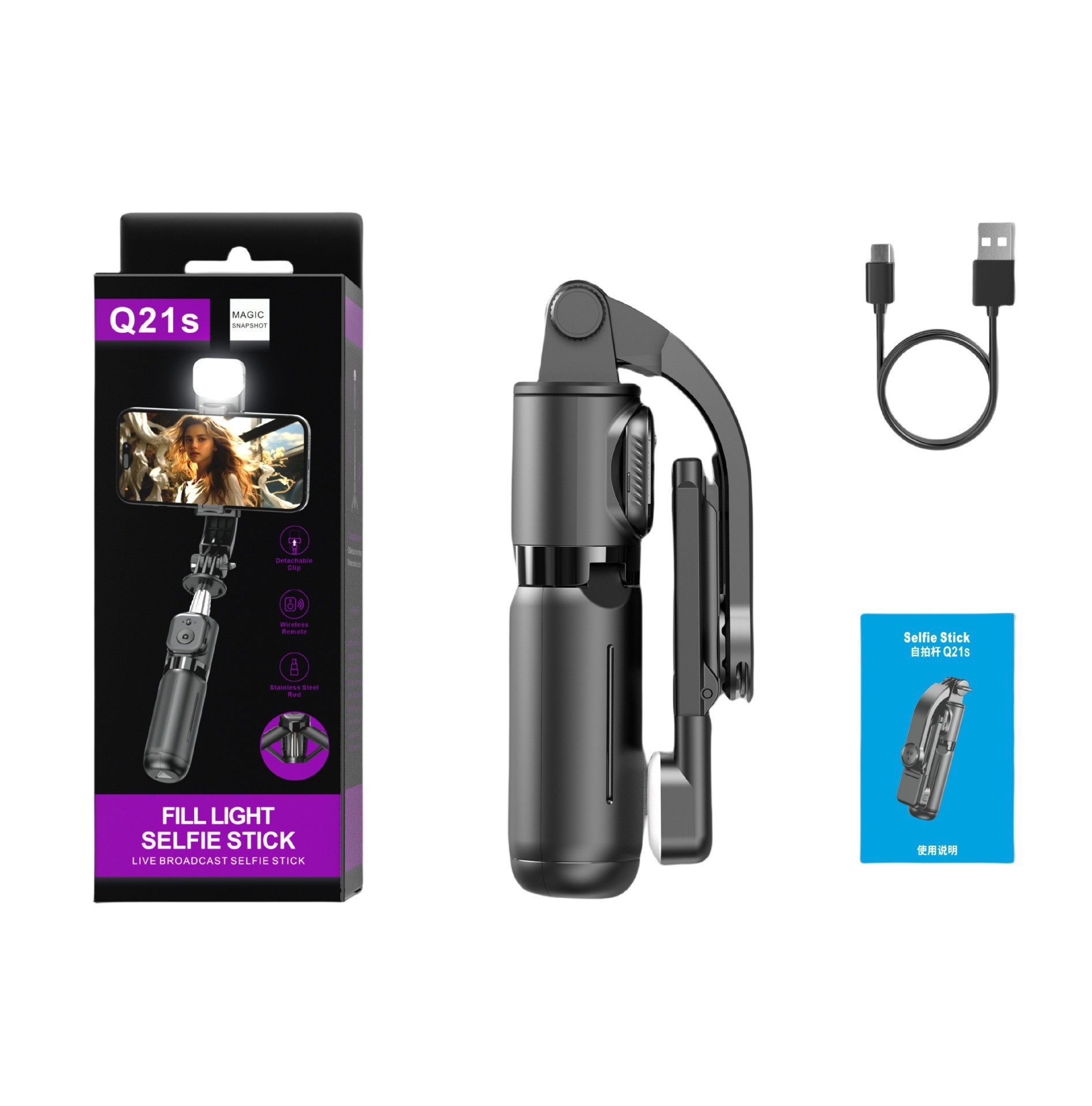 • Q21S 블랙 싱글 라이트 모델 0.7m 스테인레스 스틸 바디 + 블루투스 리모컨 + 뷰티 필 라이트 + 미니 삼각대