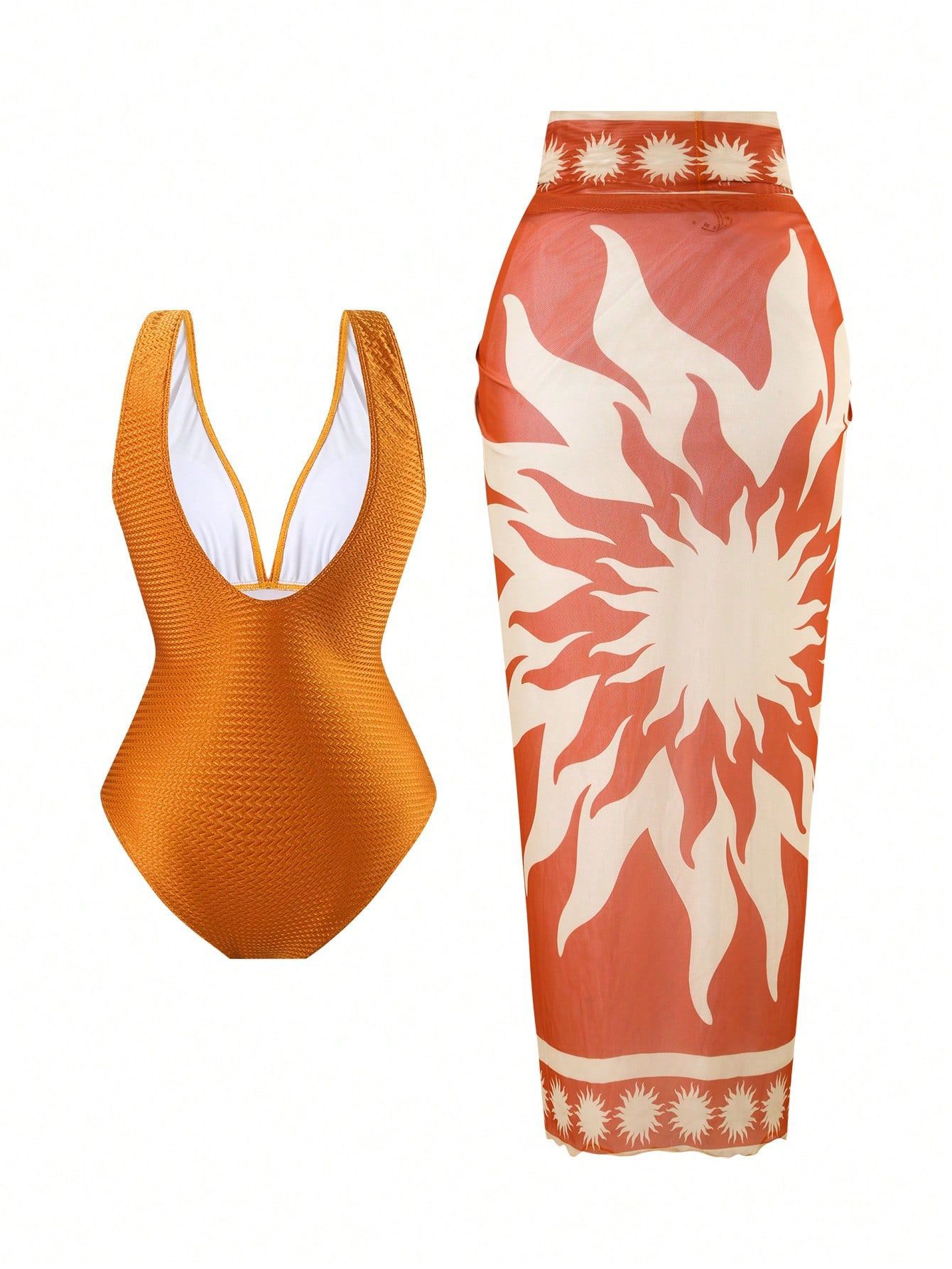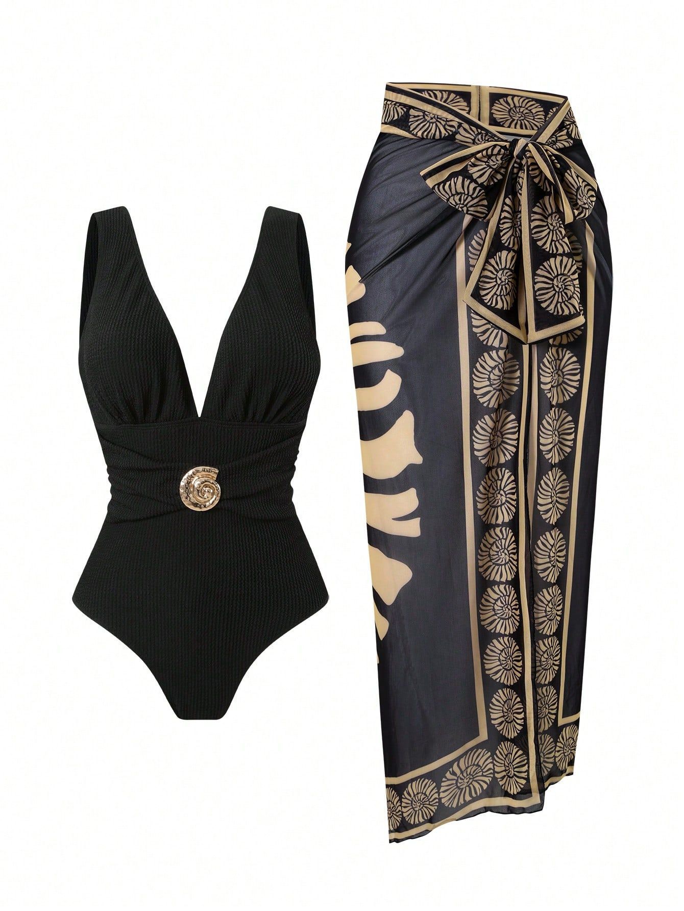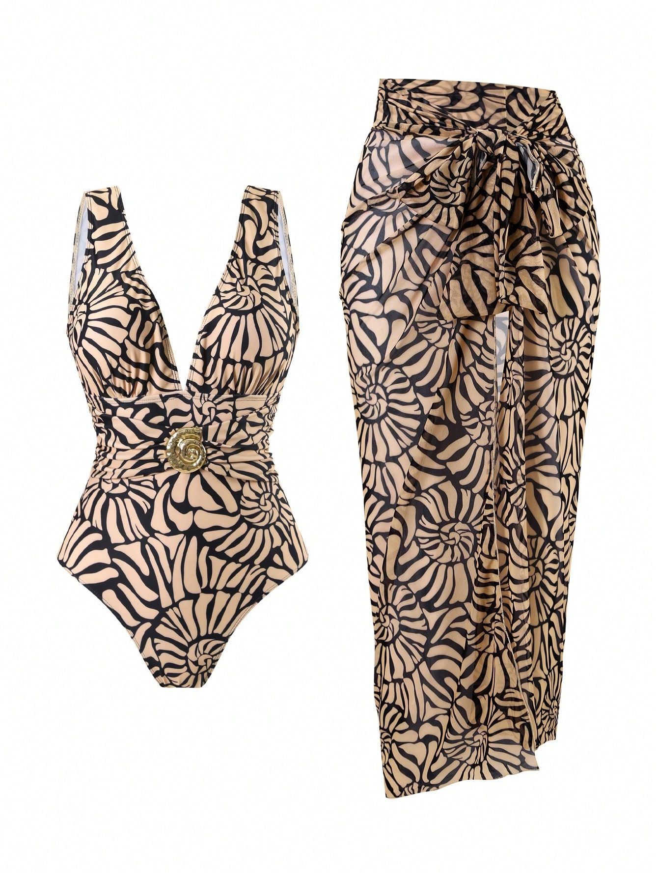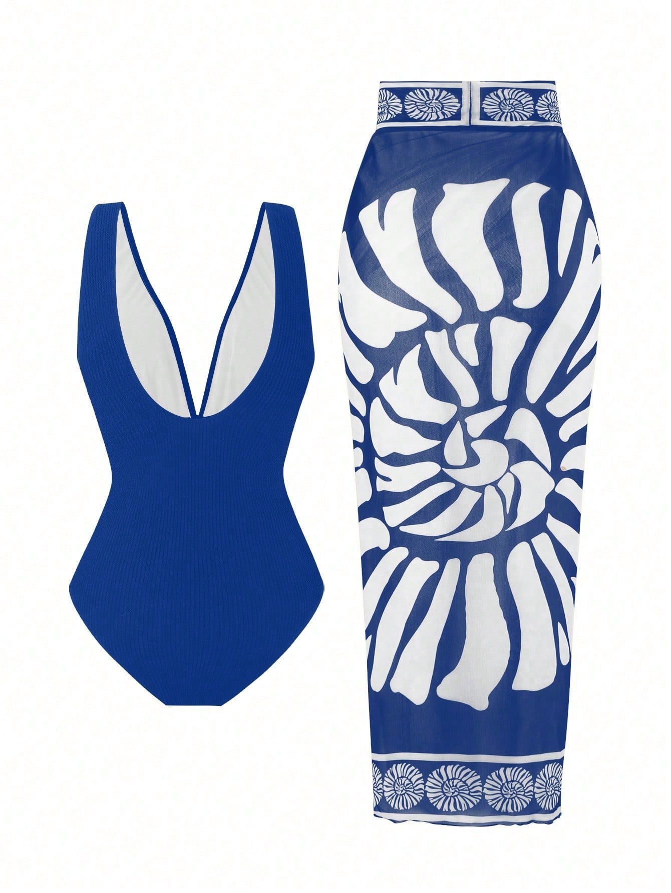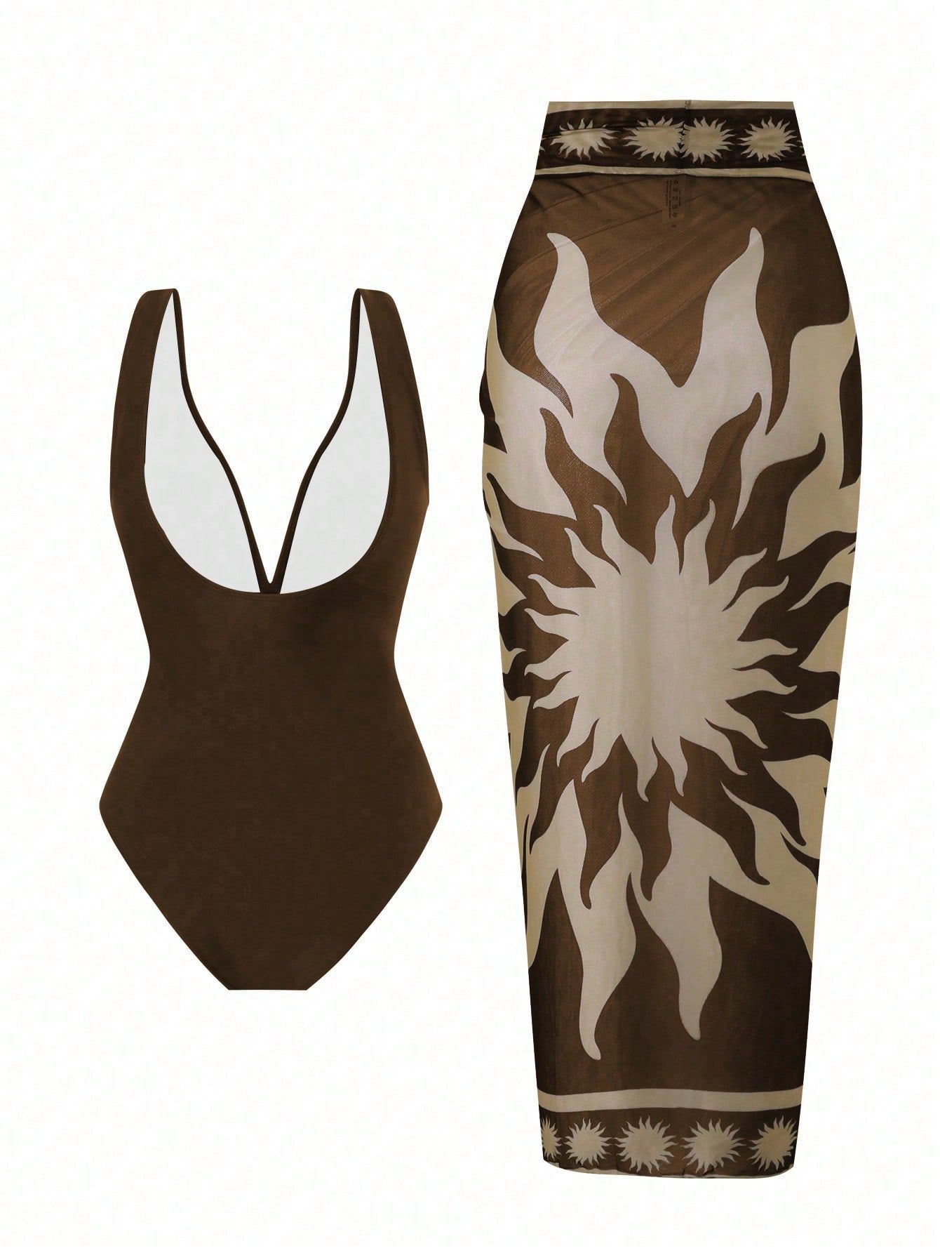 2025 Amazon 새로운 원피스 딥 V 섹시한 수영복 프렌치 레트로 프린트 온천 리조트 비치 스커트 슈트