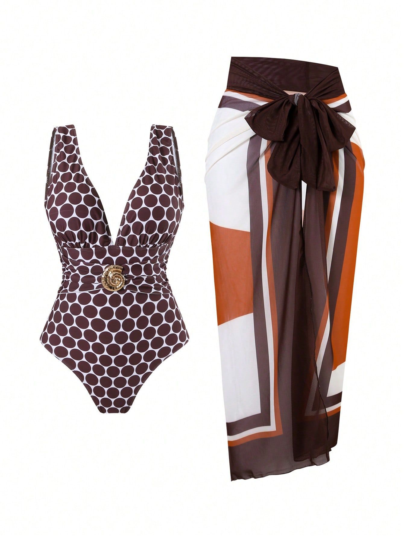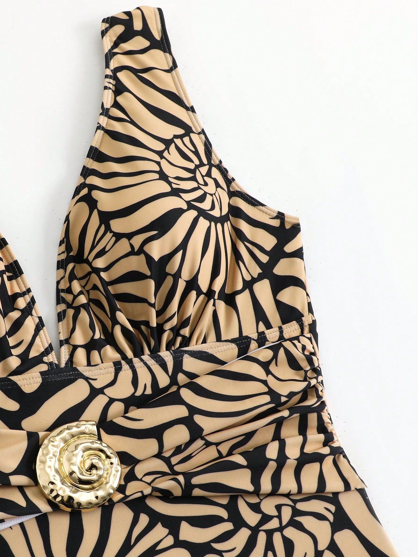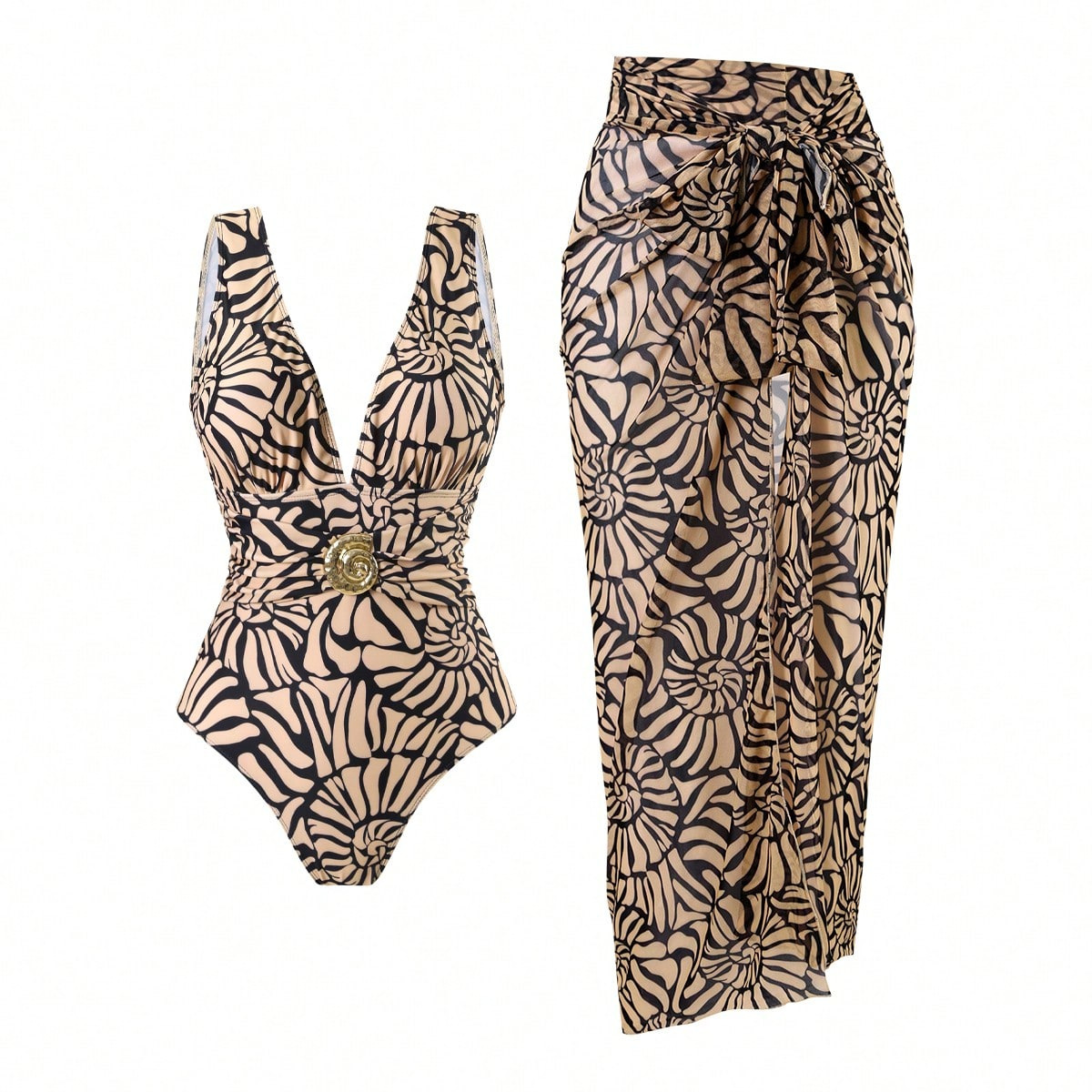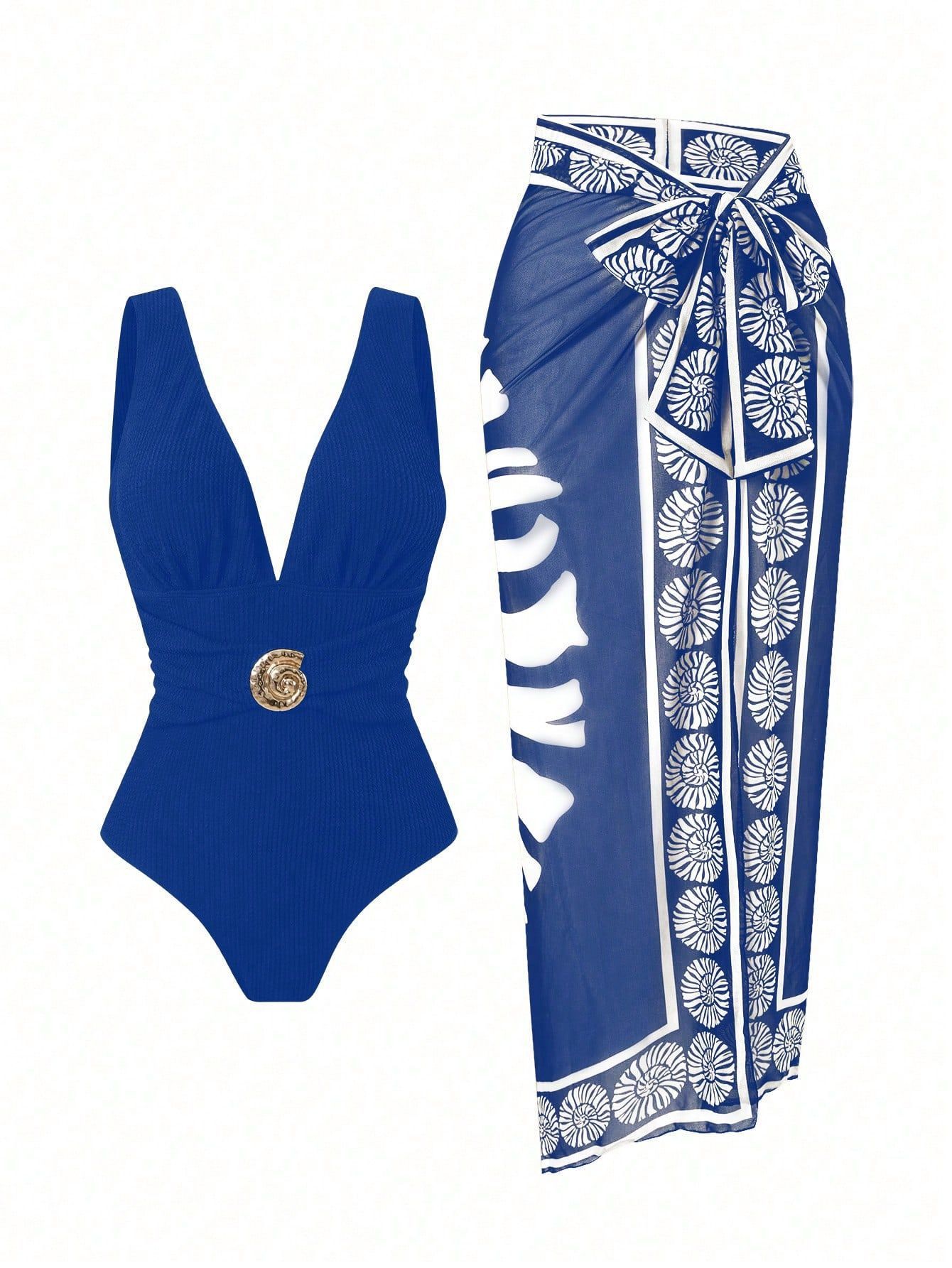 2025 Amazon 새로운 원피스 딥 V 섹시한 수영복 프렌치 레트로 프린트 온천 리조트 비치 스커트 슈트