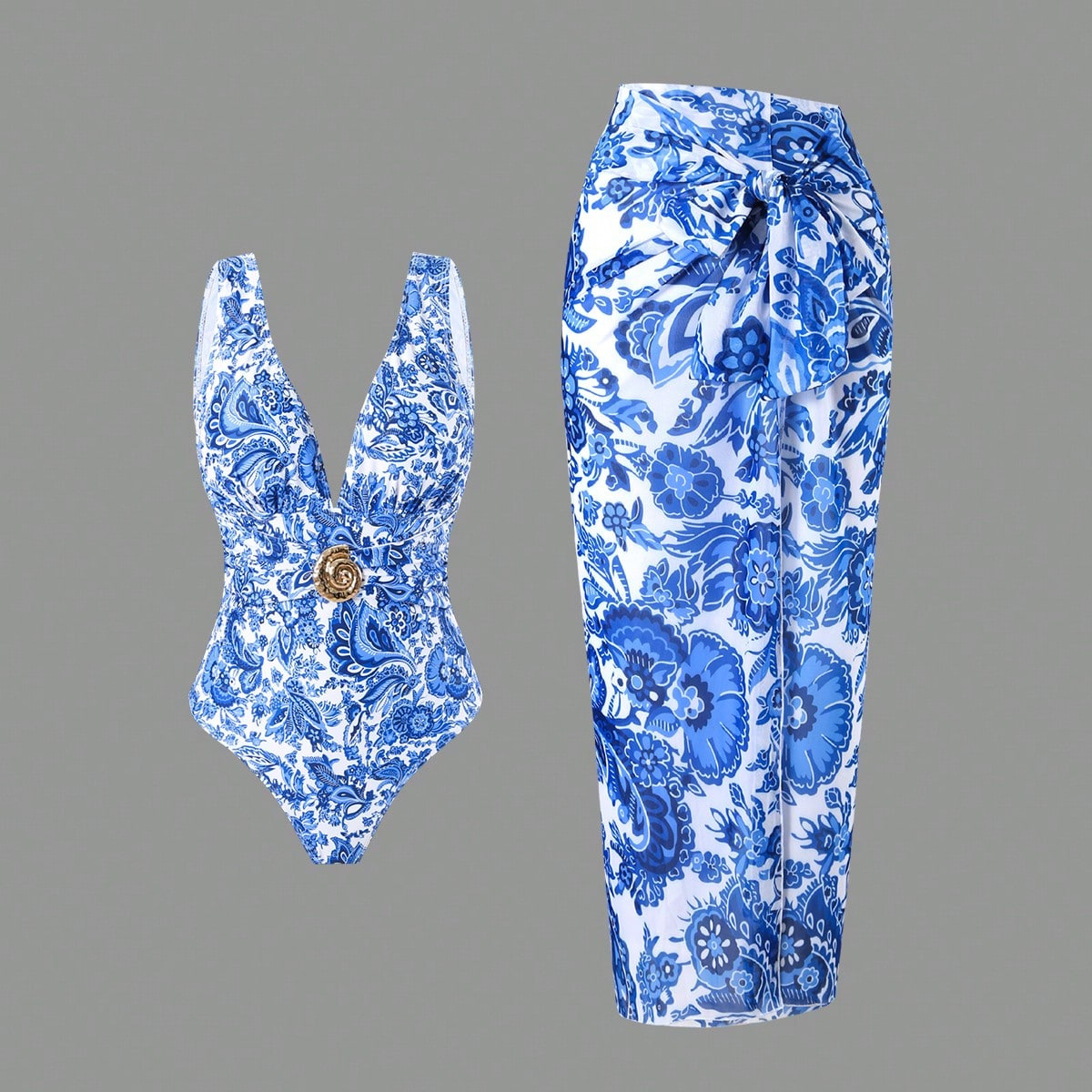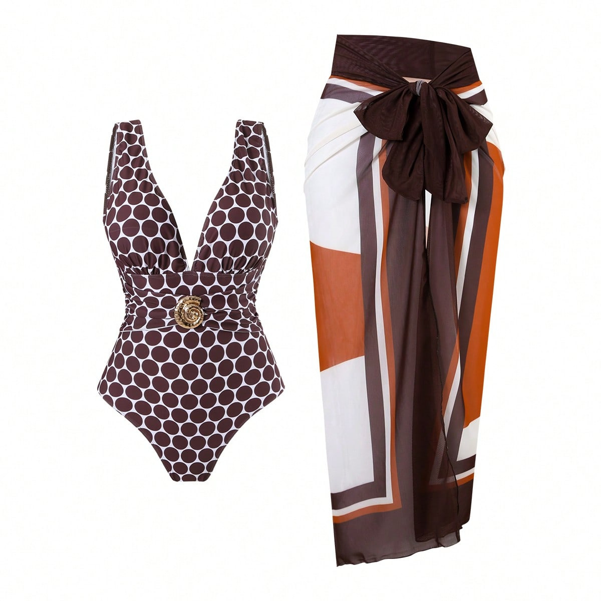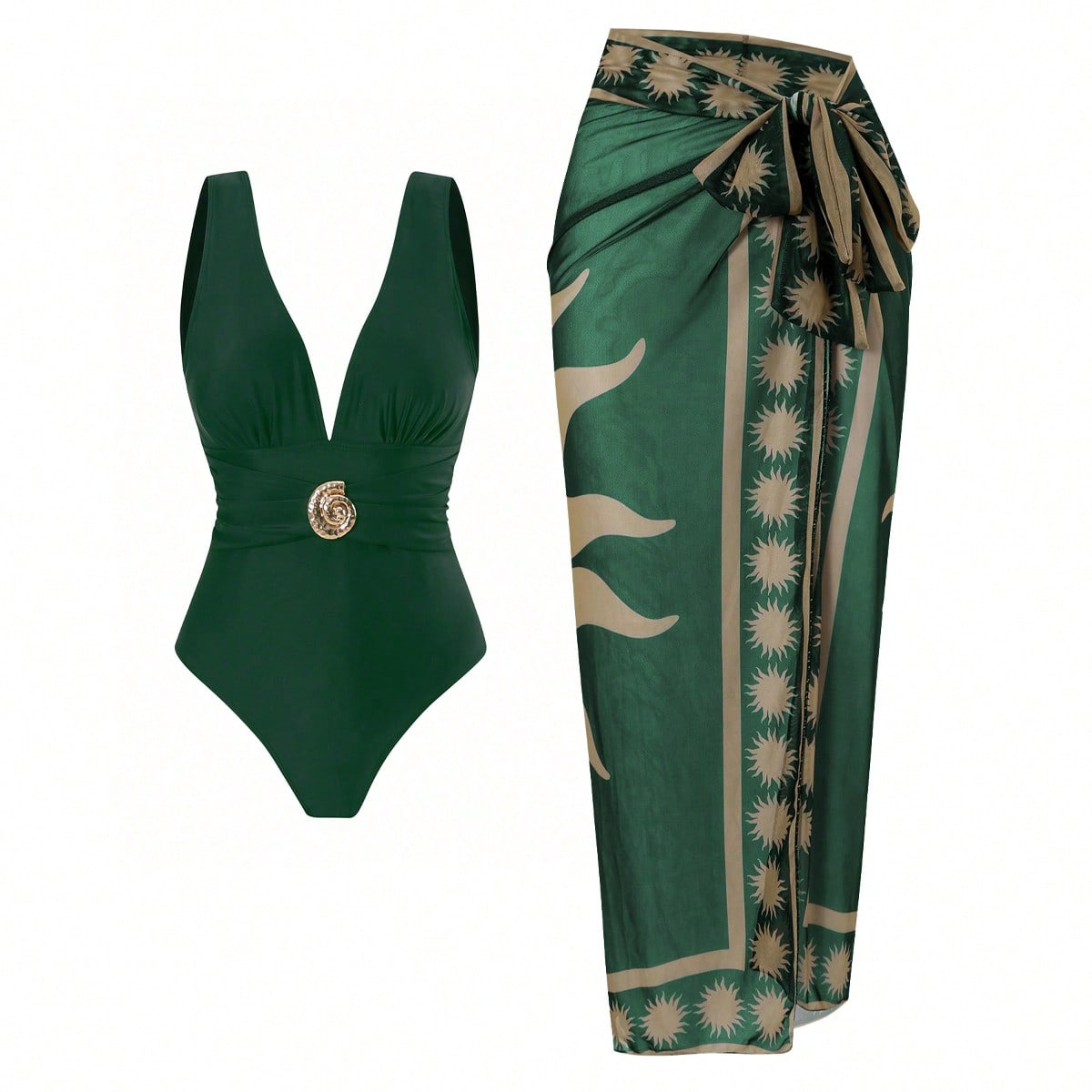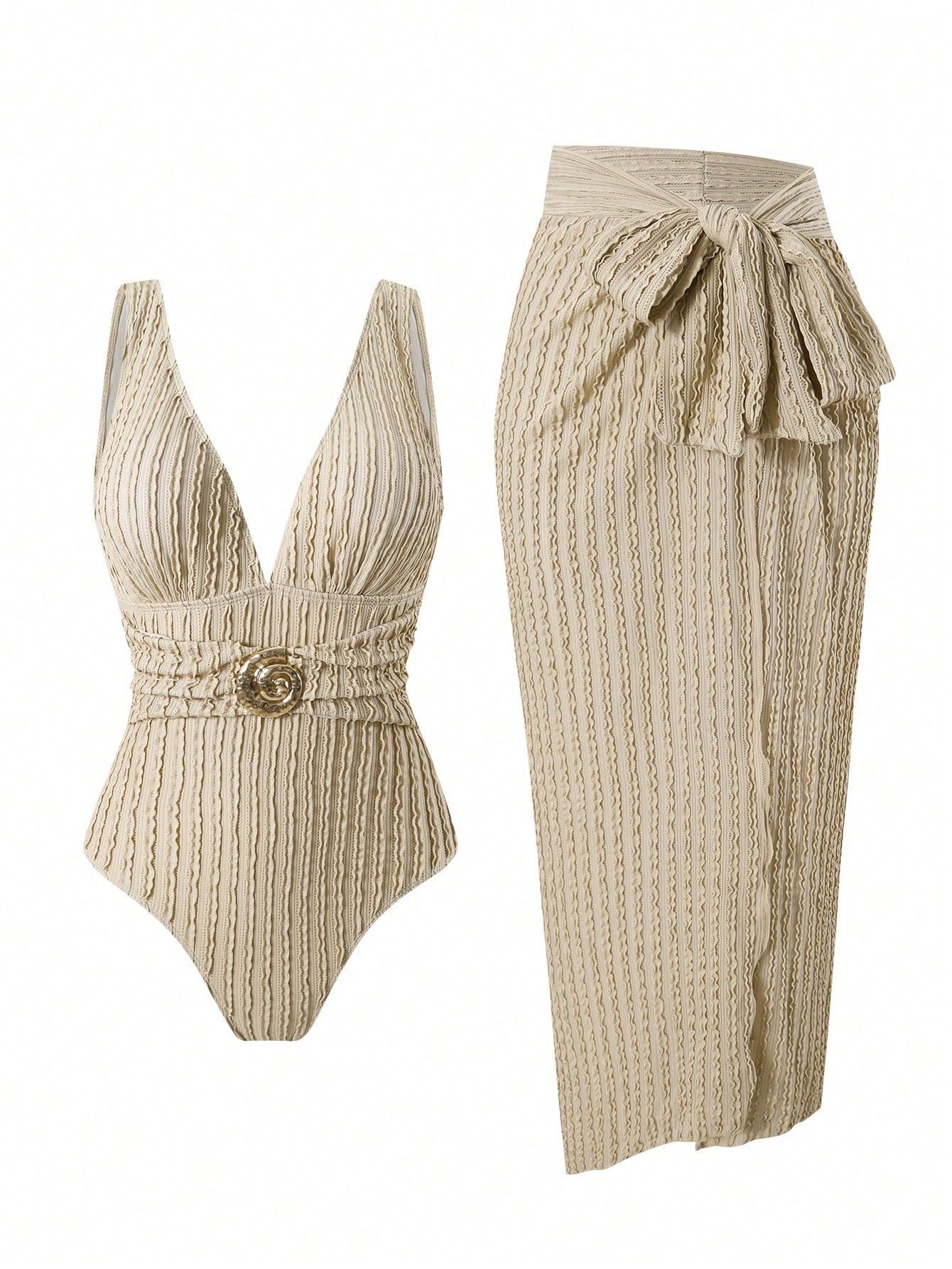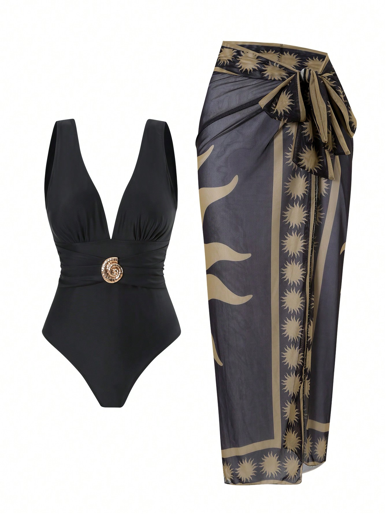 2025 Amazon 새로운 원피스 딥 V 섹시한 수영복 프렌치 레트로 프린트 온천 리조트 비치 스커트 슈트