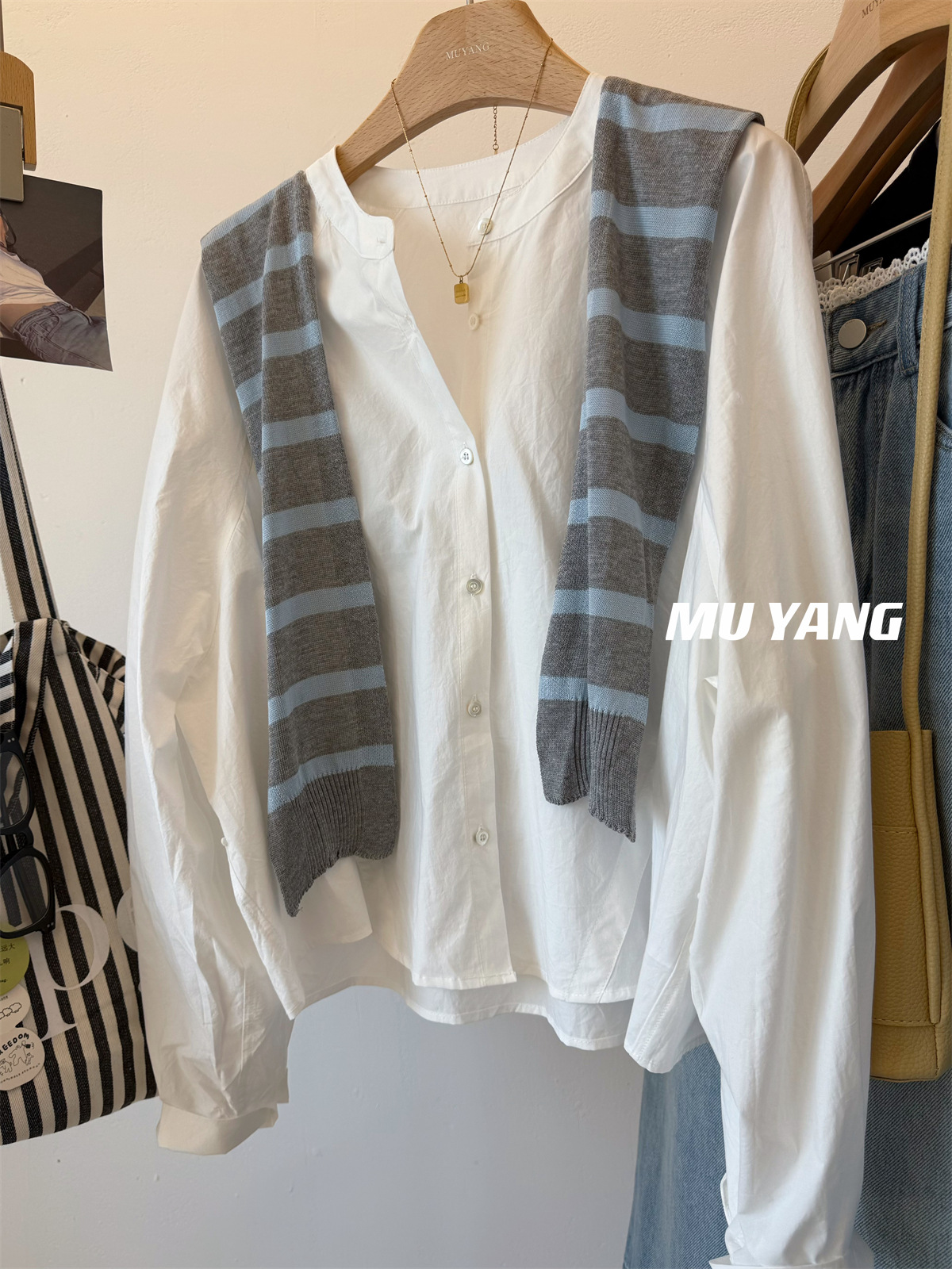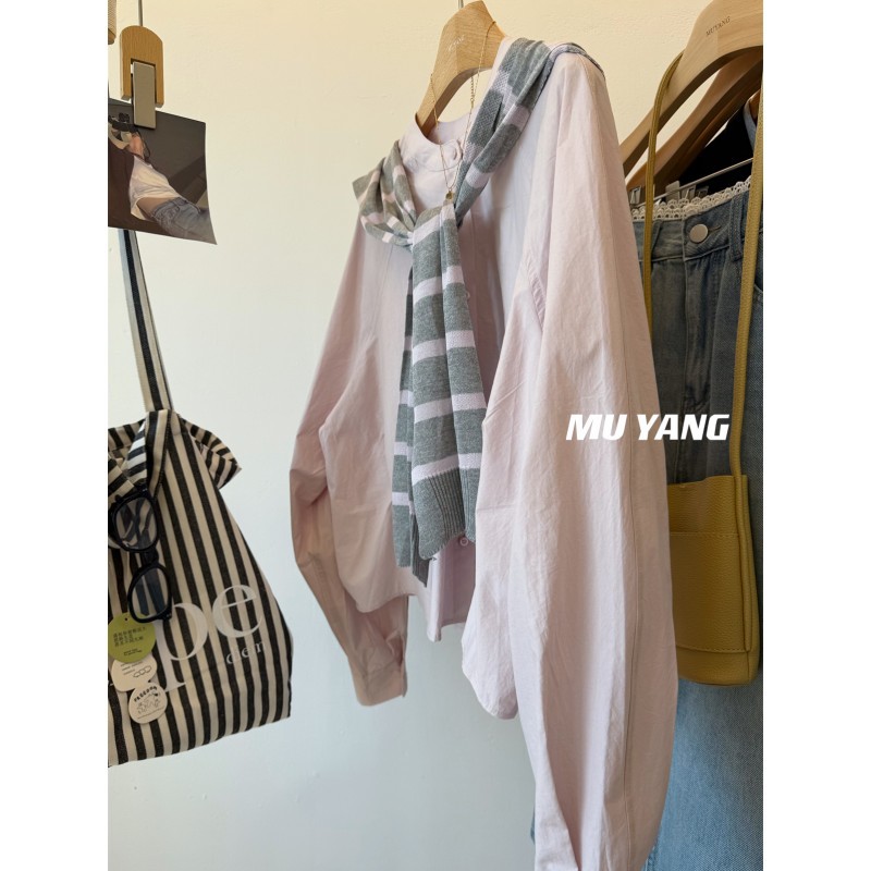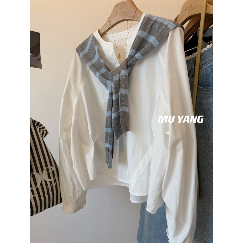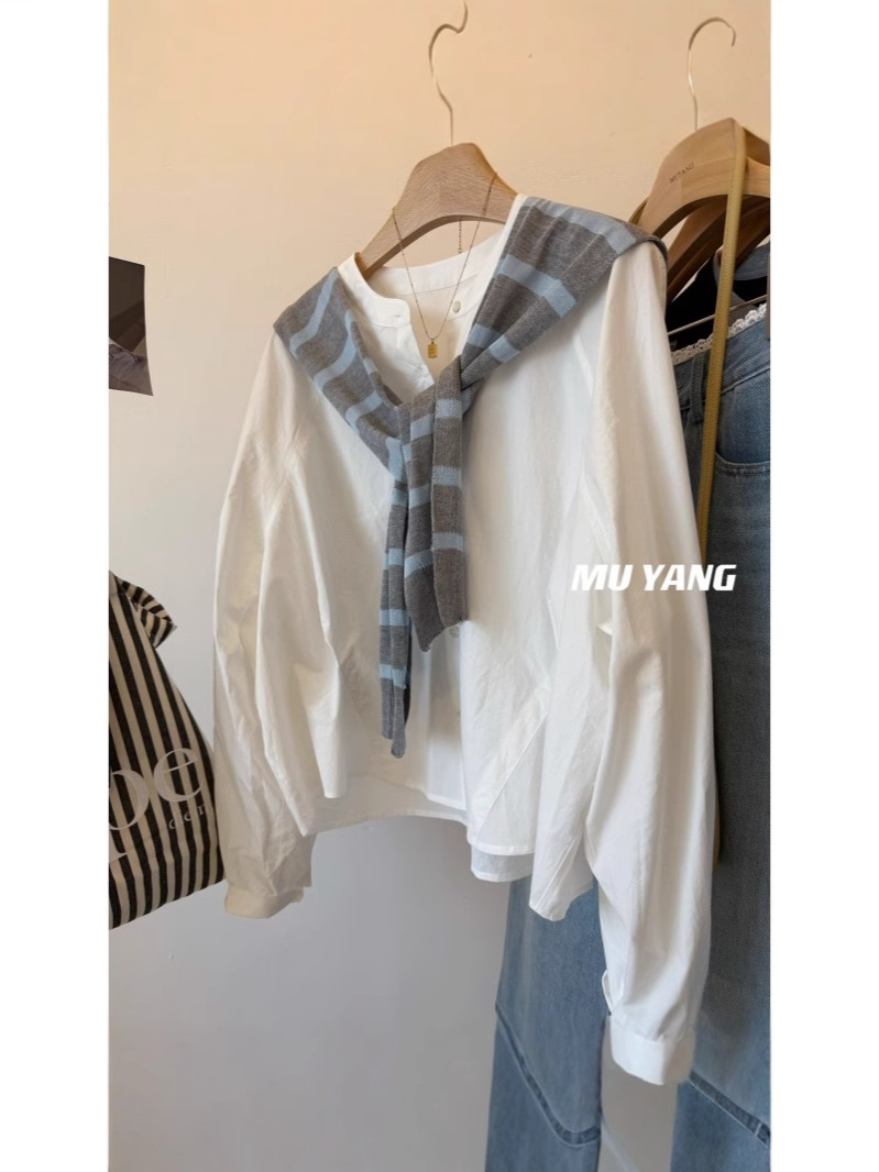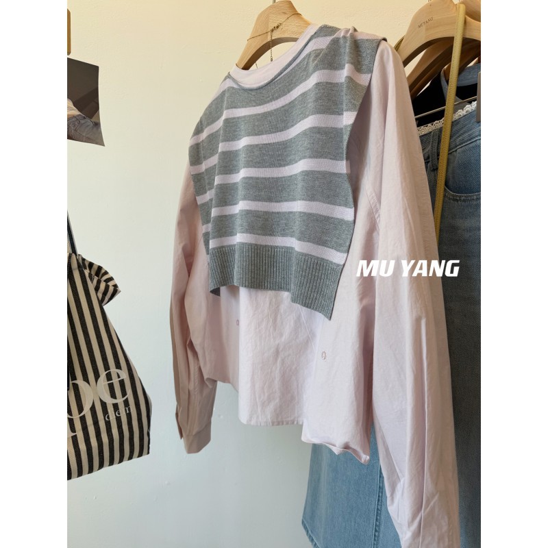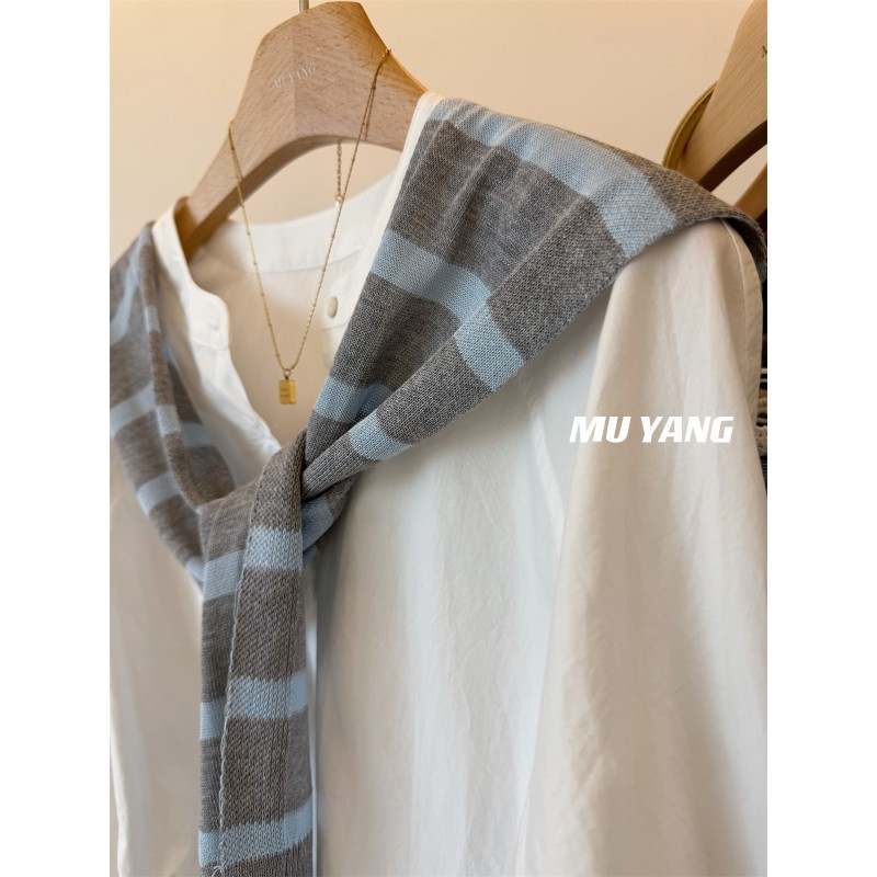 MUYANG 한국 줄무늬 대비 니트 숄 크루 넥 긴 소매 디자인 센스 셔츠