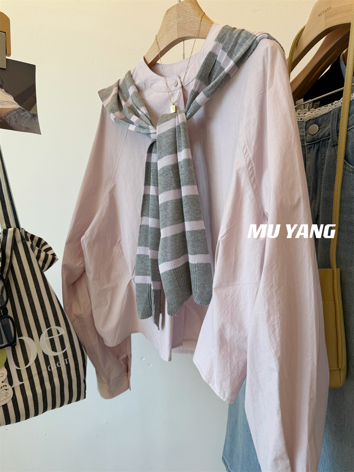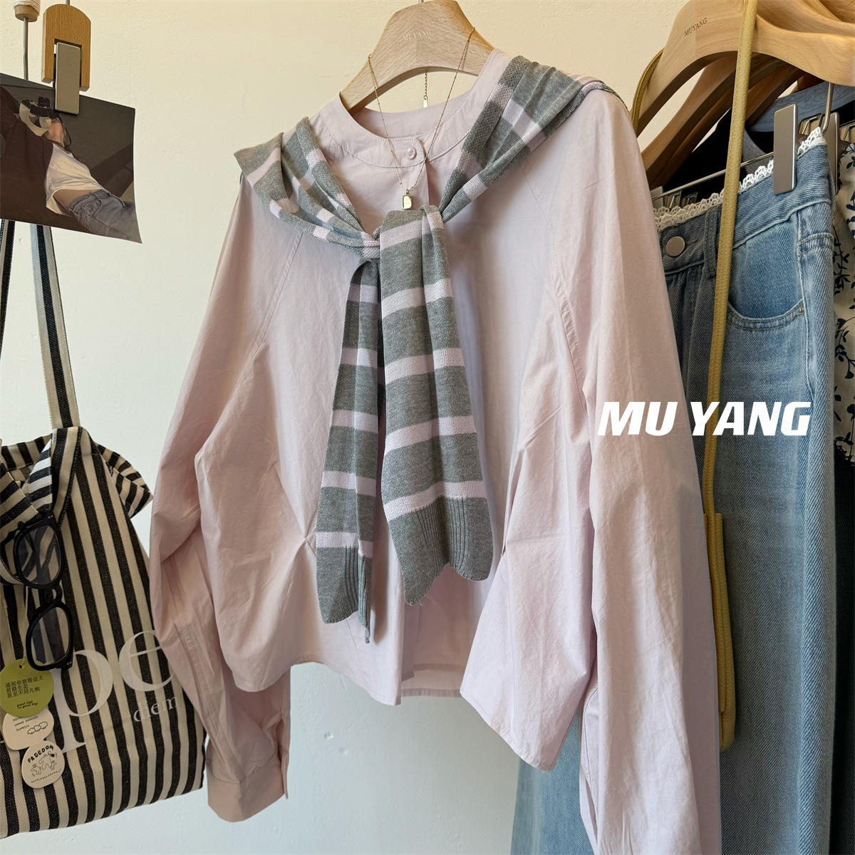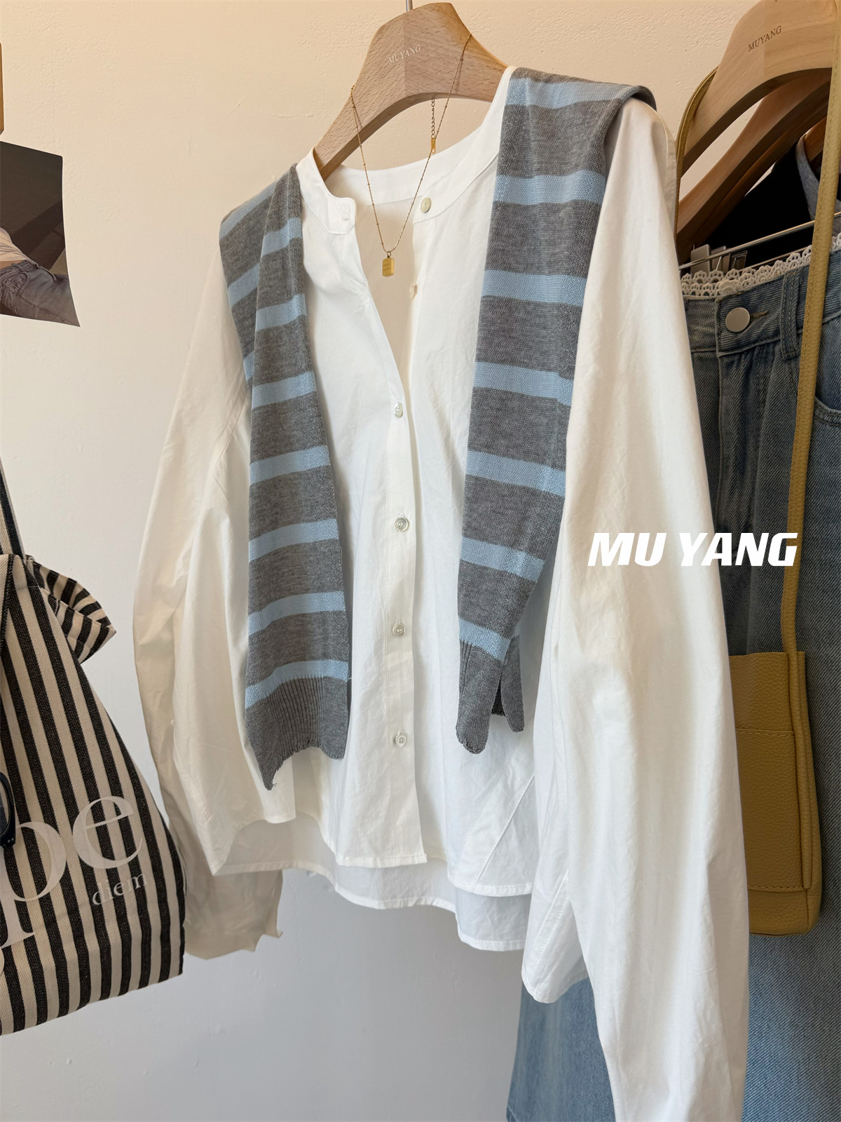 MUYANG 한국 줄무늬 대비 니트 숄 크루 넥 긴 소매 디자인 센스 셔츠스토어 가기