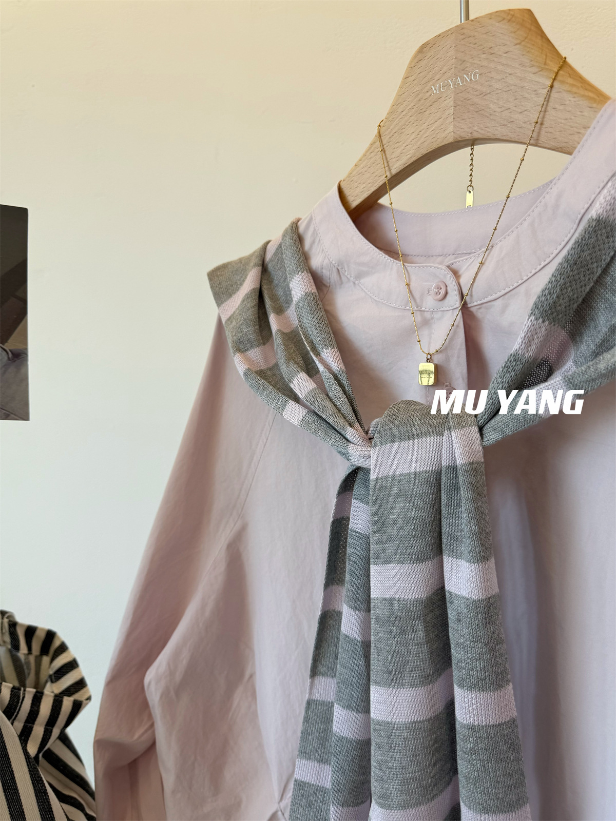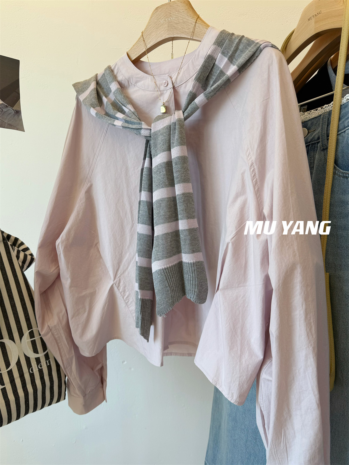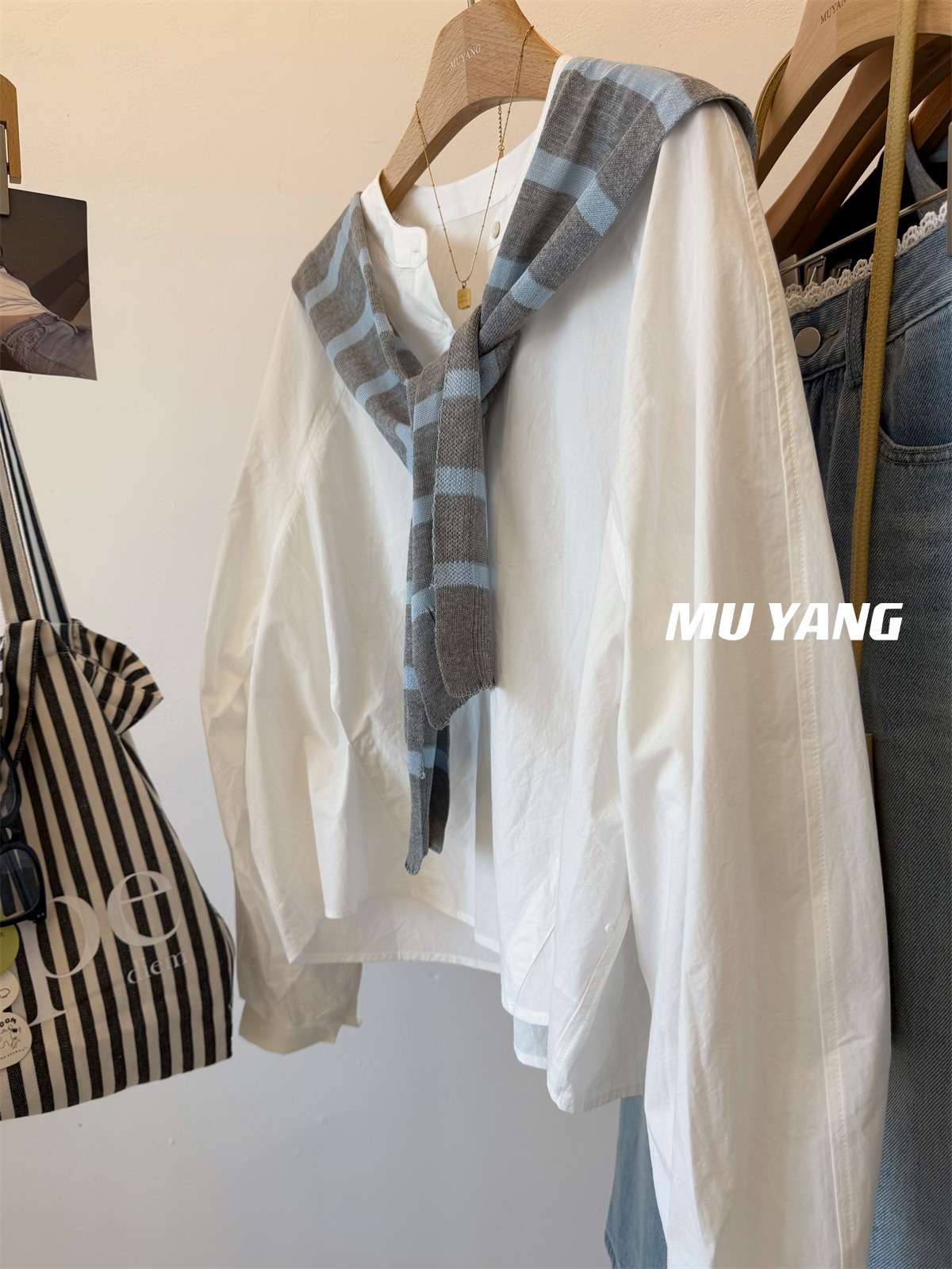 MUYANG 한국 줄무늬 대비 니트 숄 크루 넥 긴 소매 디자인 센스 셔츠스토어 가기