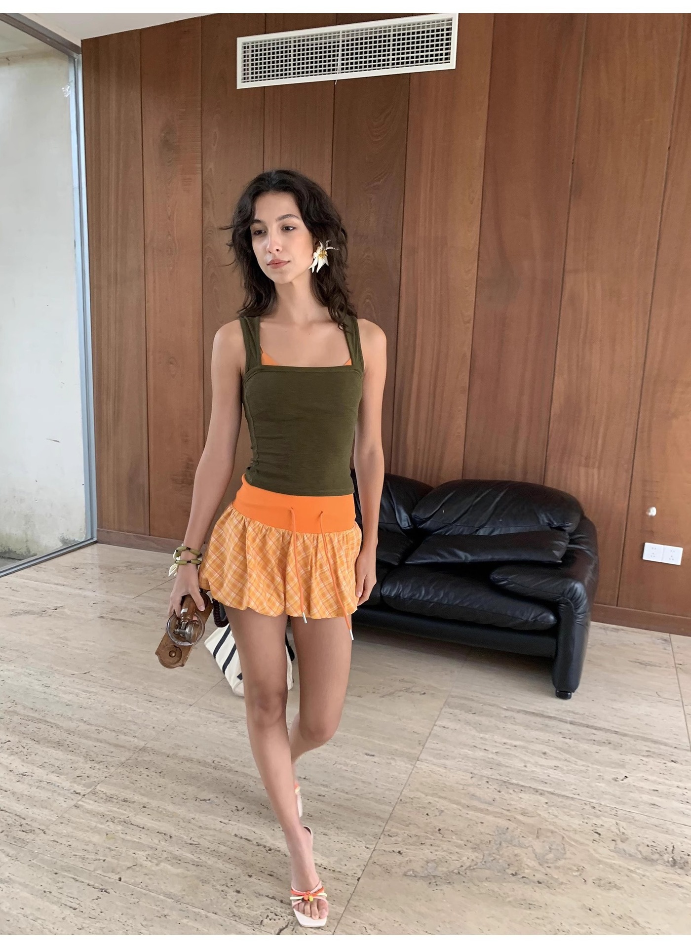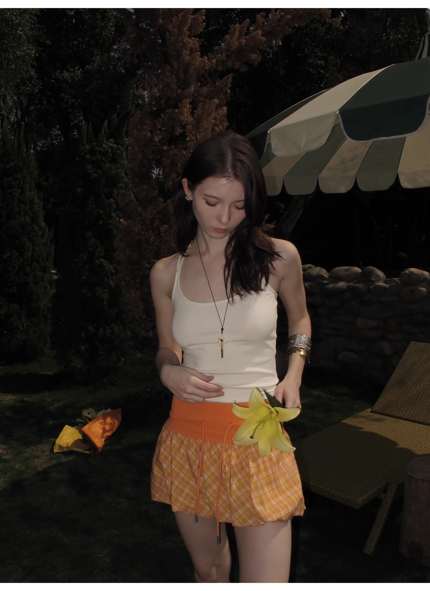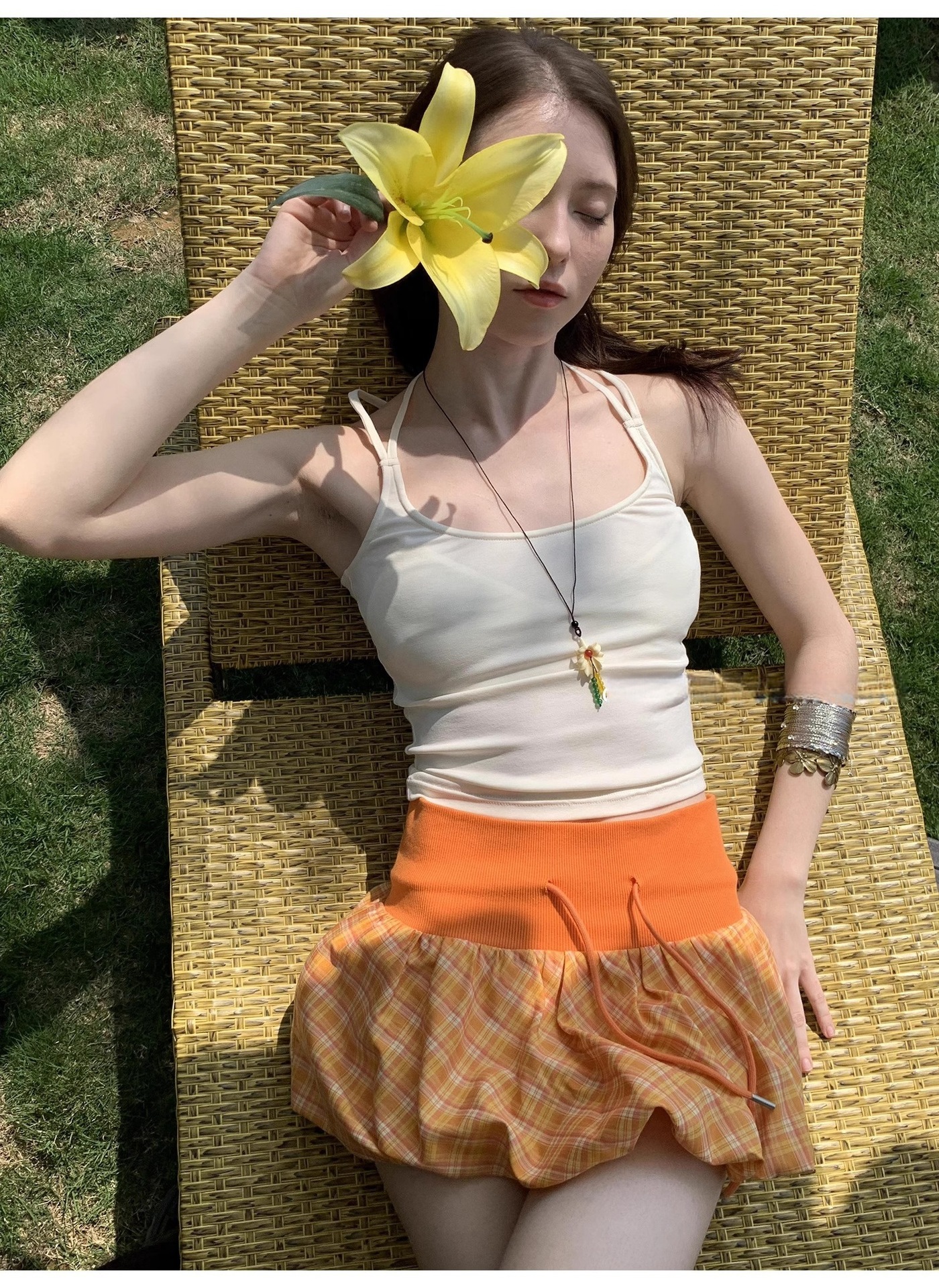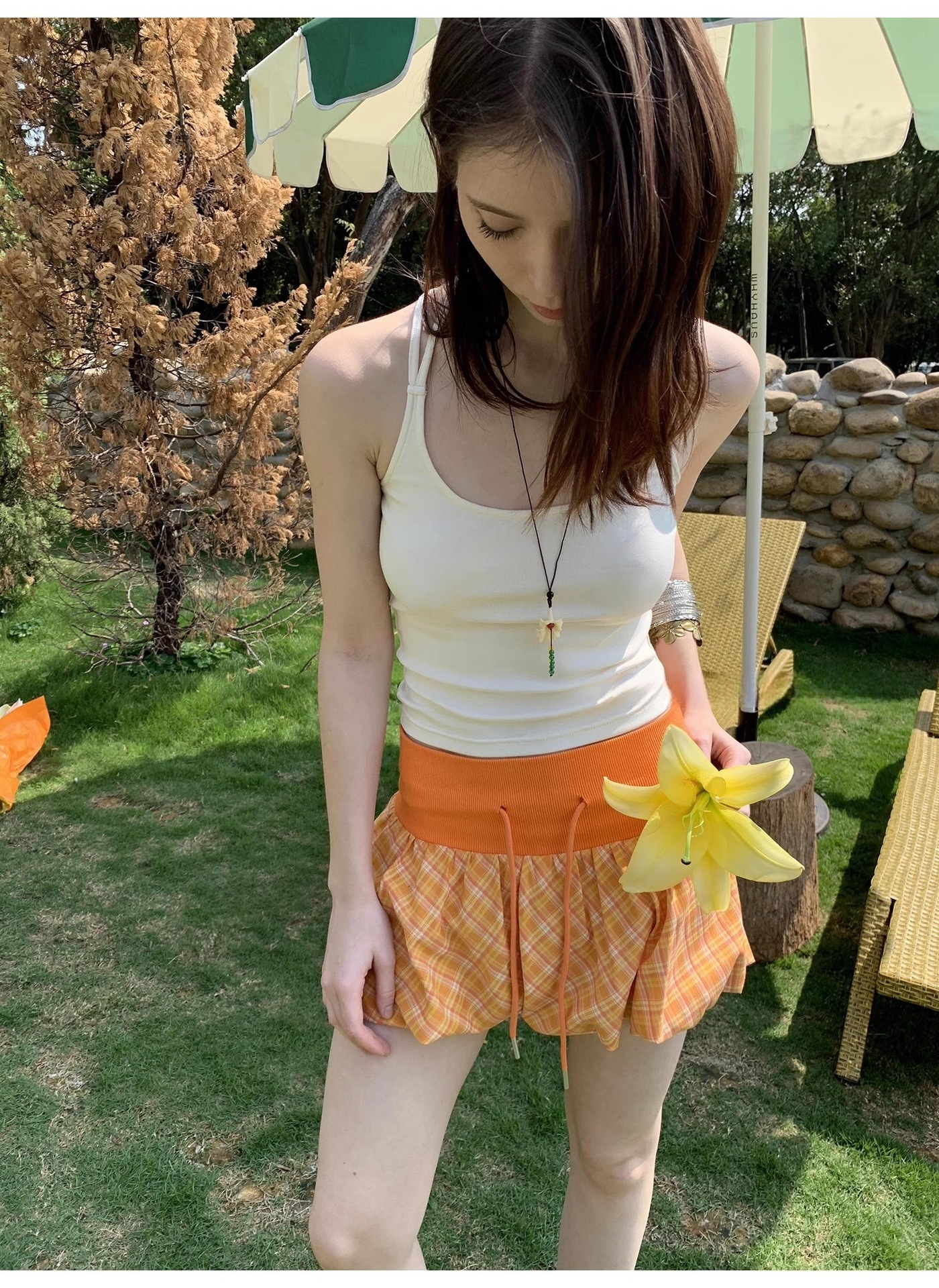 [재고] 2025 년 여름 도파민 달콤한 향신료 오렌지 격자 무늬 버드 스커트 여자 스포츠 스트랩 스커트