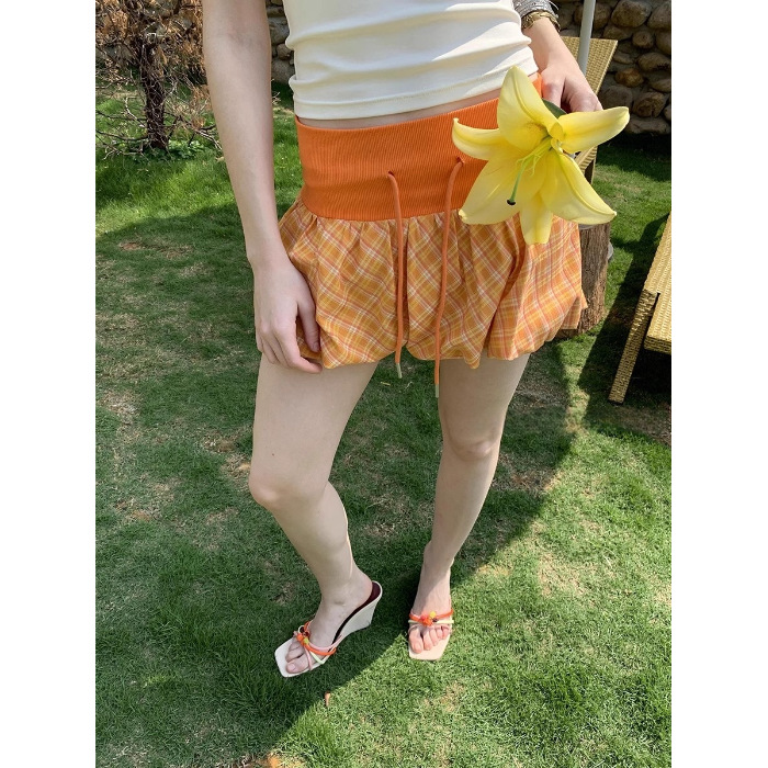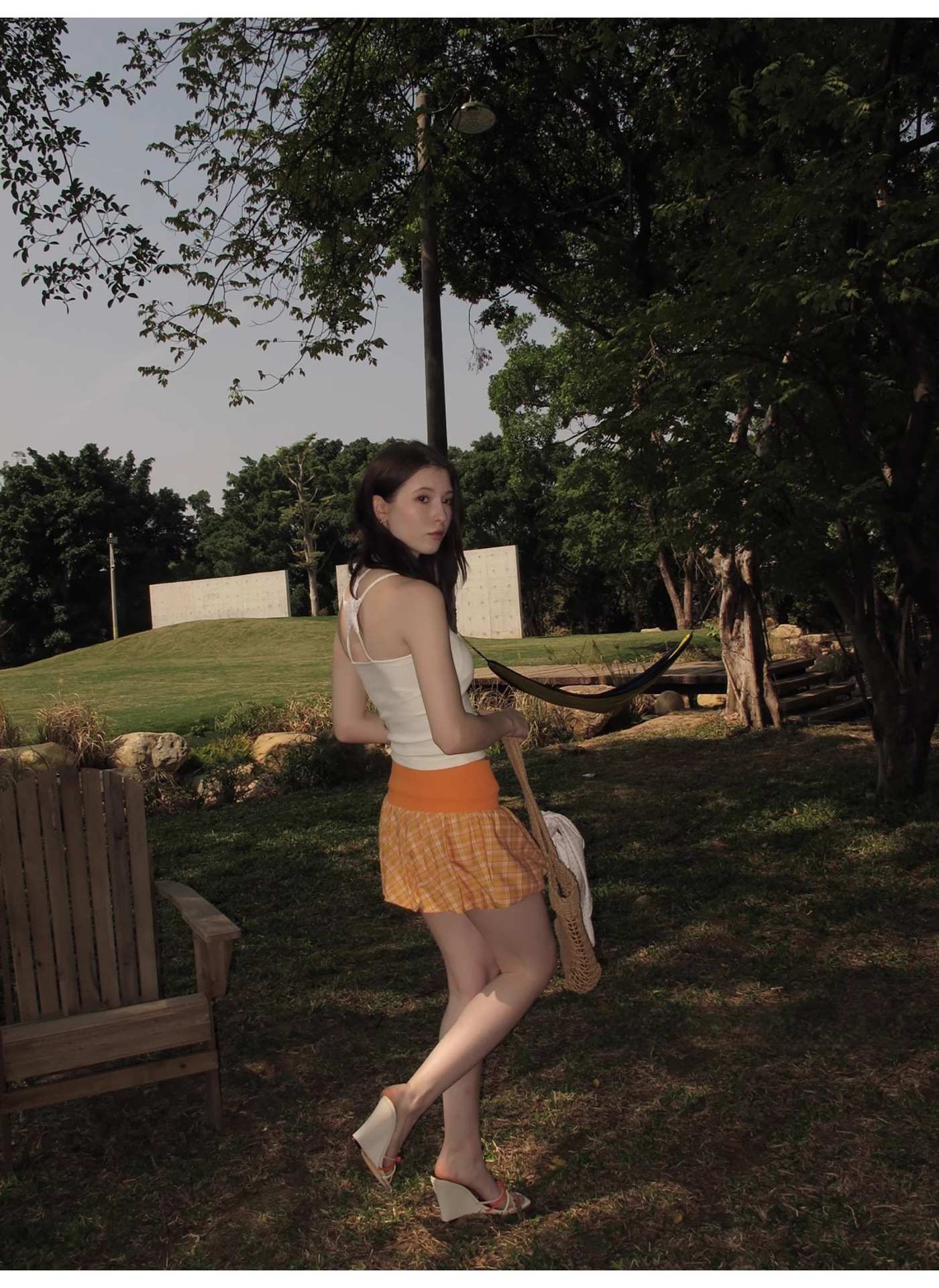 [재고] 2025 년 여름 도파민 달콤한 향신료 오렌지 격자 무늬 버드 스커트 여자 스포츠 스트랩 스커트스토어 가기