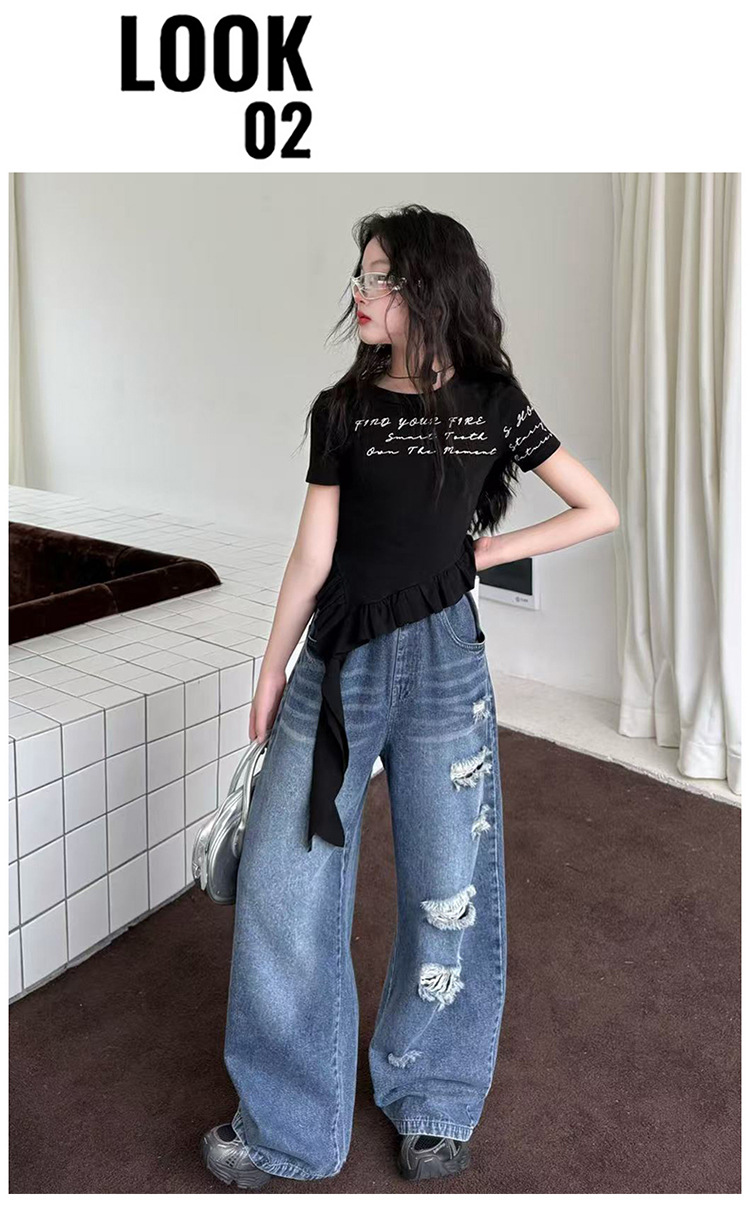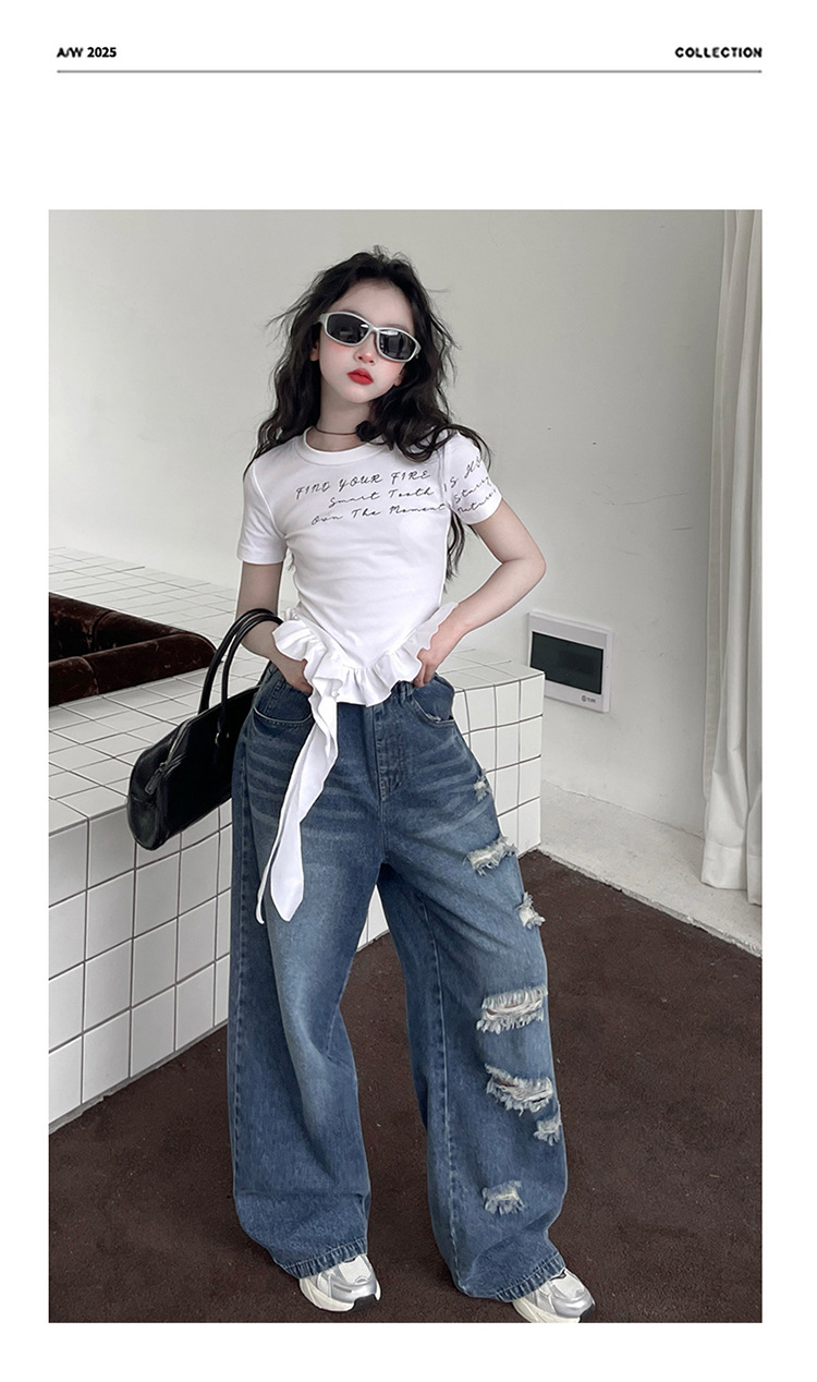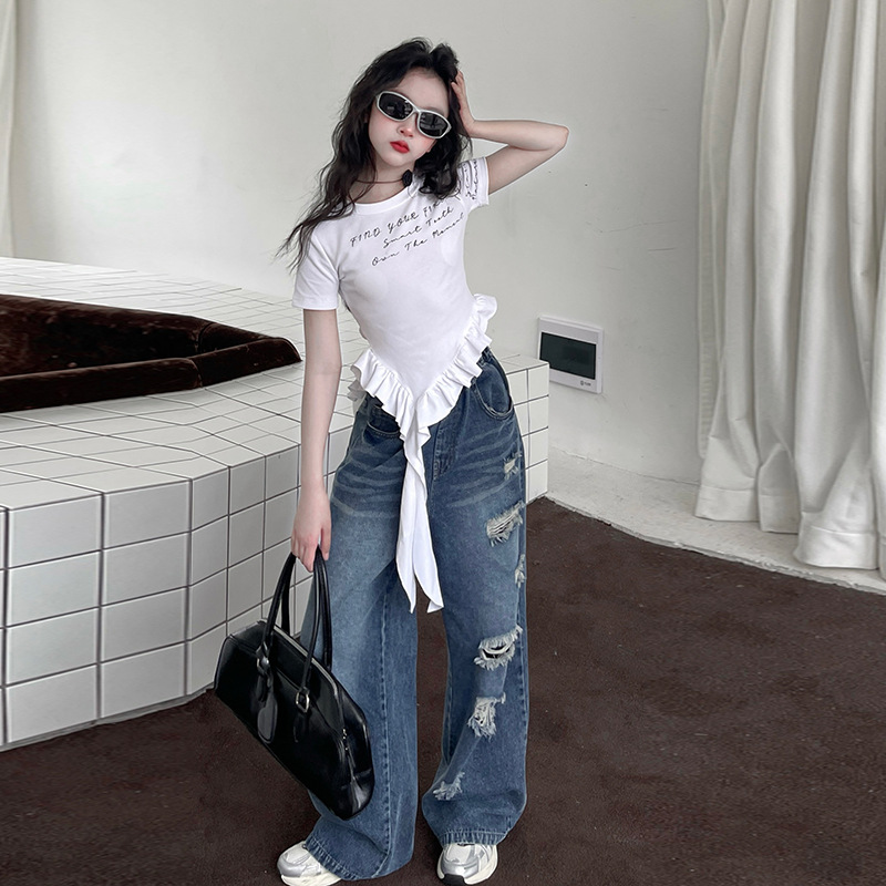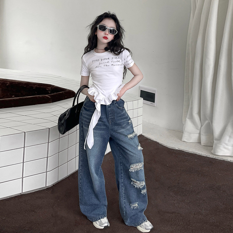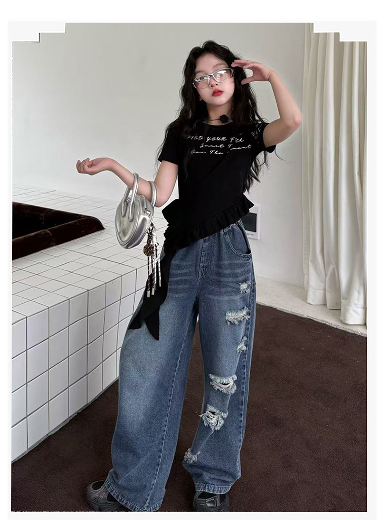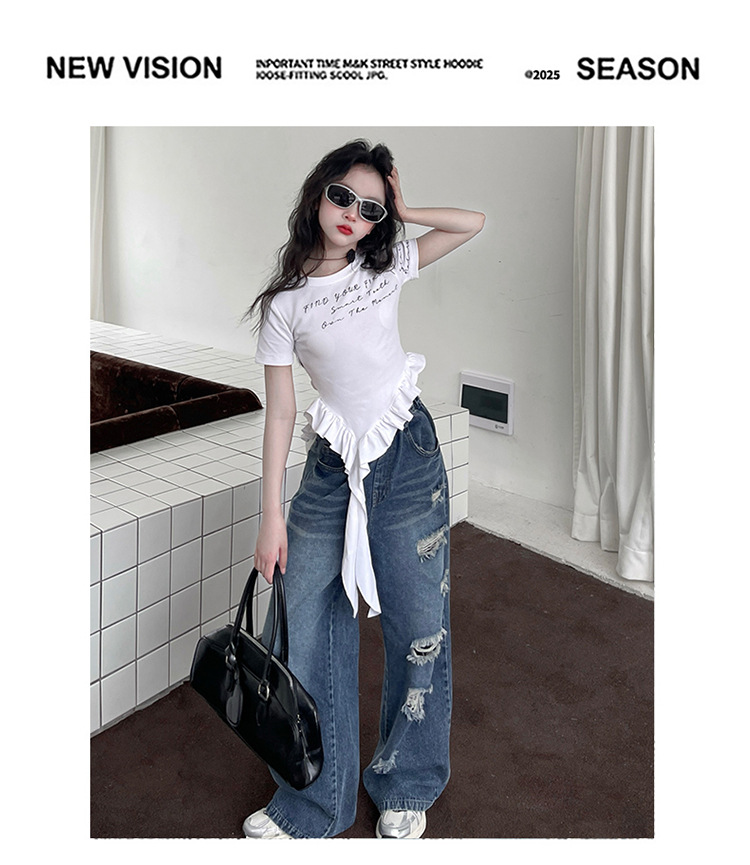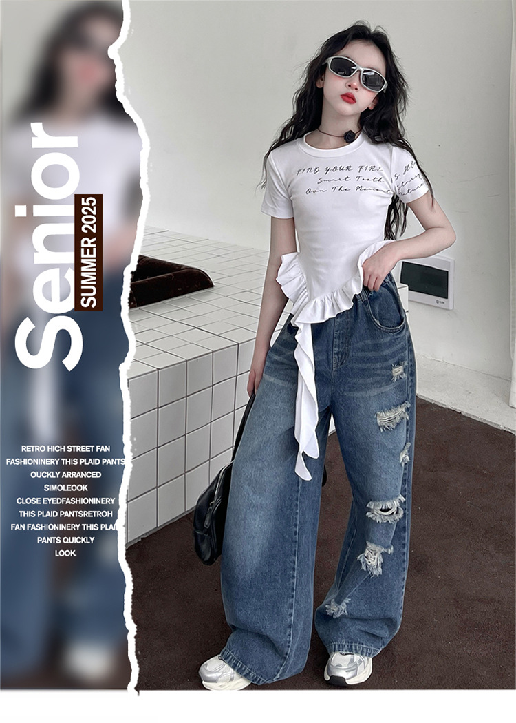 오렌지 타이거 국경 2025 소녀 여름 새로운 불규칙한 레이스 인쇄 탑 찢어진 청바지 한국 스타일