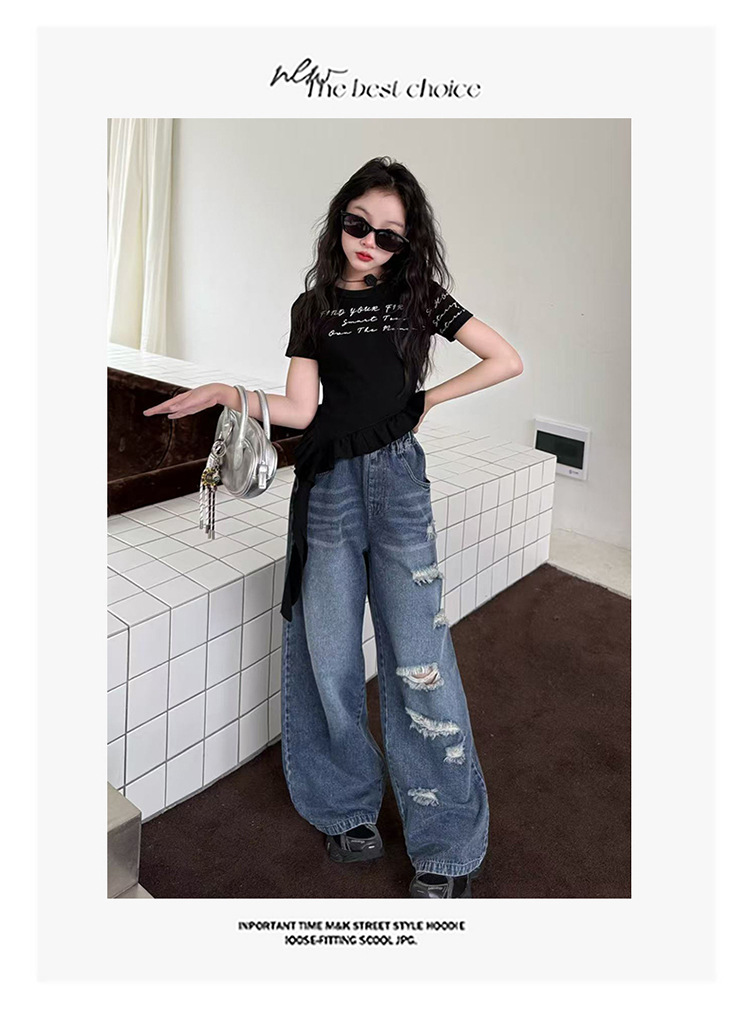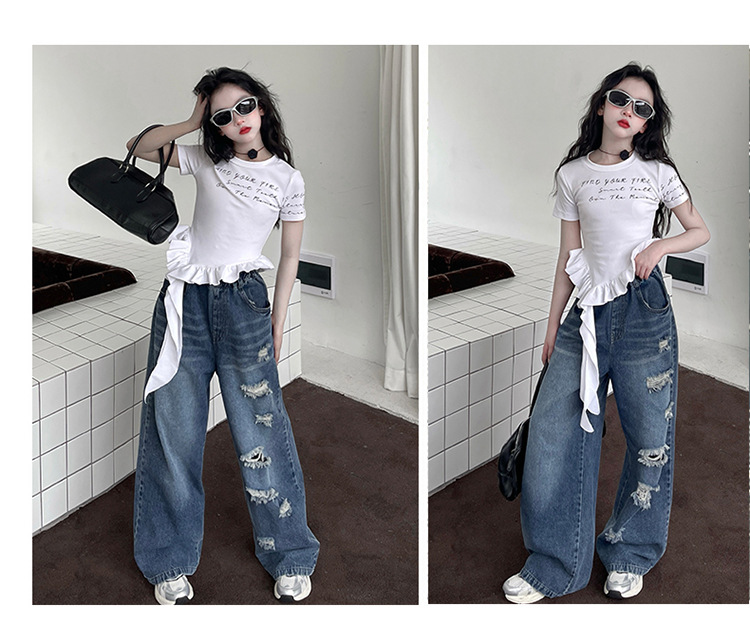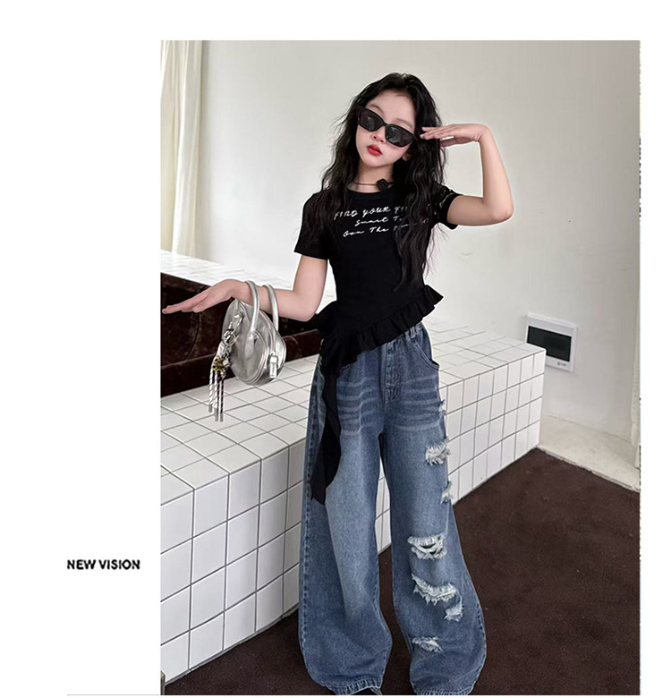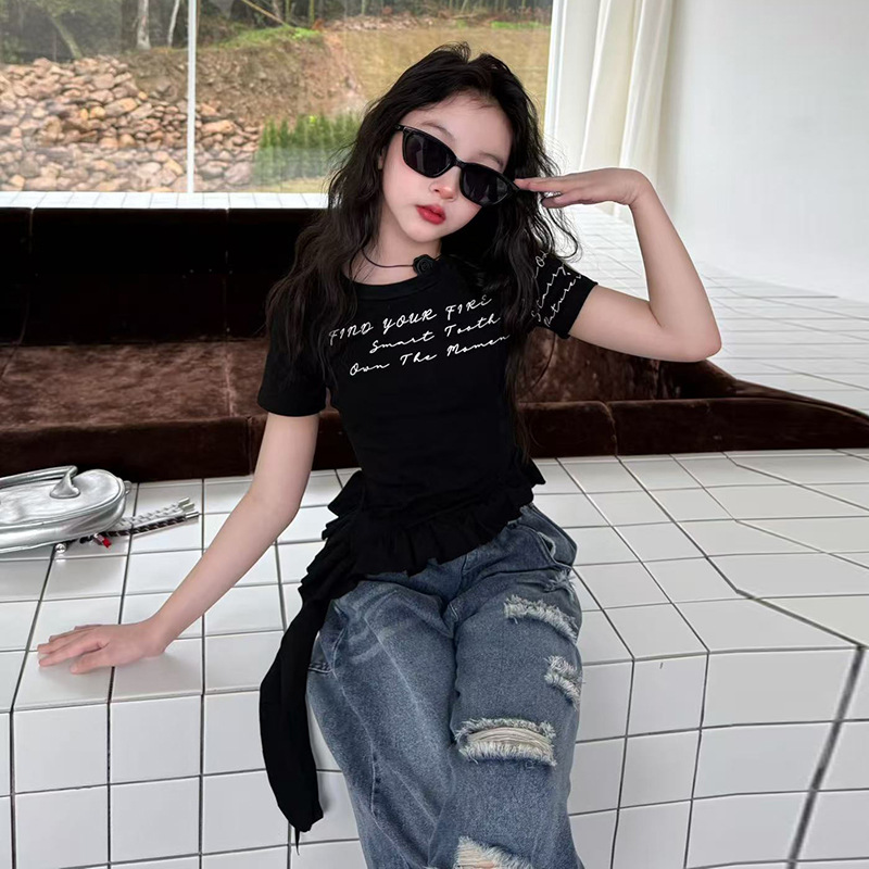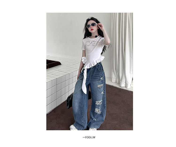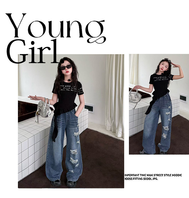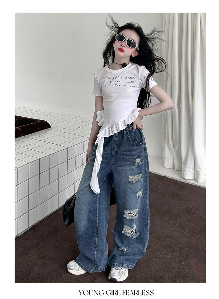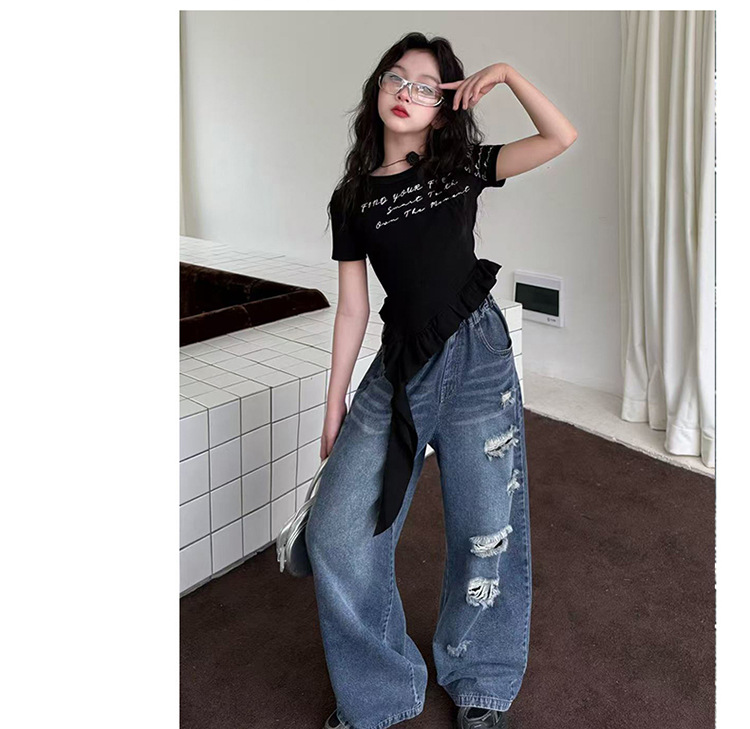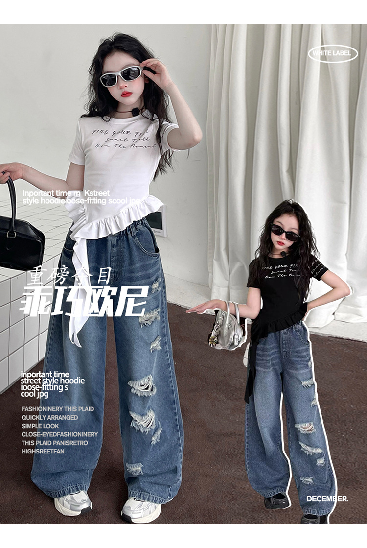 오렌지 타이거 국경 2025 소녀 여름 새로운 불규칙한 레이스 인쇄 탑 찢어진 청바지 한국 스타일