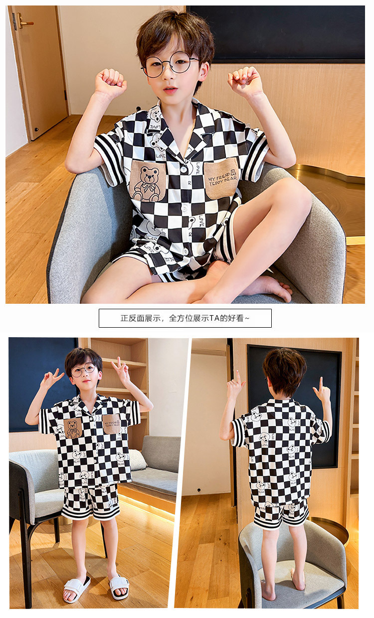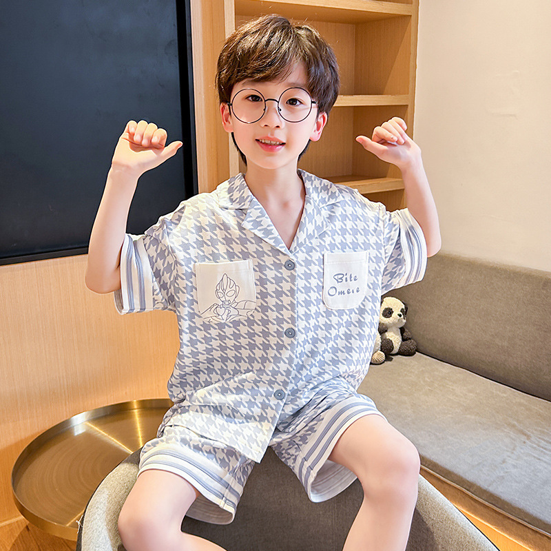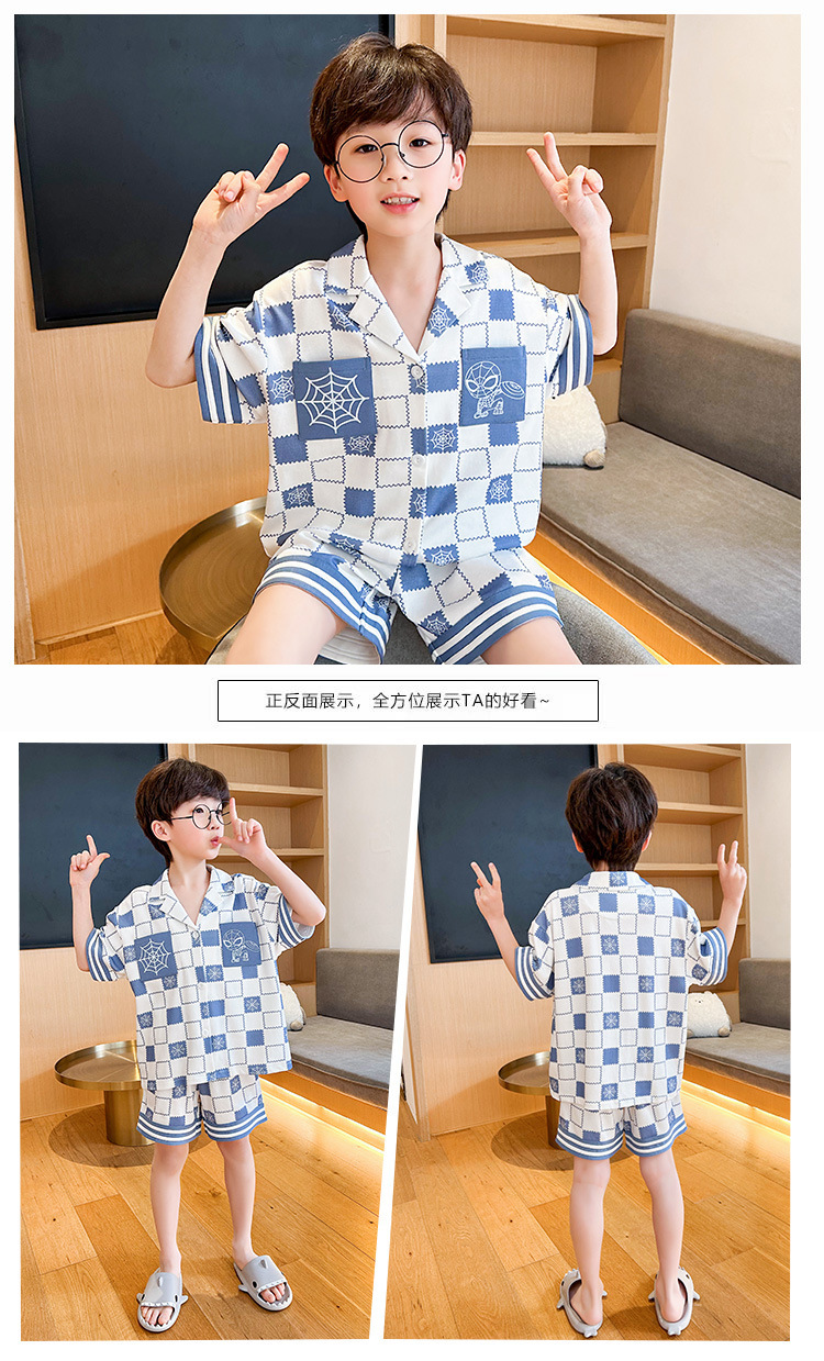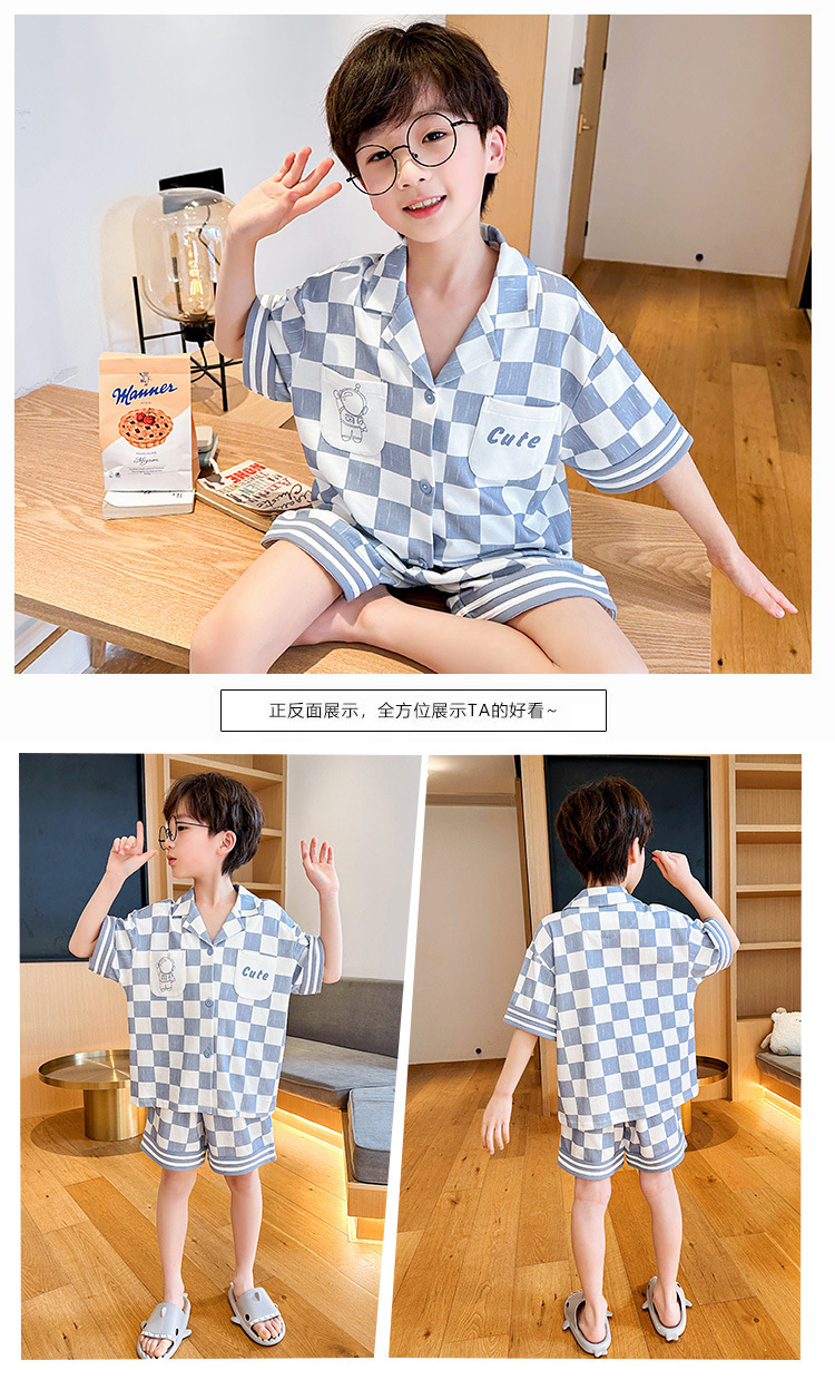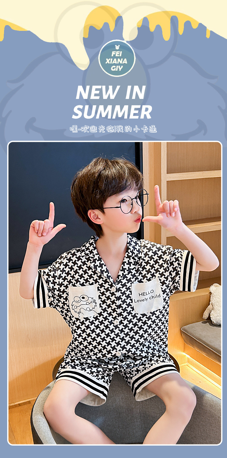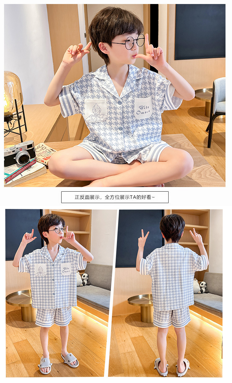 여름 라펠 남아용 반팔 잠옷, 아동용 가정복, 루즈하고 캐주얼한 큰 아동용 잠옷, 아동용 에어컨 의류 세트스토어 가기