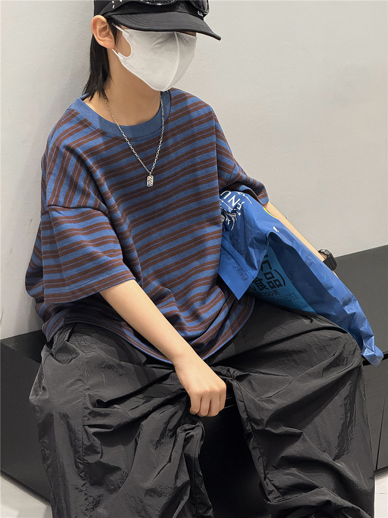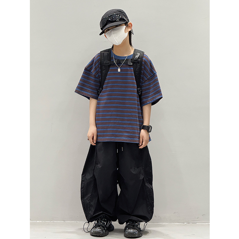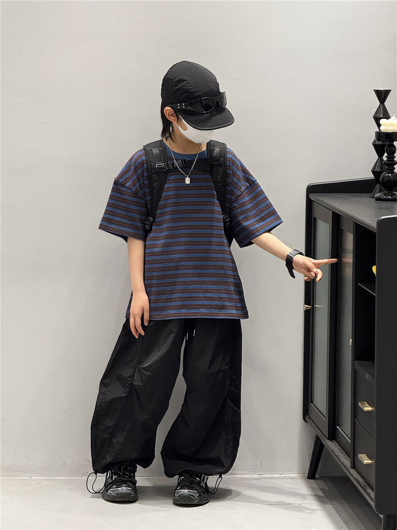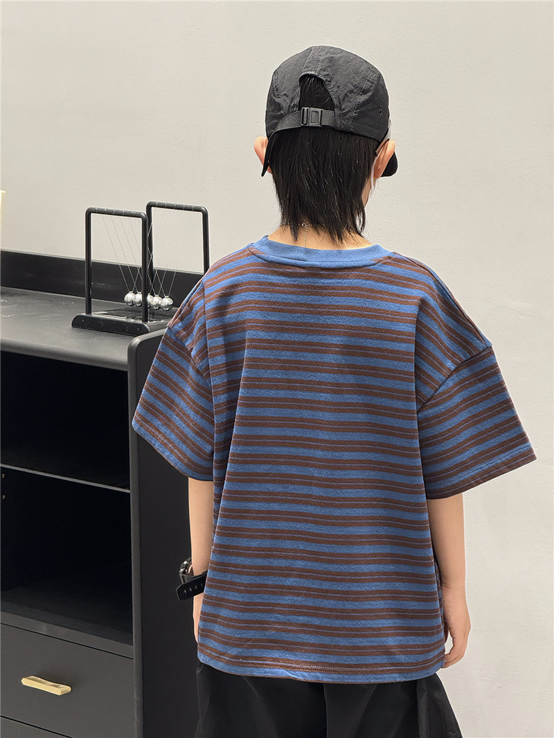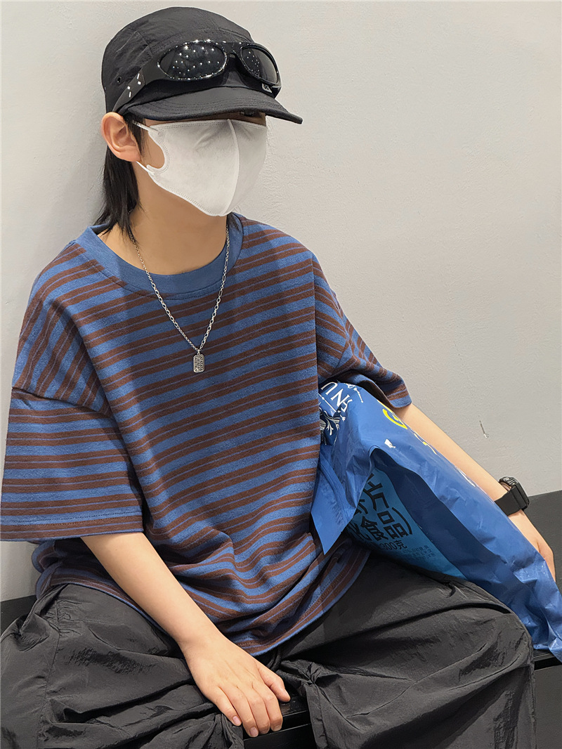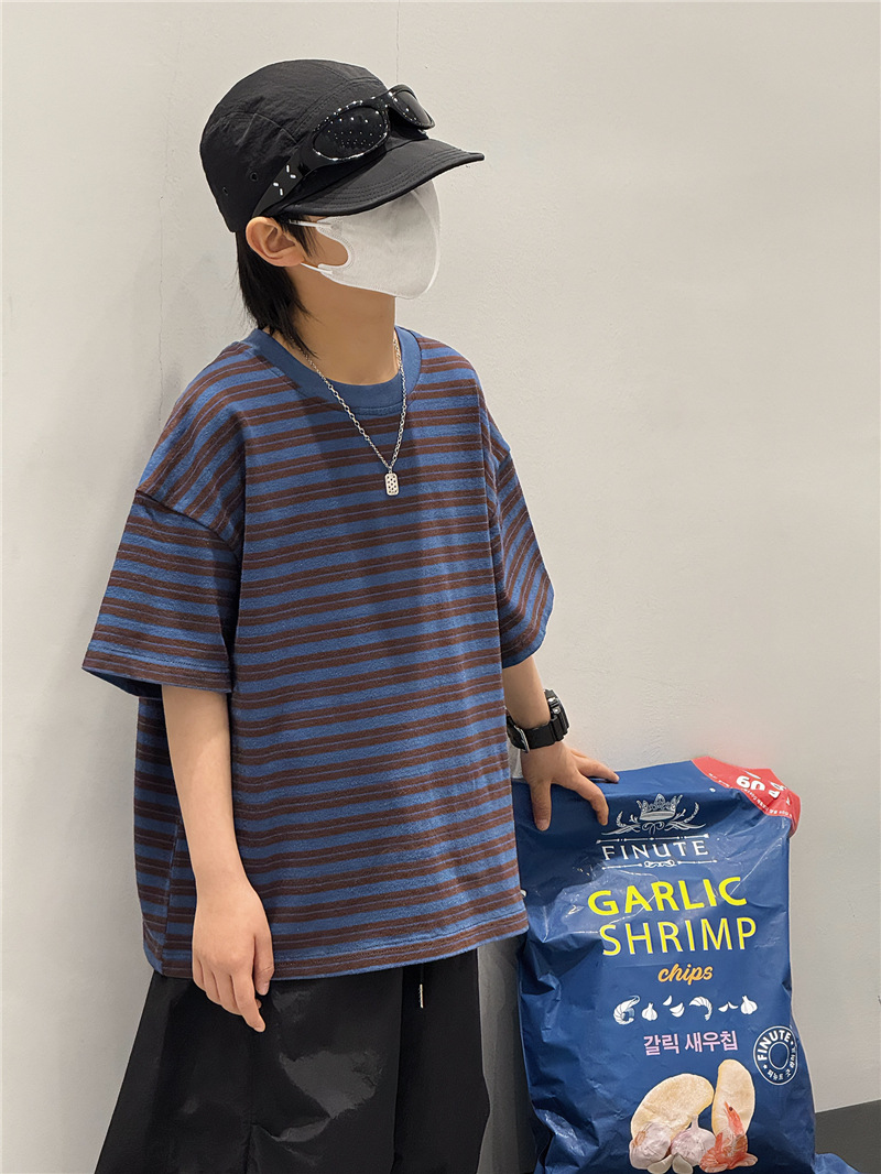 어린이 반팔 티셔츠 여름 2025 년 새 여름 얇은 잘 생긴 소년 여름 어린이 느슨한 줄무늬 탑스토어 가기