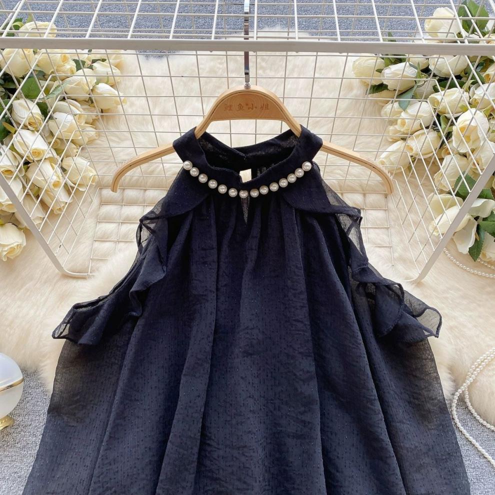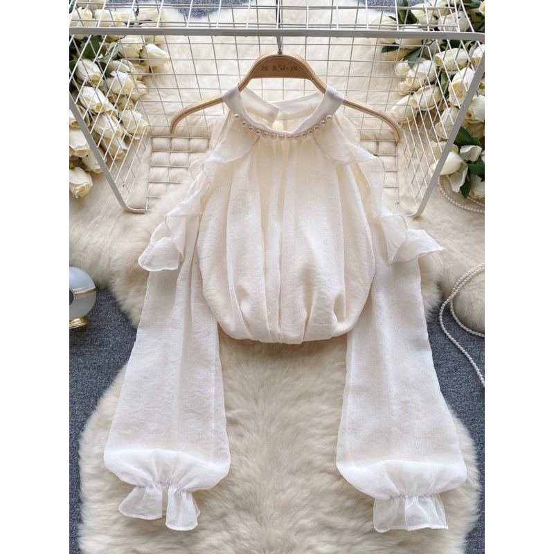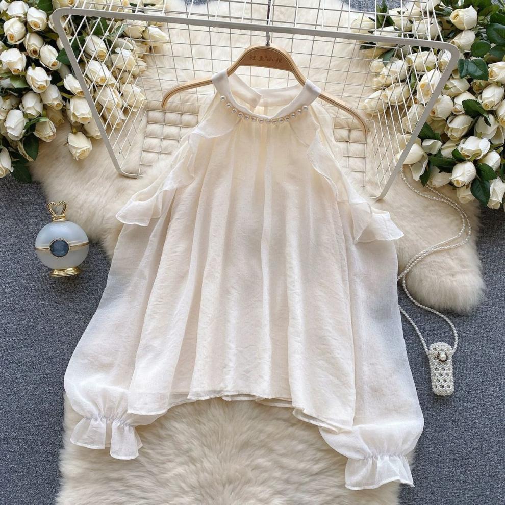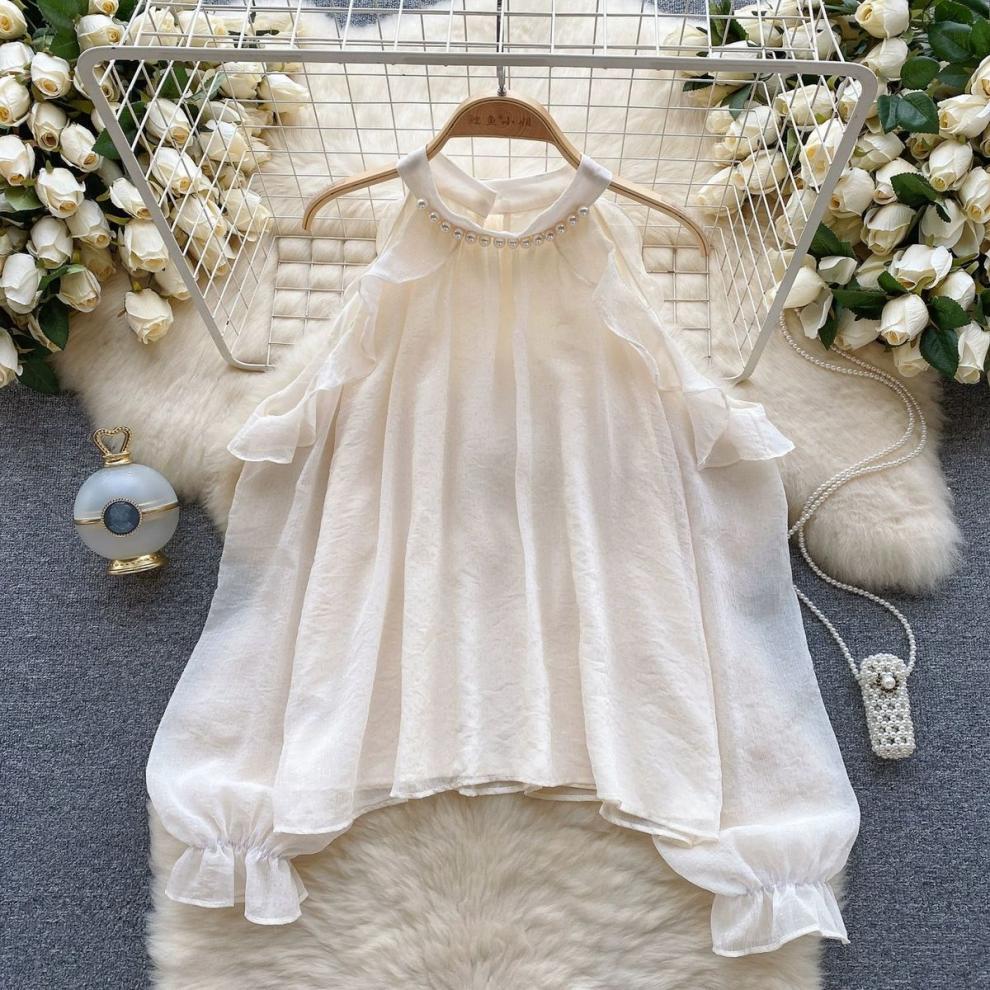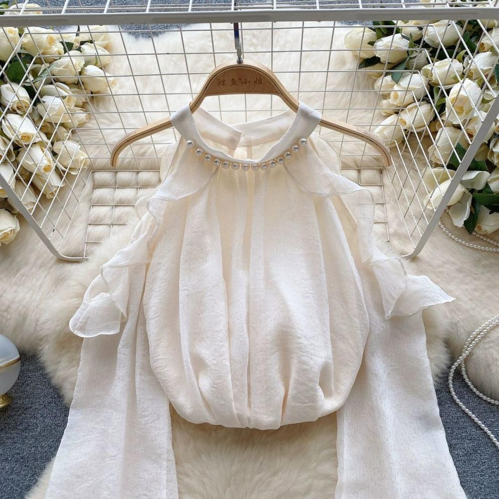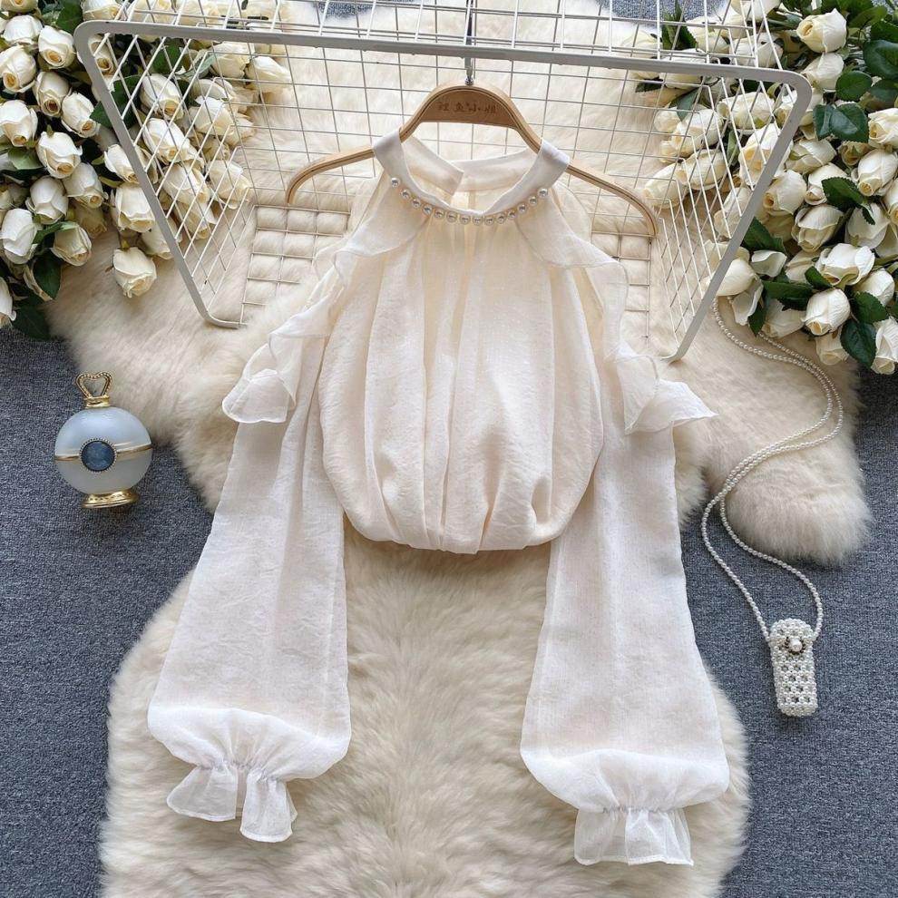 여성을 위한 젠틀 스타일 쉬폰 탑, 긴팔, 속이 빈 오프숄더 비즈 홀터넥 셔츠, 2025 봄 신상품스토어 가기