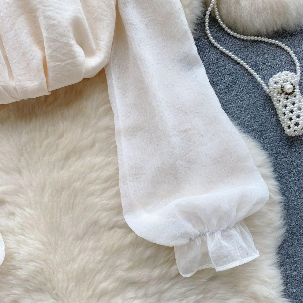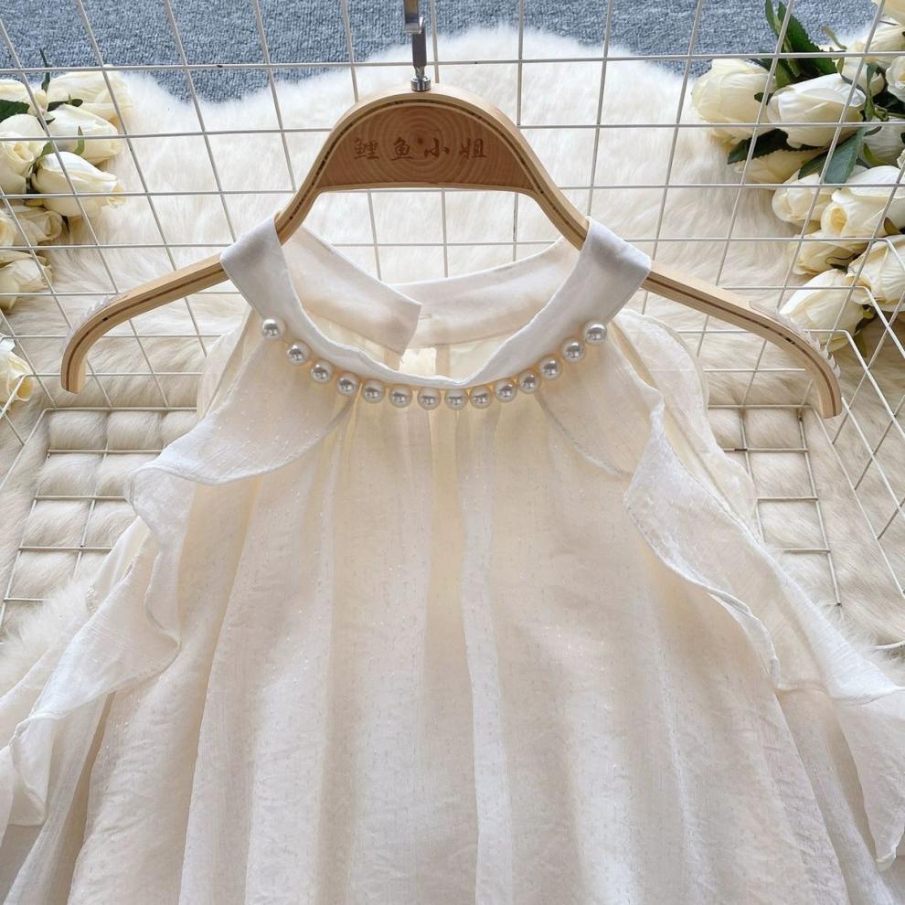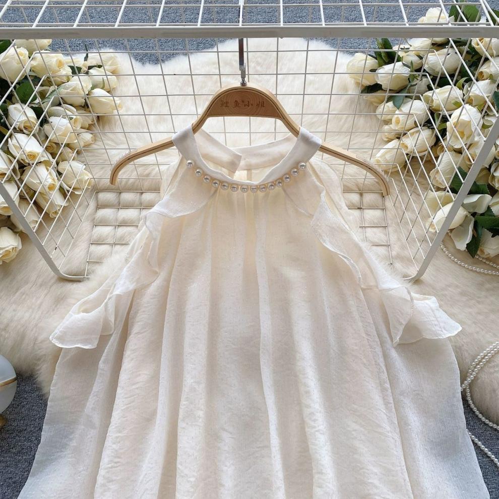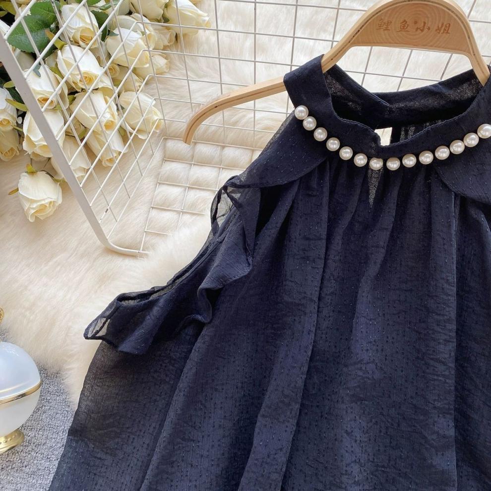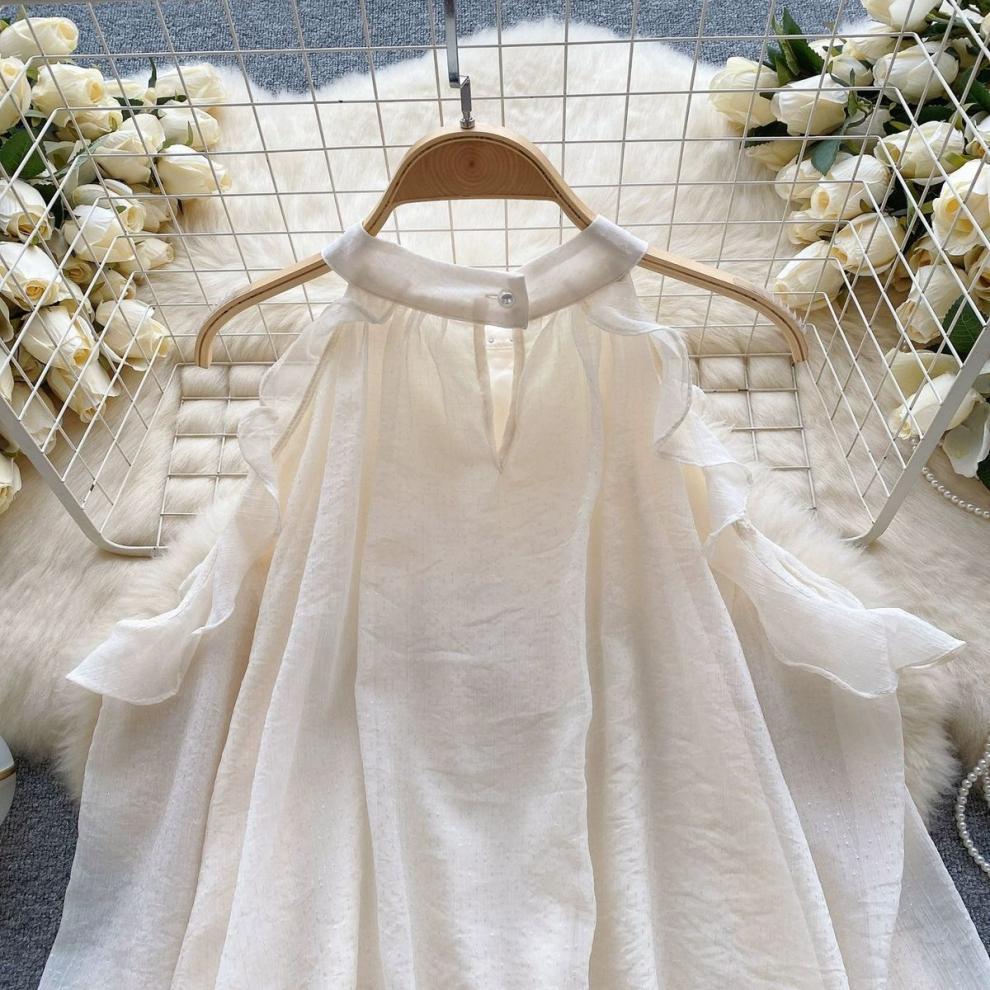 여성을 위한 젠틀 스타일 쉬폰 탑, 긴팔, 속이 빈 오프숄더 비즈 홀터넥 셔츠, 2025 봄 신상품스토어 가기