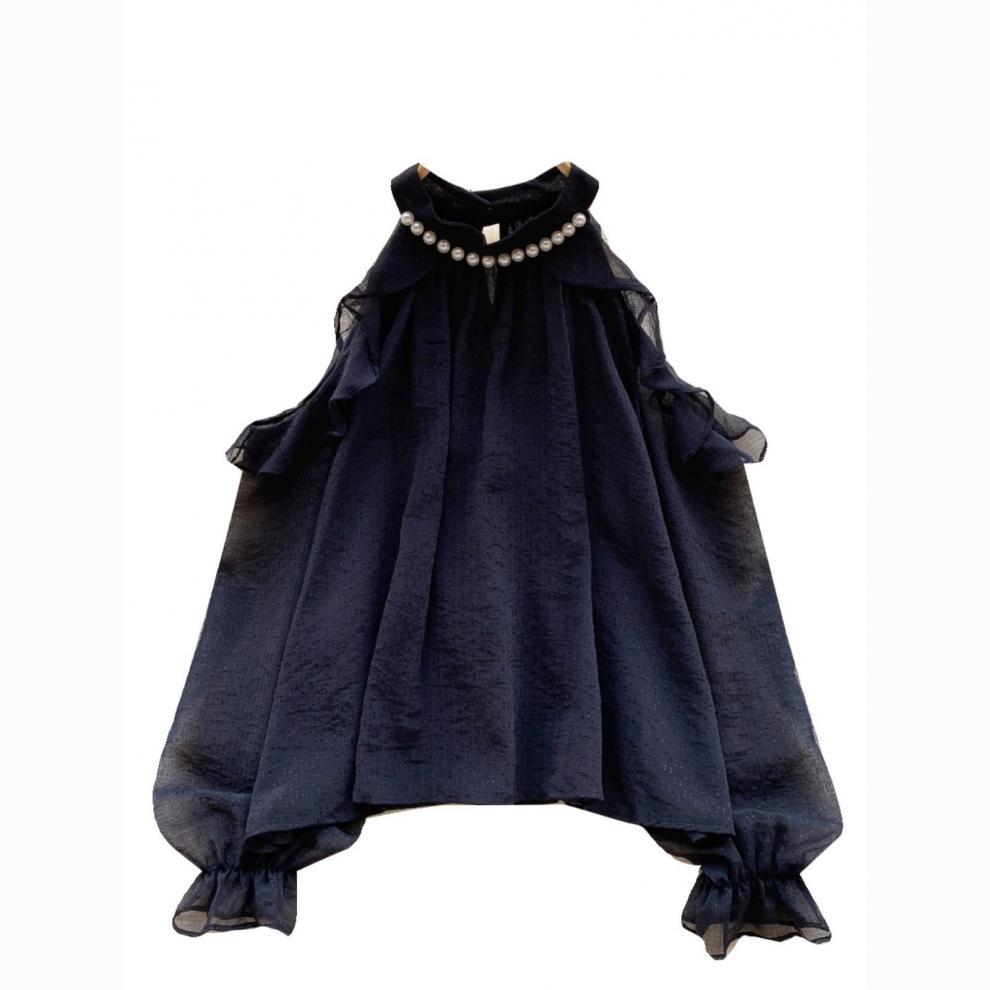 여성을 위한 젠틀 스타일 쉬폰 탑, 긴팔, 속이 빈 오프숄더 비즈 홀터넥 셔츠, 2025 봄 신상품