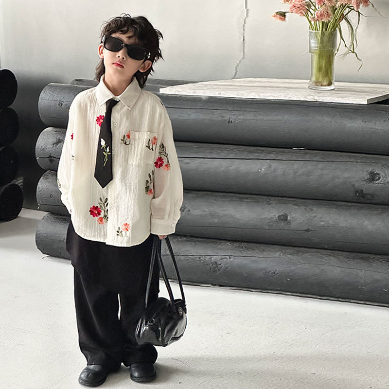 남아용 긴팔 셔츠 2025 봄 여름 신상 레트로 트렌디 아동 꽃 자수 상의 아동복 도매스토어 가기