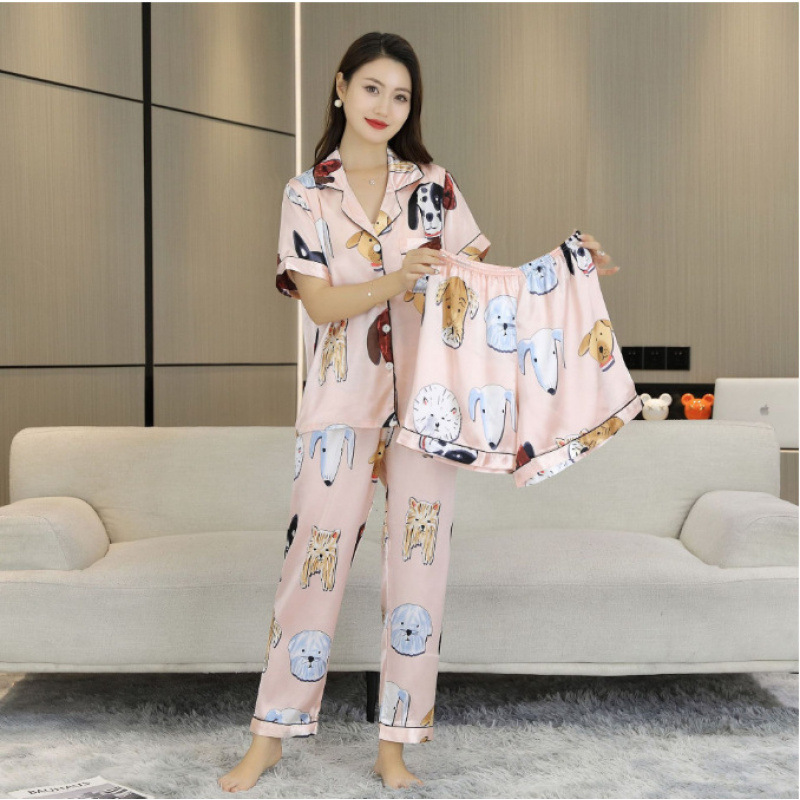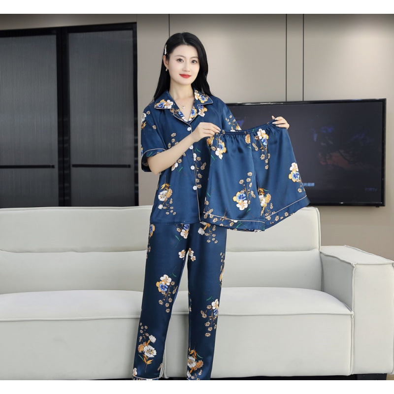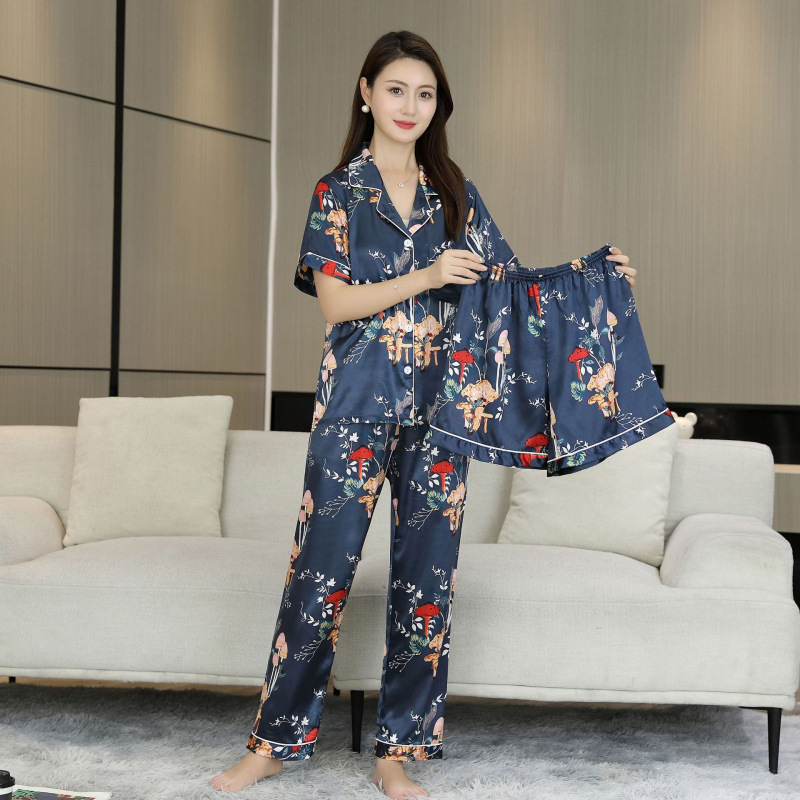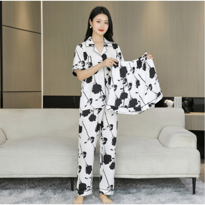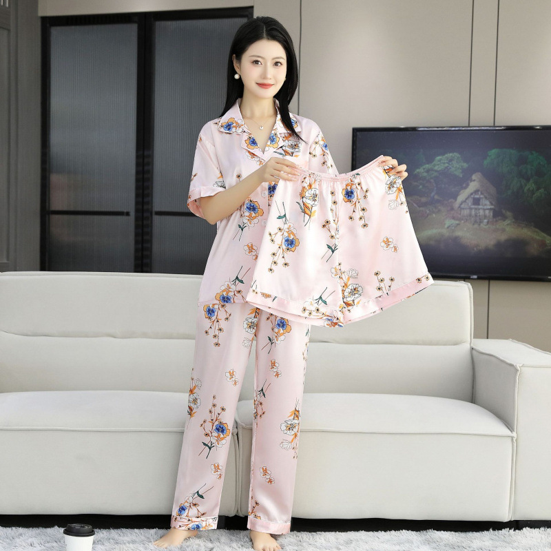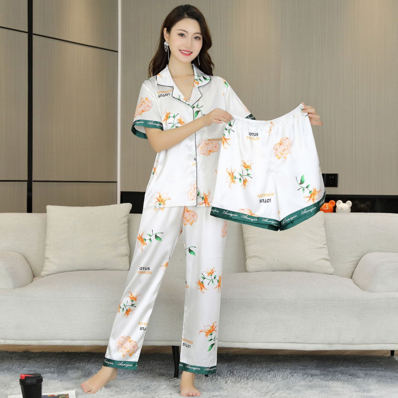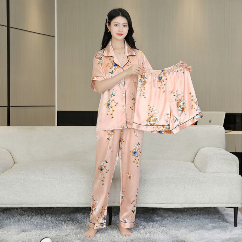 [엄격한 선택] 잠옷 여성의 여름 아이스 실크 얇은 옷깃 짧은 소매 바지 3 피스 세트 홈 외부에서 착용 할 수 있습니다 하이 엔드 감각스토어 가기